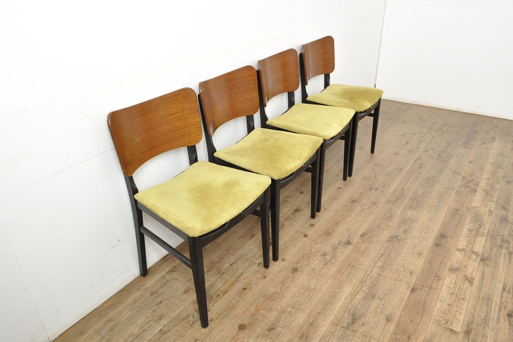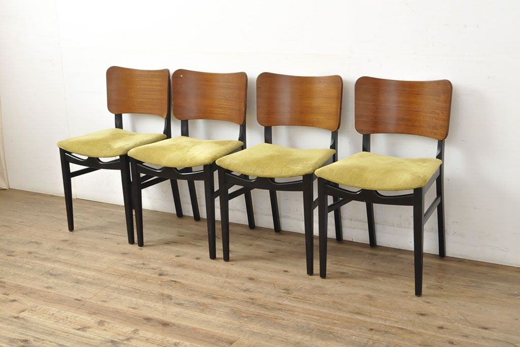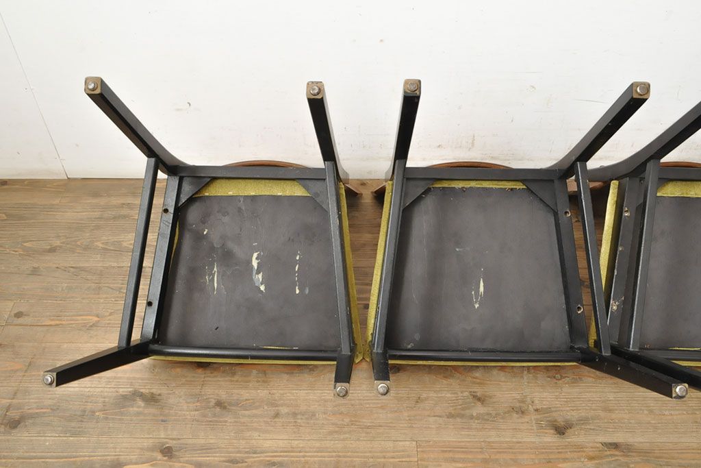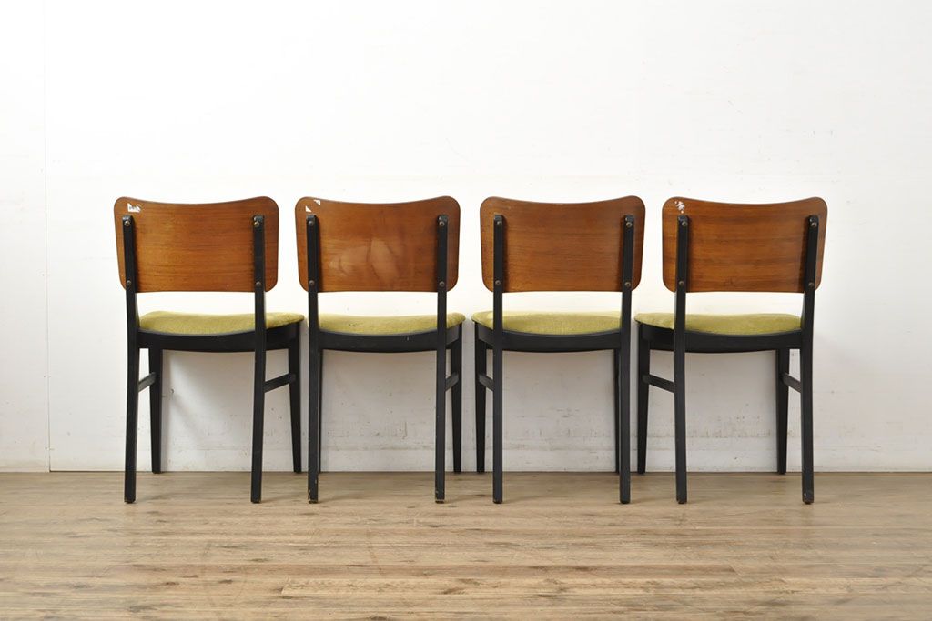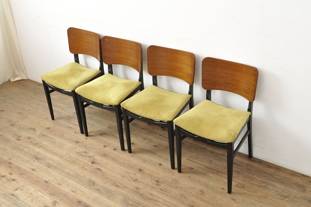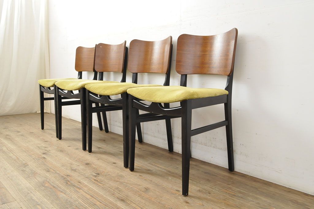 状態が気になる方には現状販売はおすすめできませんので、慎重なご検討をお願いいたします。北欧ビンテージ スタイリッシュなデザインが魅力的なダイニングチェア4脚セット(イス、椅子、ヴィンテージ)(R-052639)です。