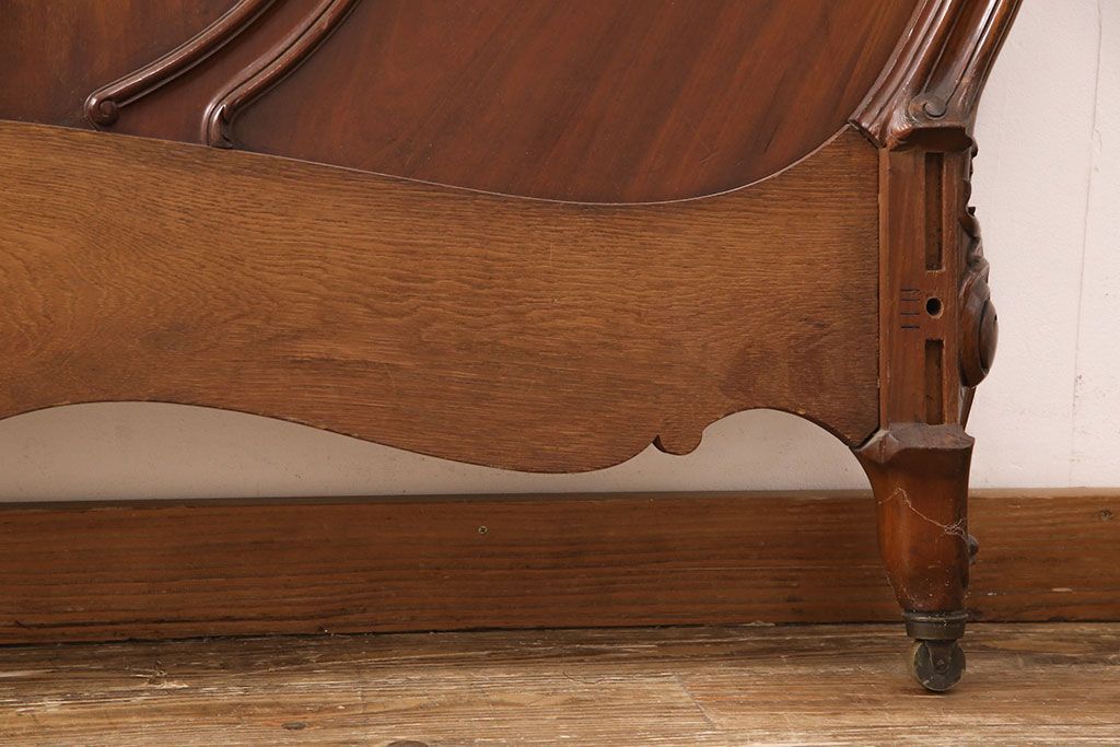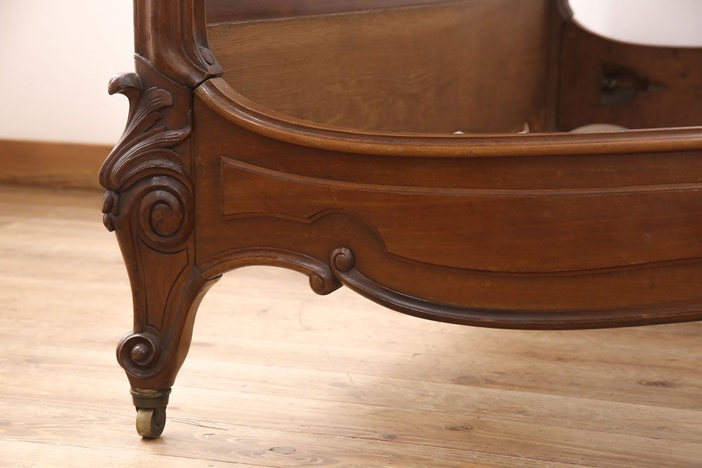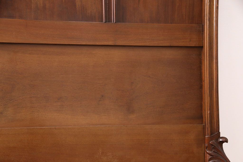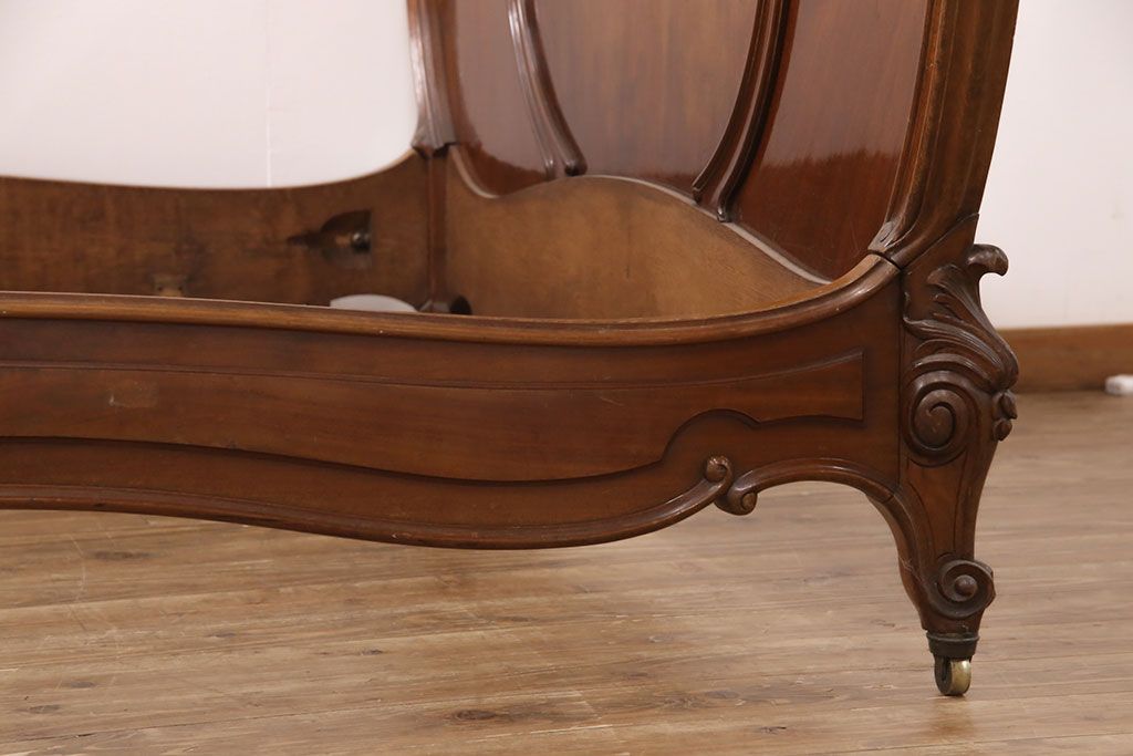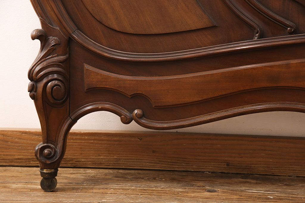 アンティーク家具 最高級 フランス マホガニー材 落ち着きのある色合いと素晴らしい彫刻がクラシカルな雰囲気を高めるベッドフレーム(セミダブル)(R-052735)