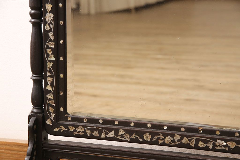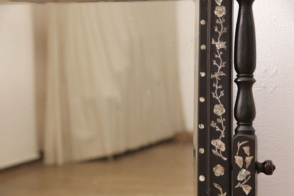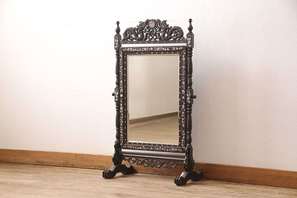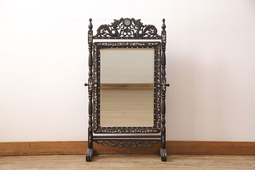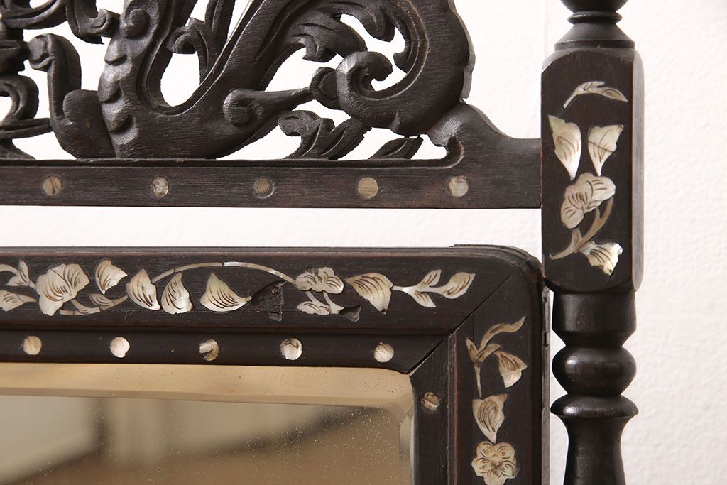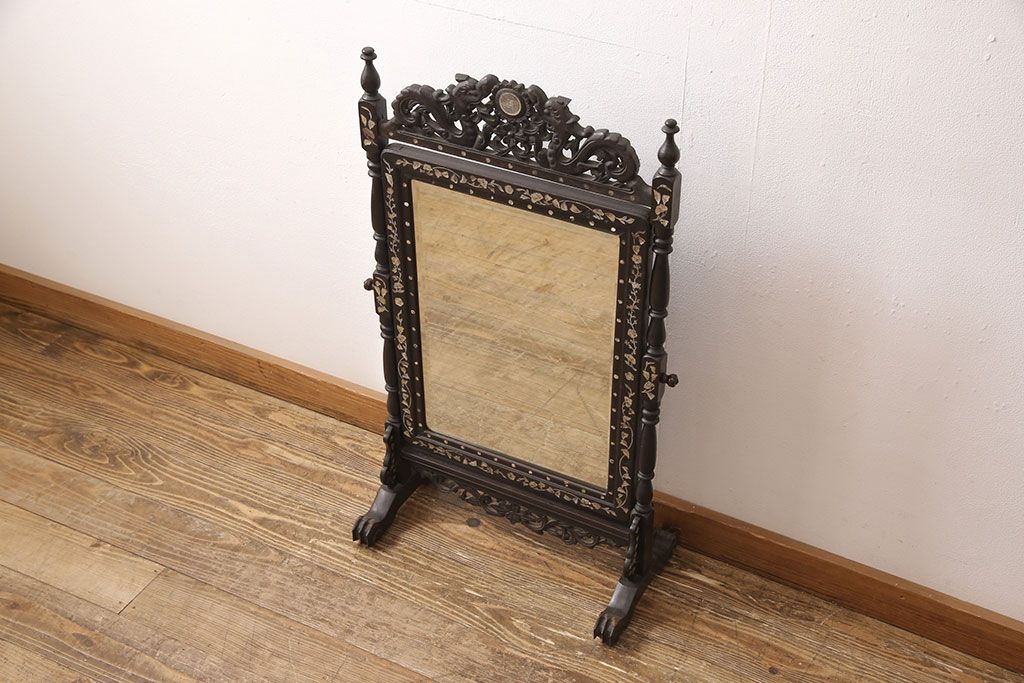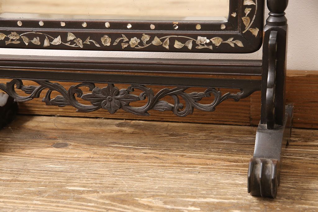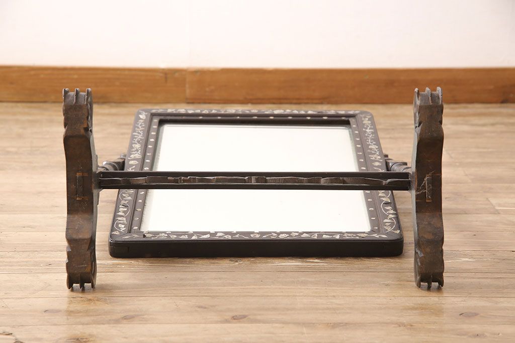 時代物 古い 李朝螺鈿細工 龍彫刻 座鏡(朝鮮、中国、ミラー)(R-053179)です。