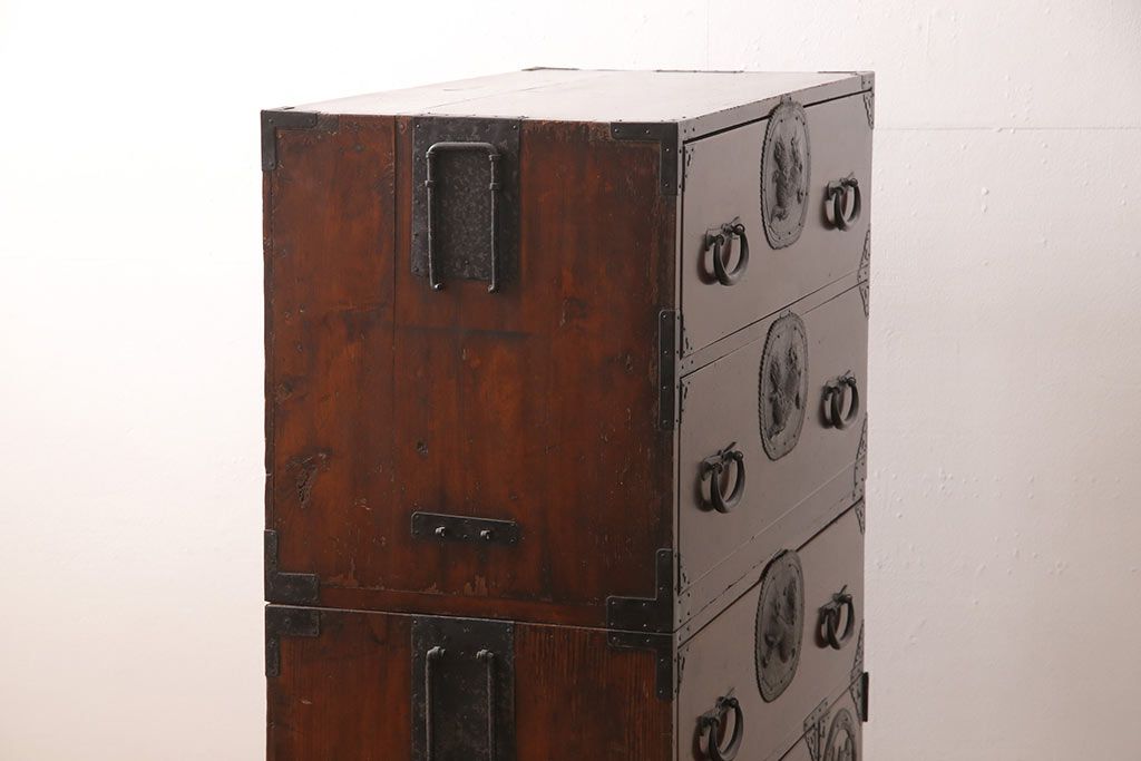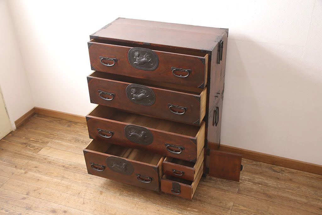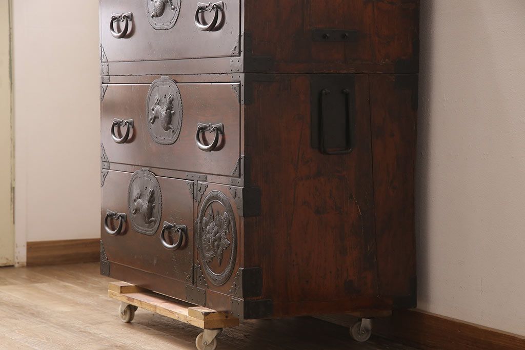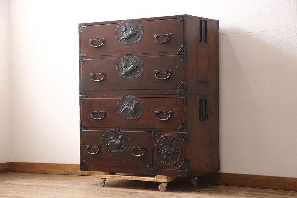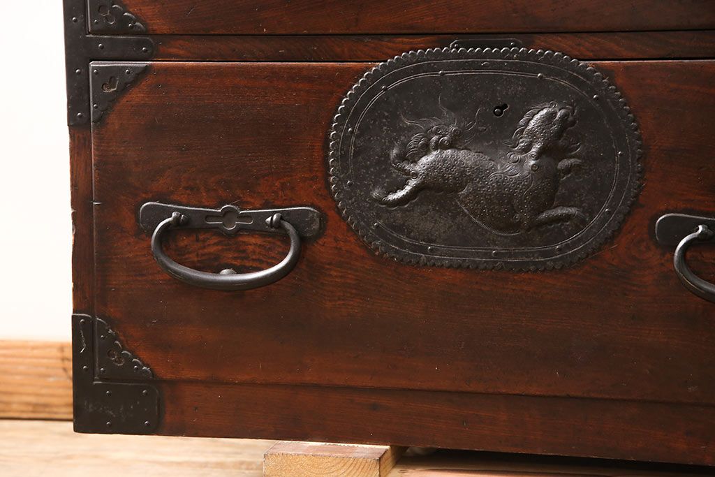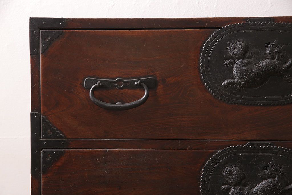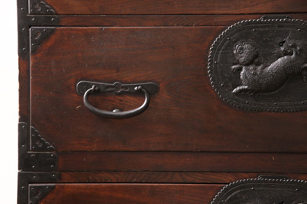 和箪笥 > 和製アンティーク 上手物 前面ケヤキ材 躍動感のある唐獅子金具が一際目を引く二段重ね相馬箪笥(仙台箪笥、和たんす、衣装箪笥、引き出し、チェスト)(R-053375)