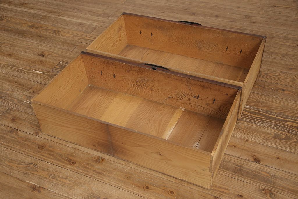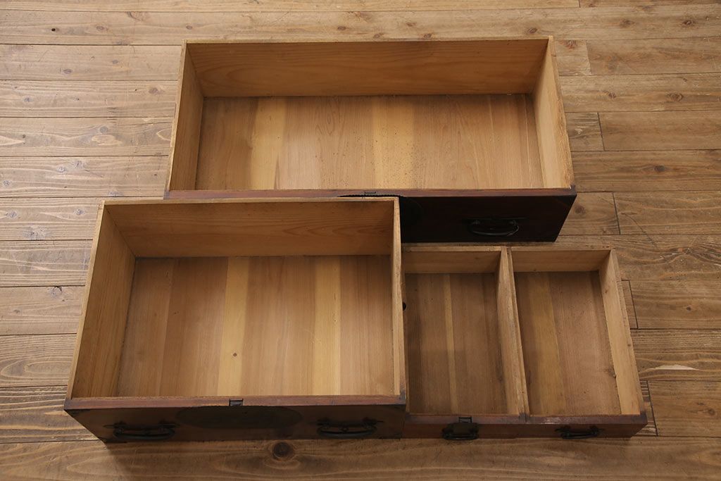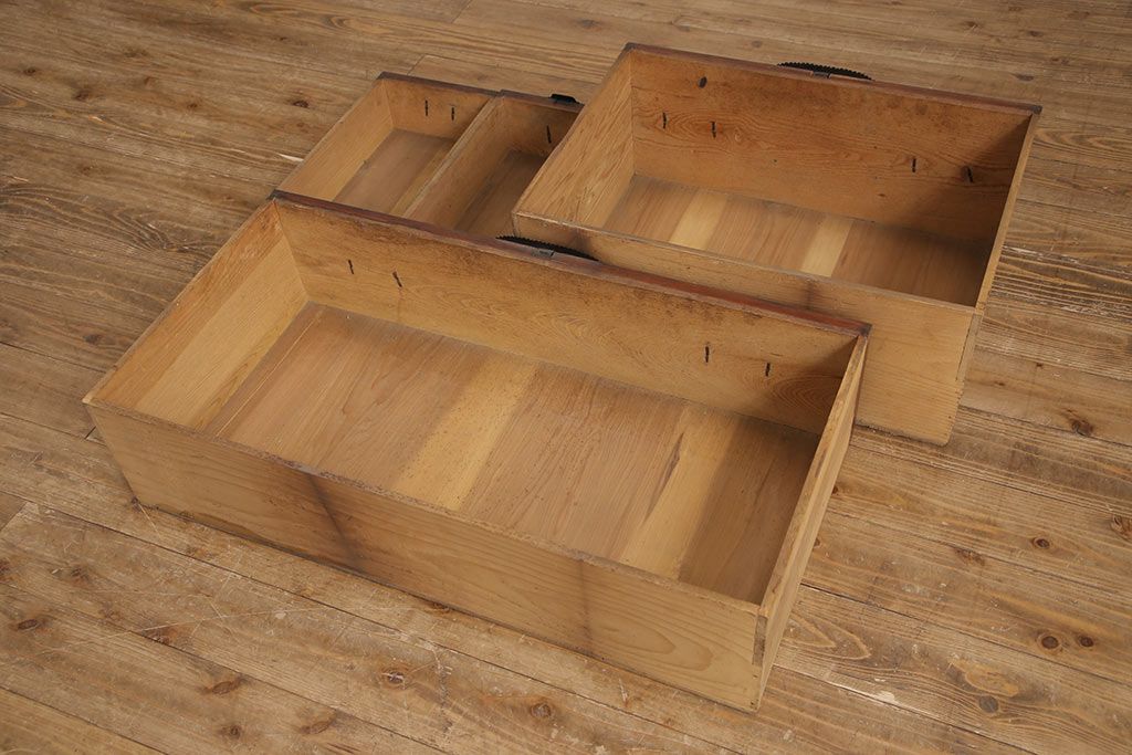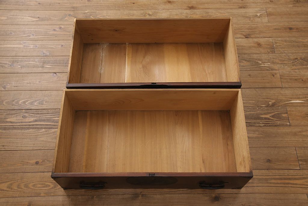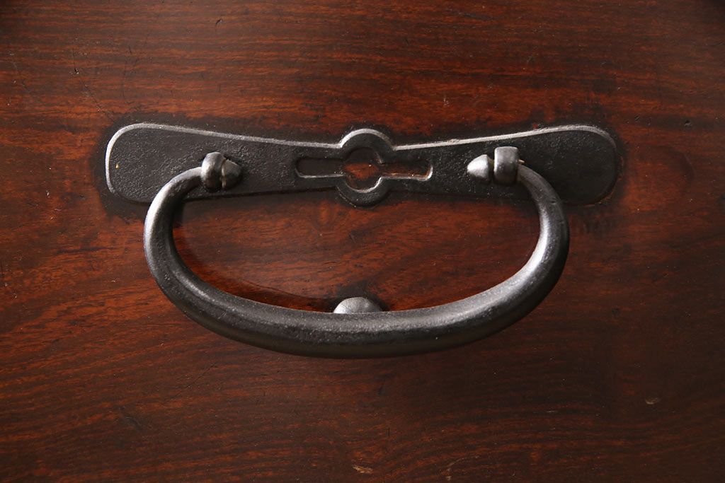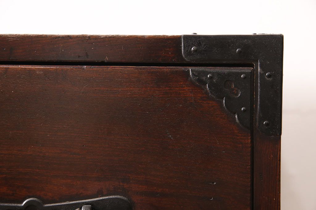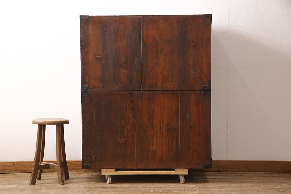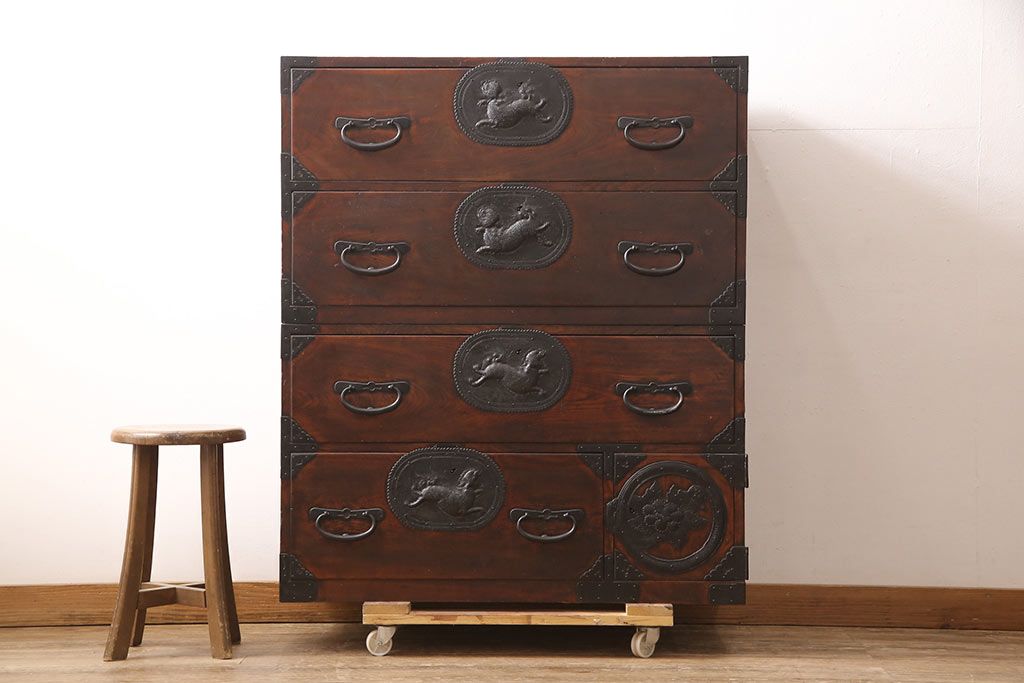 和箪笥 > 和製アンティーク 上手物 前面ケヤキ材 躍動感のある唐獅子金具が一際目を引く二段重ね相馬箪笥(仙台箪笥、和たんす、衣装箪笥、引き出し、チェスト)(R-053375)