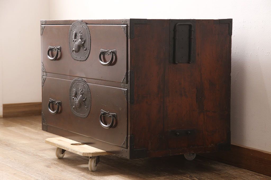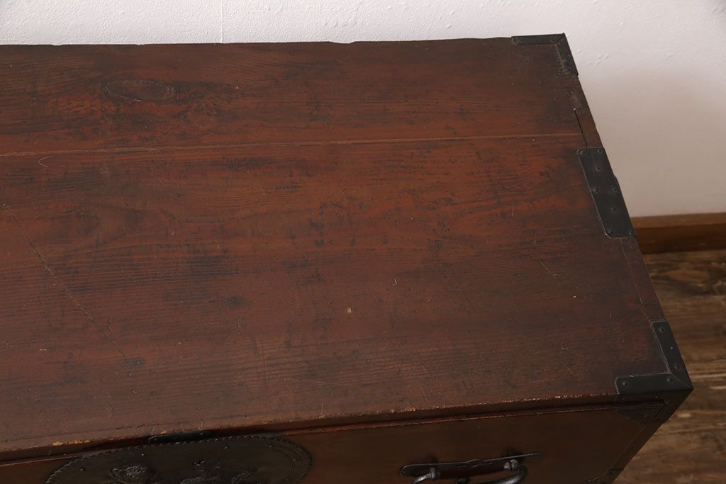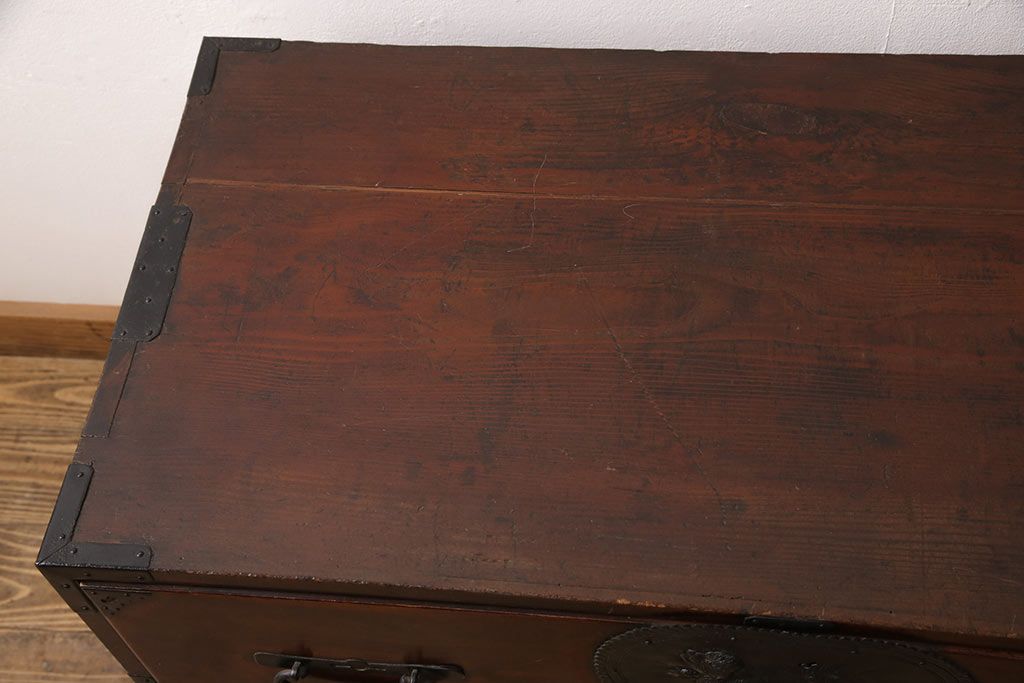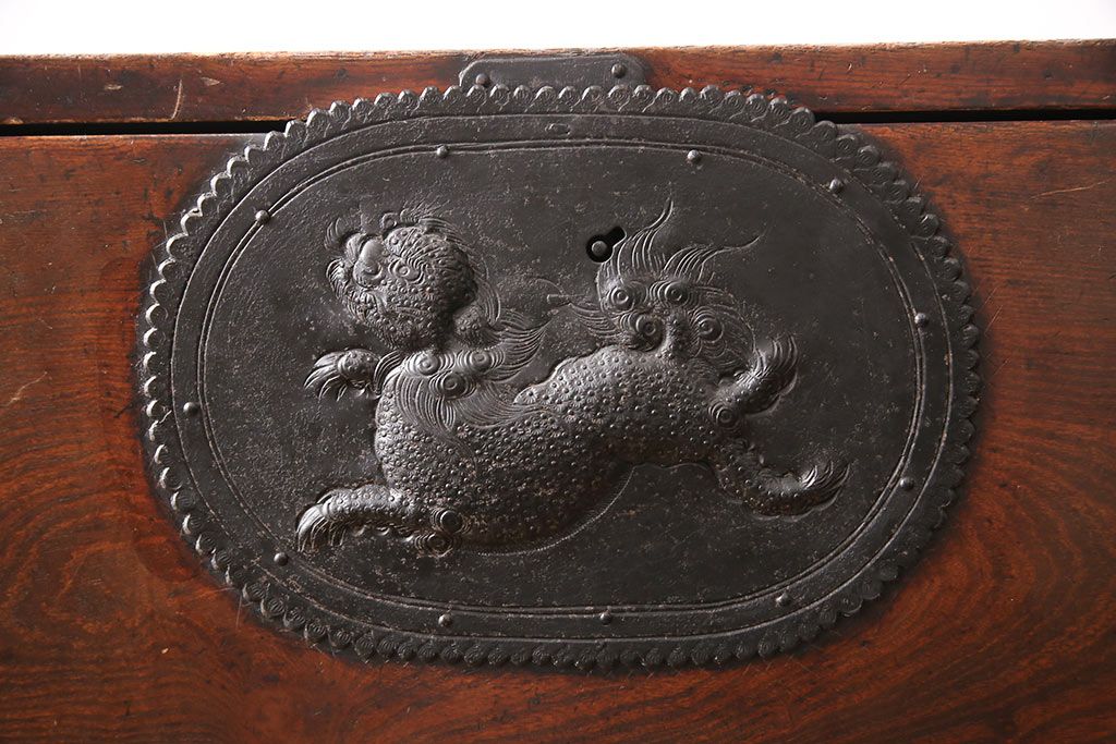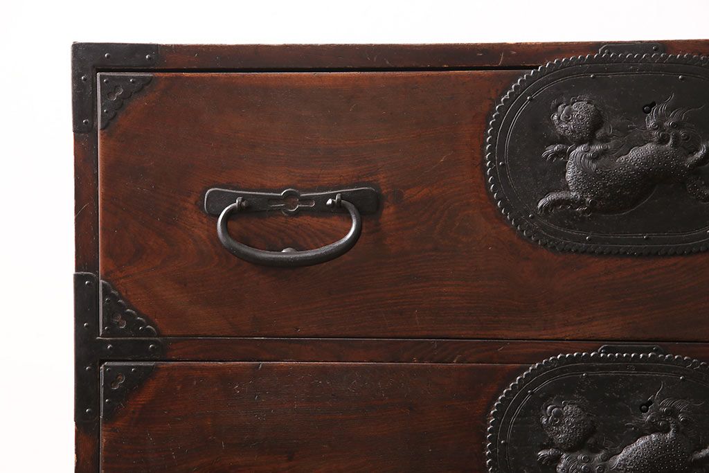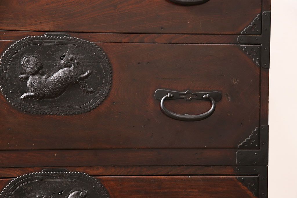 和箪笥> 衣装箪笥 > 和製アンティーク 上手物 前面ケヤキ材 躍動感のある唐獅子金具が一際目を引く二段重ね相馬箪笥・上段(仙台箪笥、和たんす、衣装箪笥、引き出し、チェスト)(R-053376)