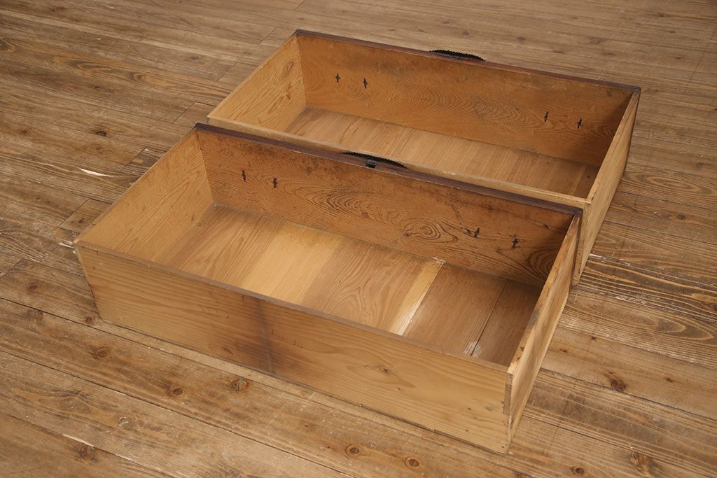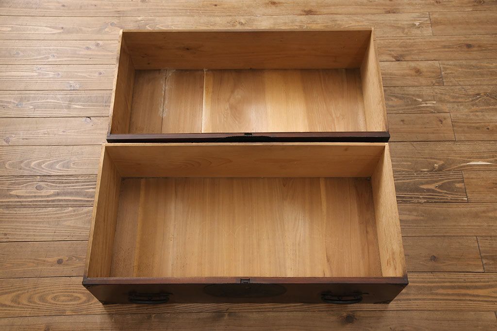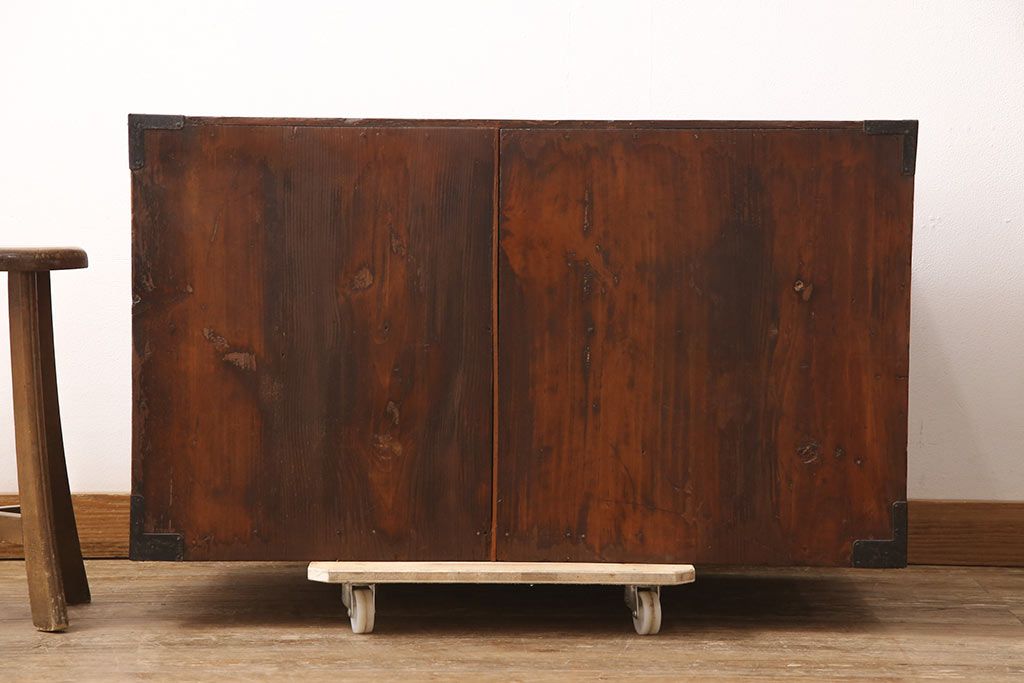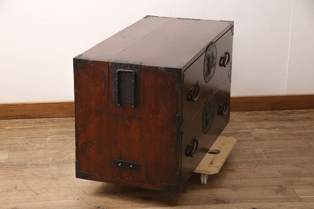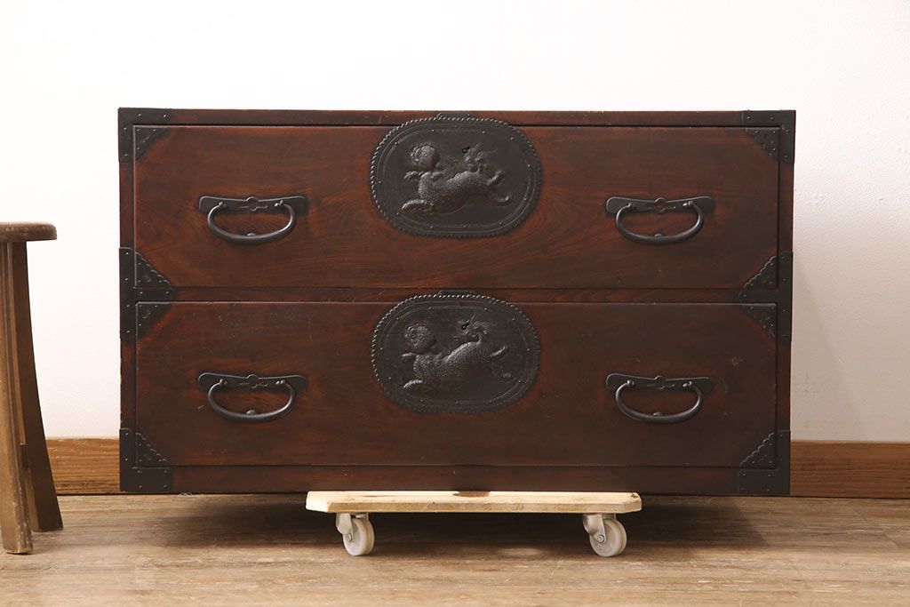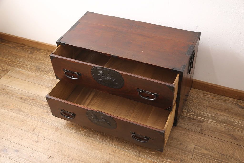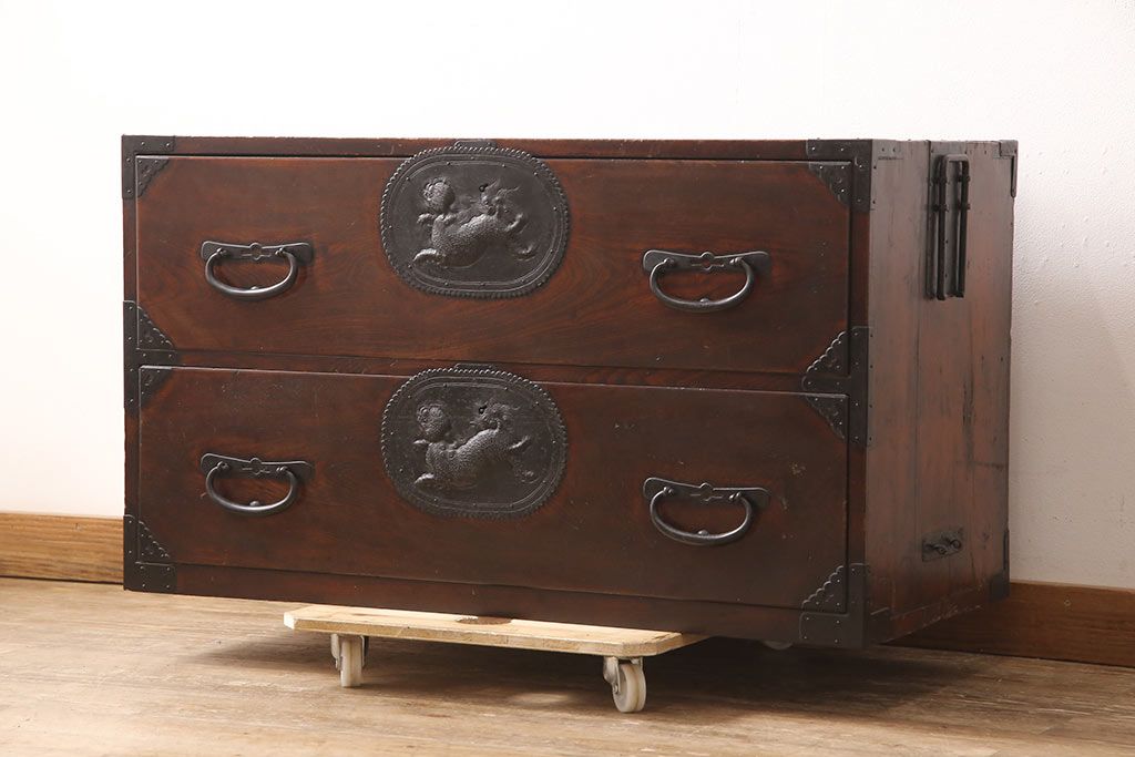 和箪笥> 衣装箪笥 > 和製アンティーク 上手物 前面ケヤキ材 躍動感のある唐獅子金具が一際目を引く二段重ね相馬箪笥・上段(仙台箪笥、和たんす、衣装箪笥、引き出し、チェスト)(R-053376)