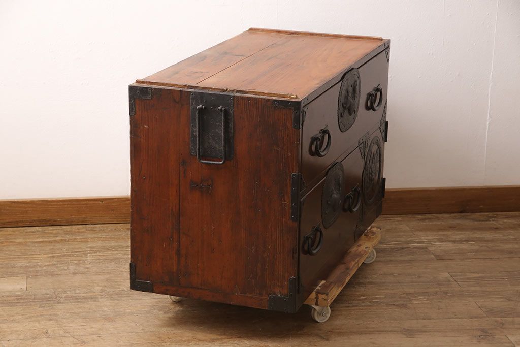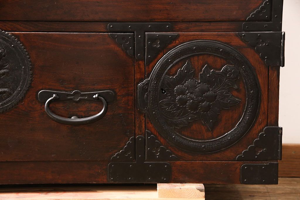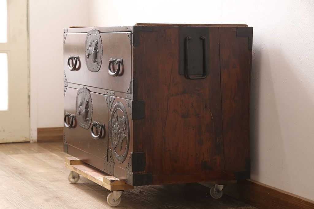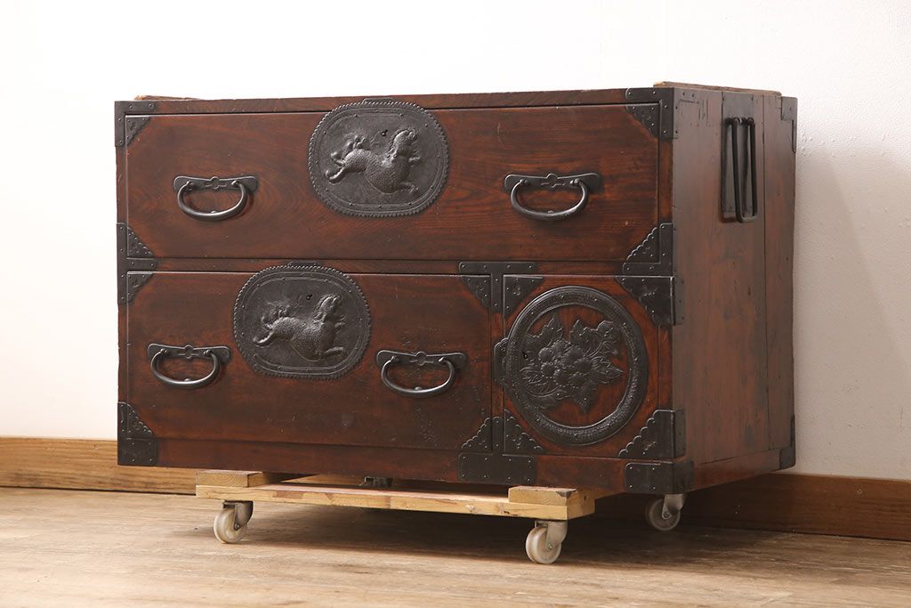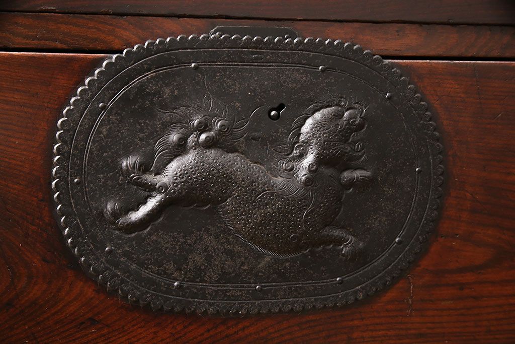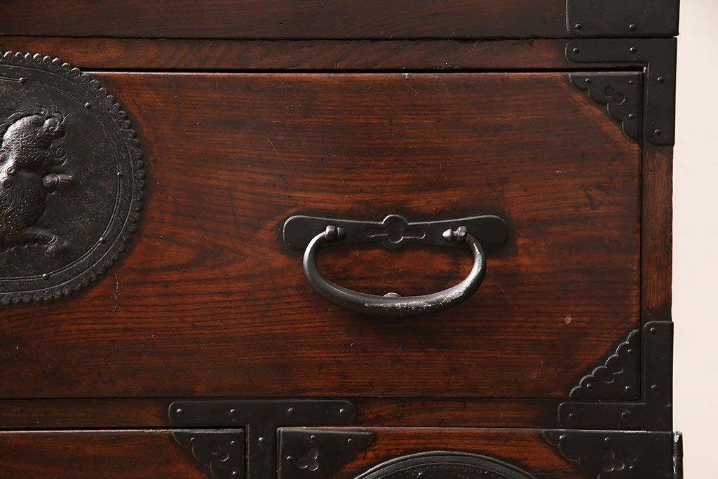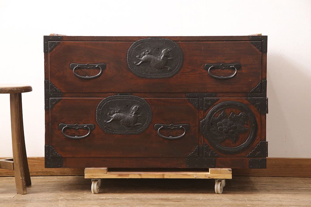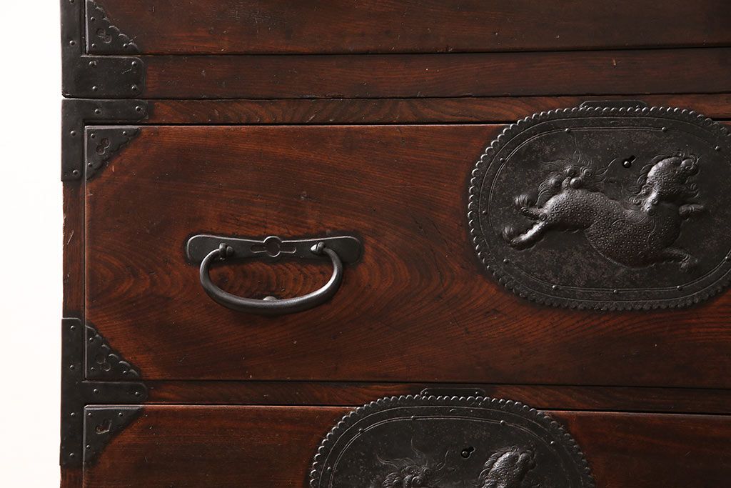 和箪笥> 衣装箪笥 > 和製アンティーク 上手物 前面ケヤキ材 躍動感のある唐獅子金具が一際目を引く二段重ね相馬箪笥・下段(仙台箪笥、和たんす、衣装箪笥、引き出し、チェスト)(R-053377)