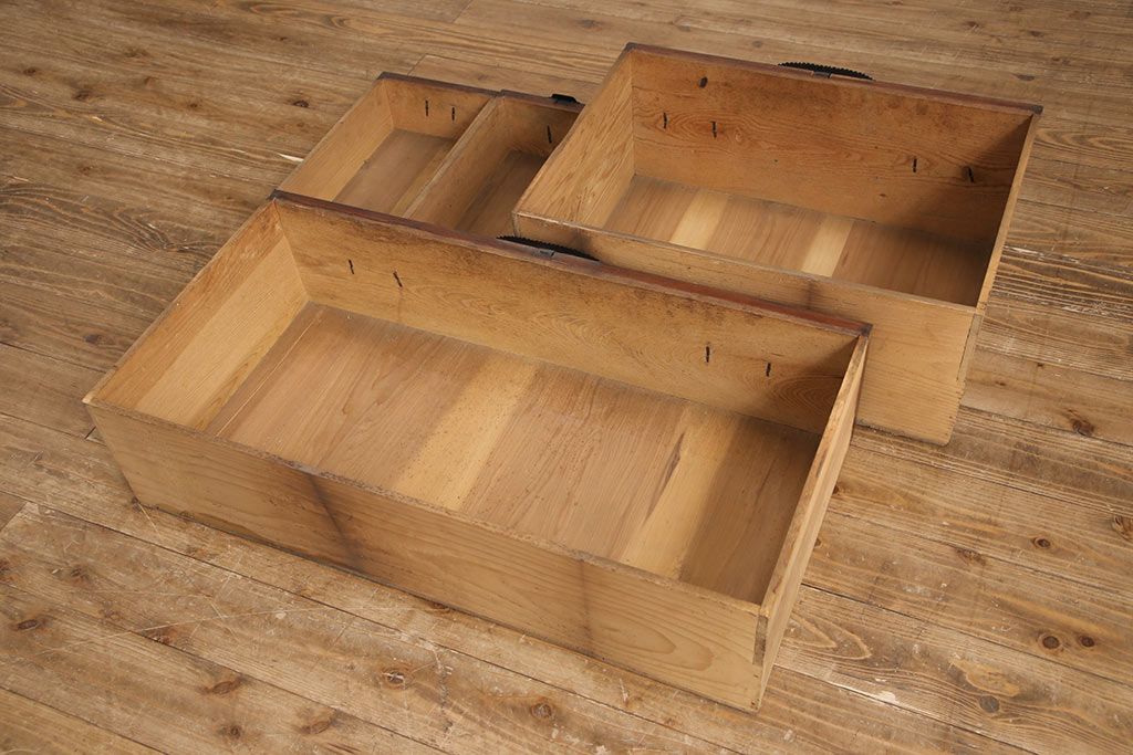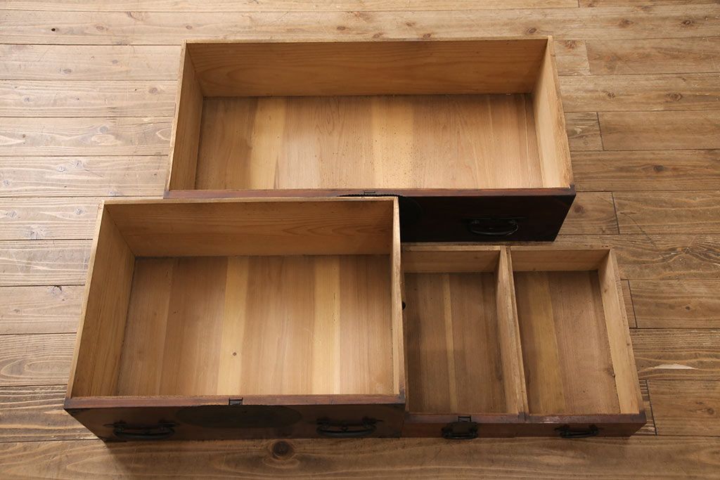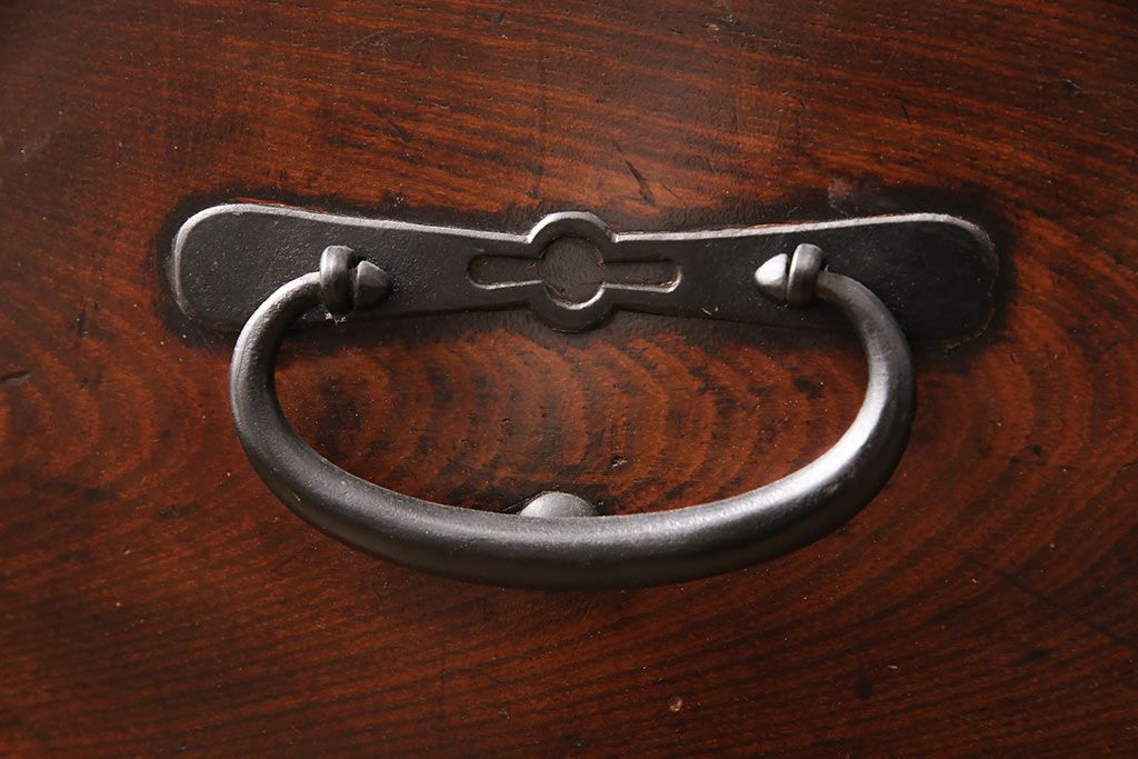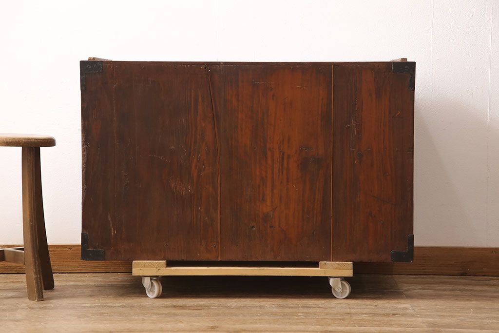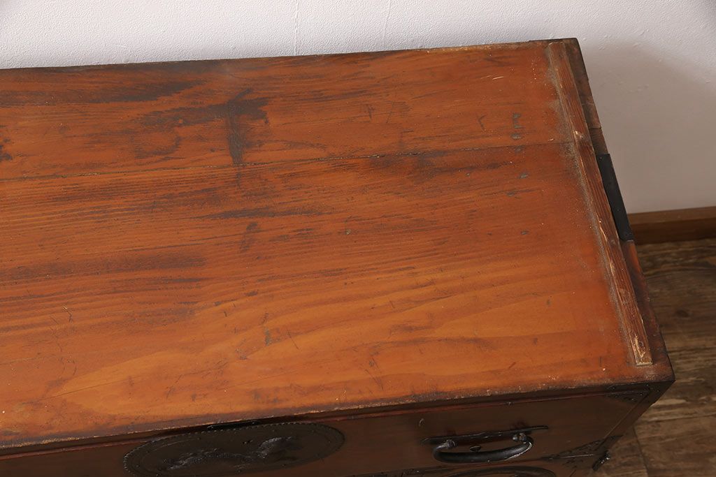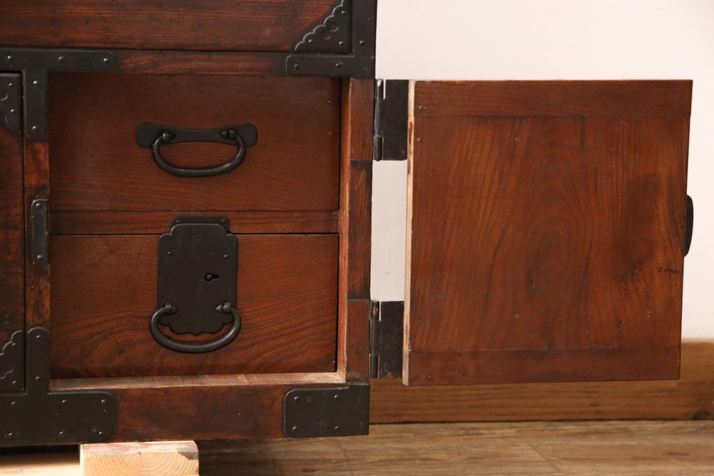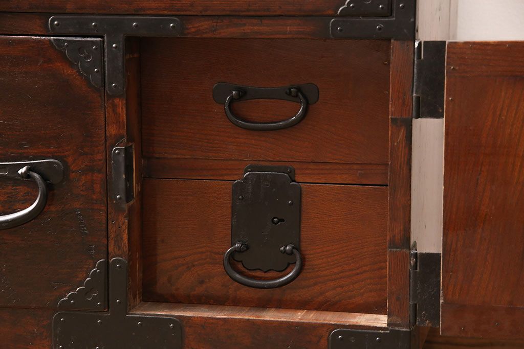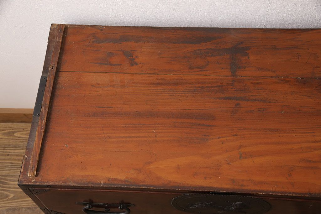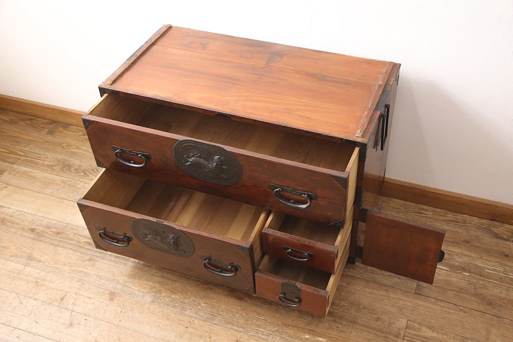 和箪笥> 衣装箪笥 > 和製アンティーク 上手物 前面ケヤキ材 躍動感のある唐獅子金具が一際目を引く二段重ね相馬箪笥・下段(仙台箪笥、和たんす、衣装箪笥、引き出し、チェスト)(R-053377)