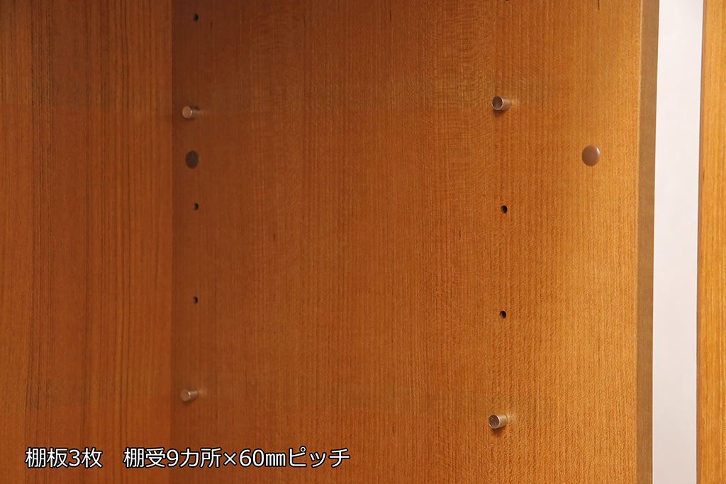 棚板は取り外しできます。棚板は各3枚あります。棚受けは9ヶ所、60mmピッチで調整できます。棚幅サイズのものが1枚の作りです。