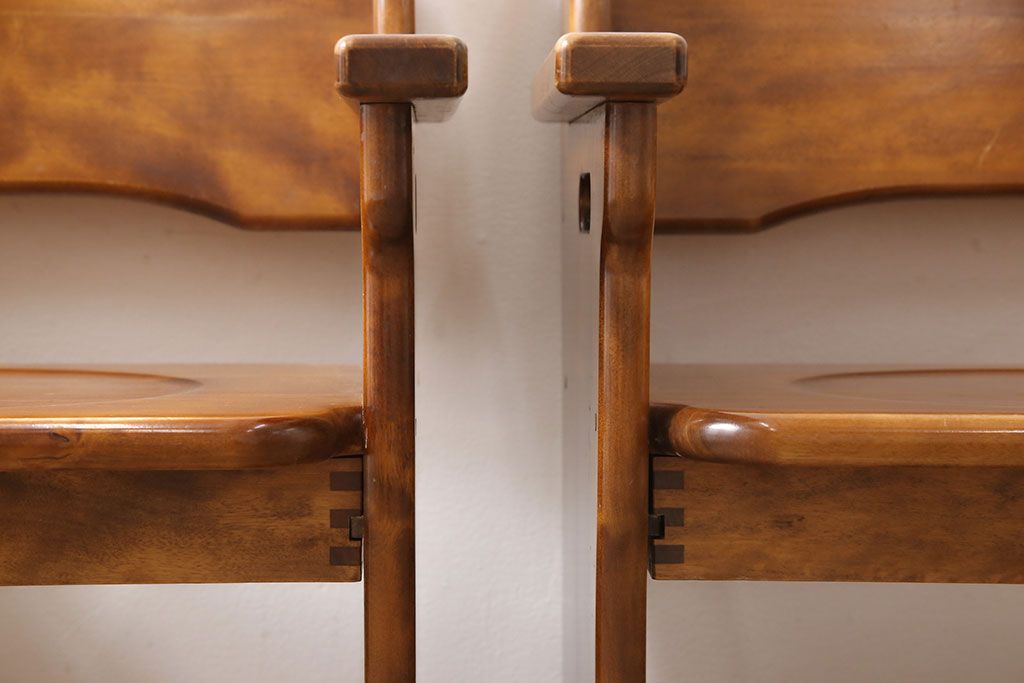 民芸家具 > 中古 民芸家具 カバ材(樺材) 木の優しいぬくもりを感じる引き出し付きチェア2脚セット(アームチェア、板座チェア、椅子、イス)(R-053534)