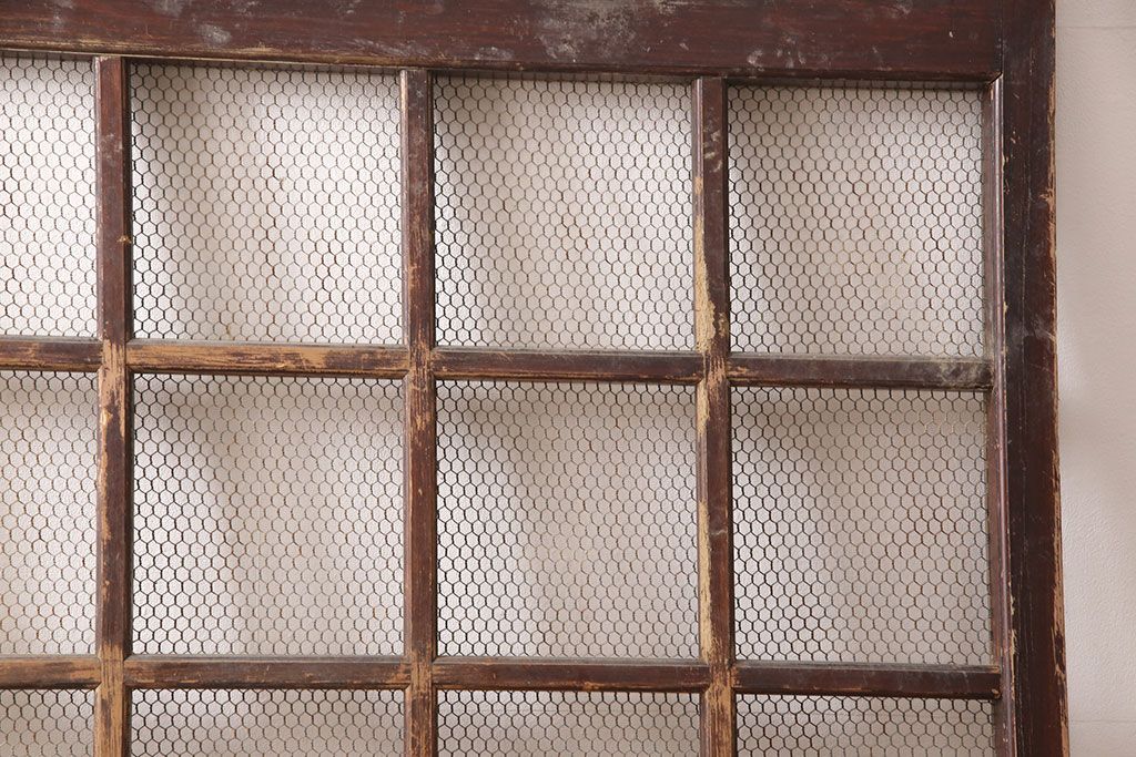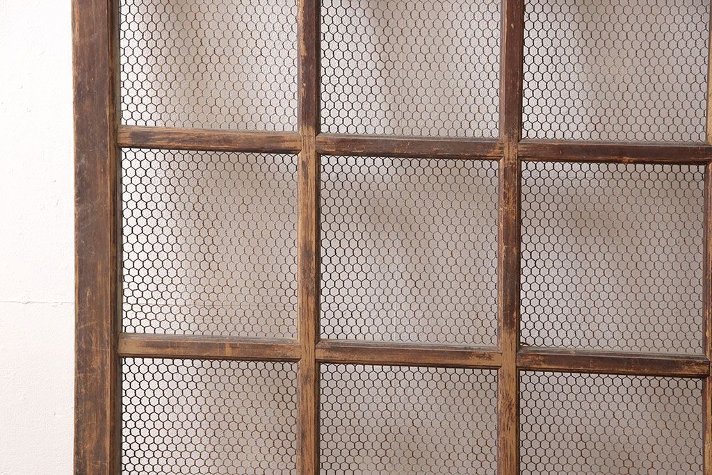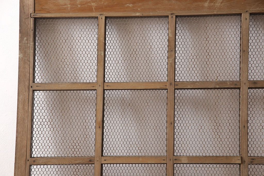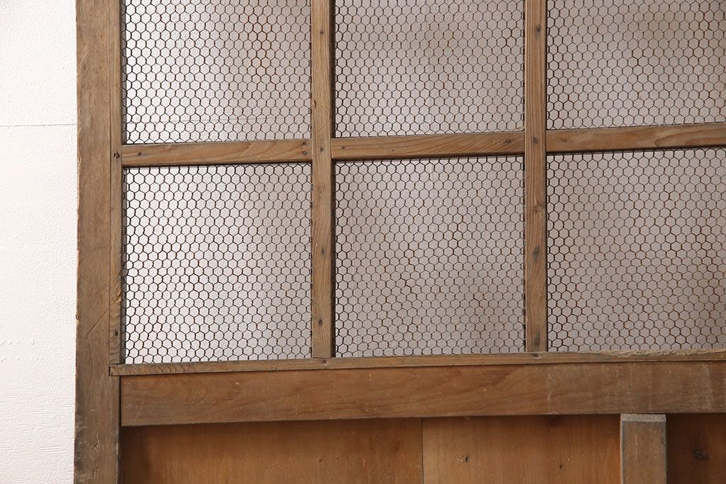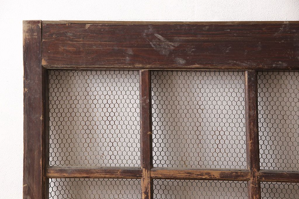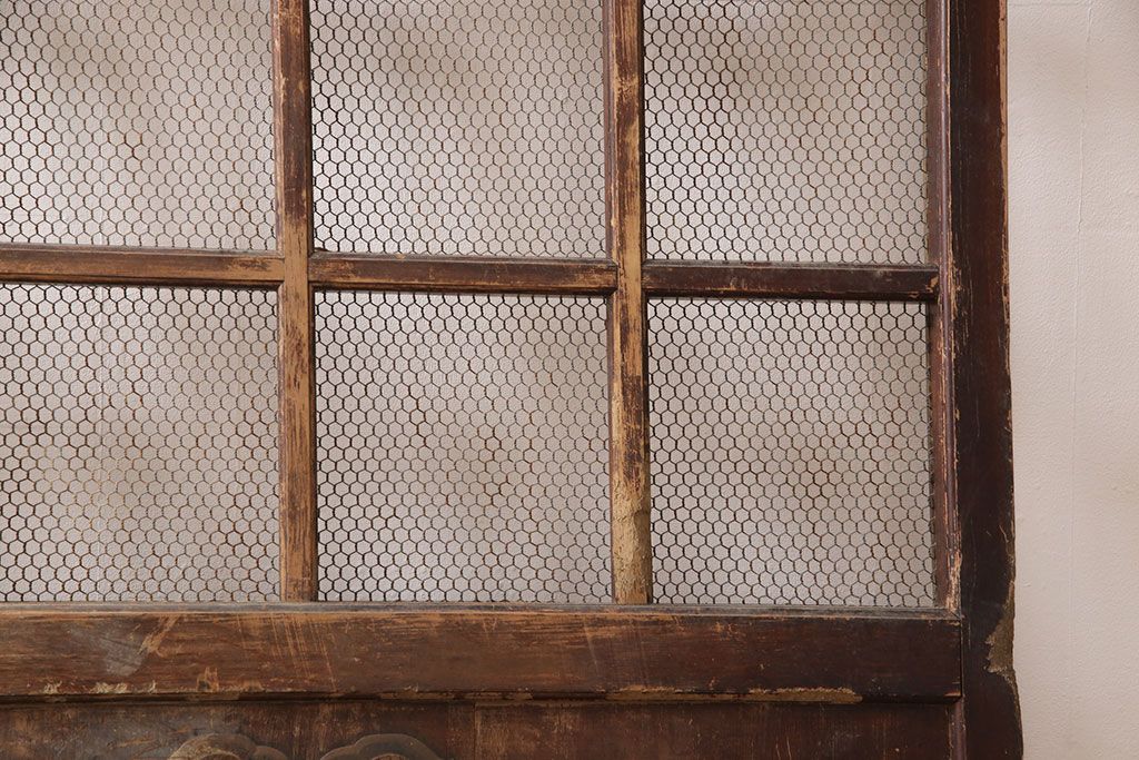 ドア・建具> 格子戸 > アンティーク建具 明治期 ヒノキ材 亀甲金網付き 経年を感じる風合いが魅力!貫禄を感じる蔵戸(きつね格子、狐格子、玄関戸、玄関ドア、引き戸、格子戸、マス目、升目)(R-053269)