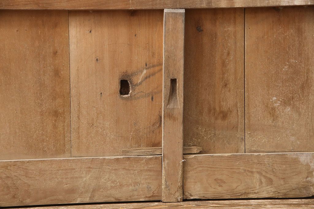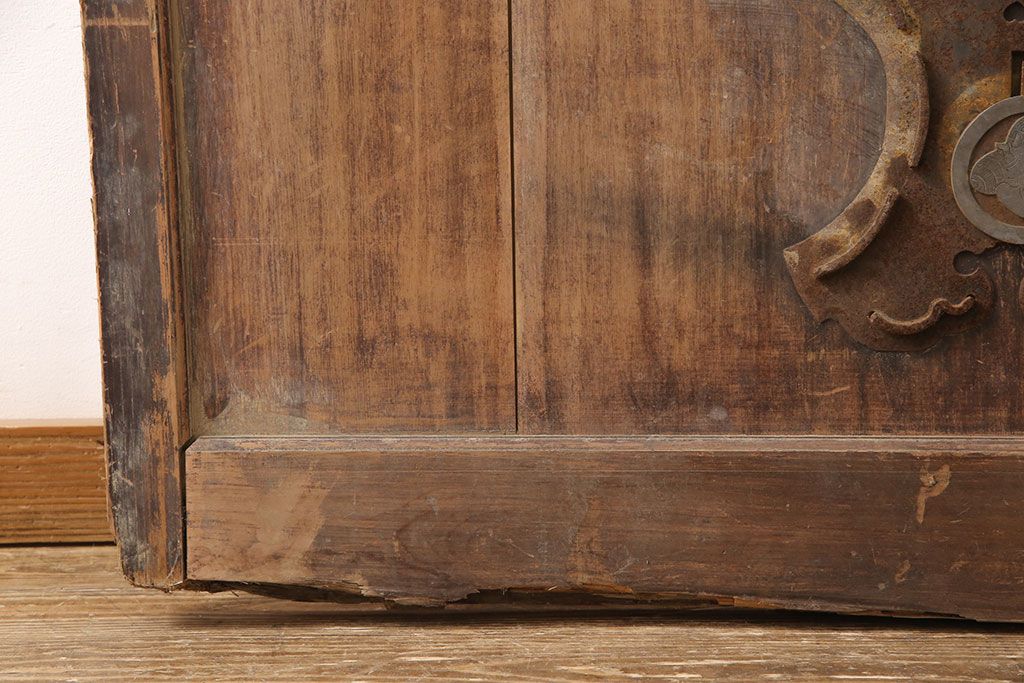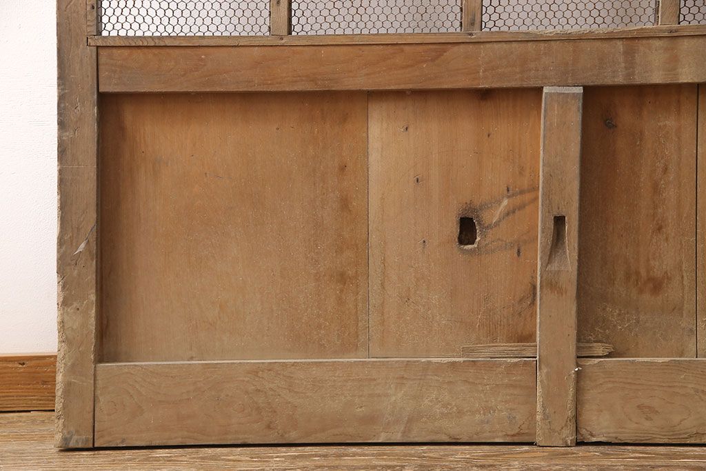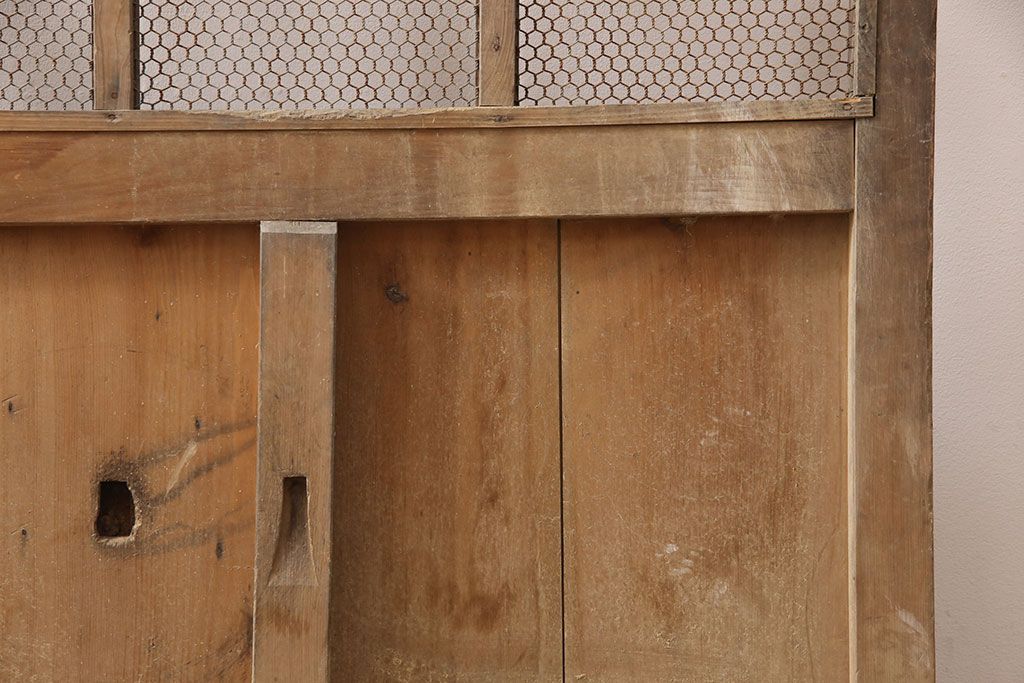状態が気になる方には現状販売はおすすめできませんので、慎重なご検討をお願いいたします。アンティーク建具 明治期 ヒノキ材 亀甲金網付き 経年を感じる風合いが魅力!貫禄を感じる蔵戸(きつね格子、狐格子、玄関戸、玄関ドア、引き戸、格子戸、マス目、升目)(R-053269)です。
