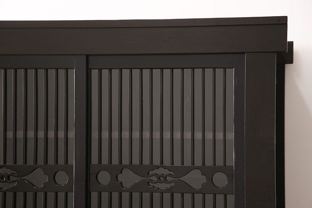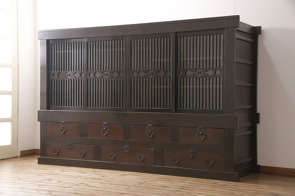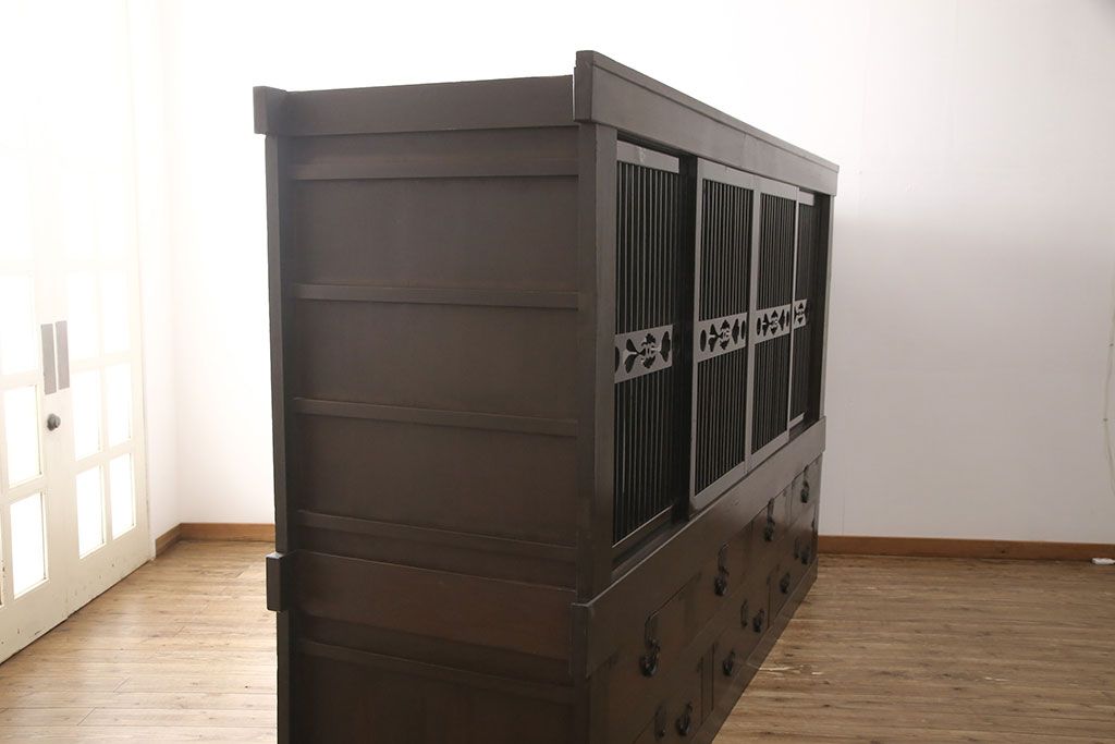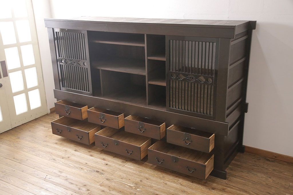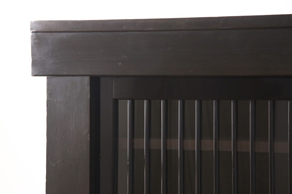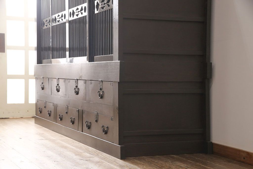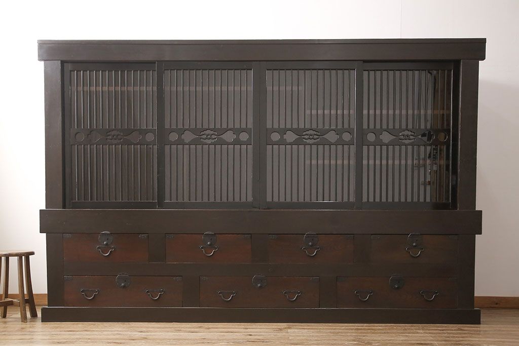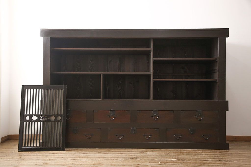 和箪笥> 水屋箪笥 > 明治期の九尺収納箪笥をリペア&カスタム!取り外し可能な棚板を設置。引き戸の板をクリアガラスに変更し、現状に近しい色味に着色し仕上げ。(水屋箪笥、食器棚、収納棚、戸棚、キャビネット)
