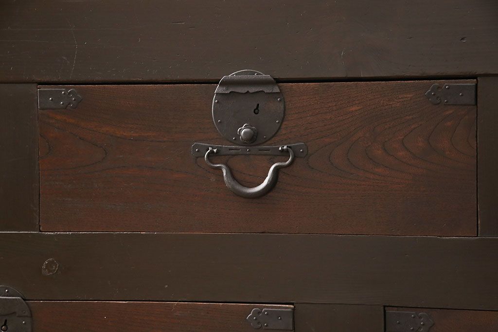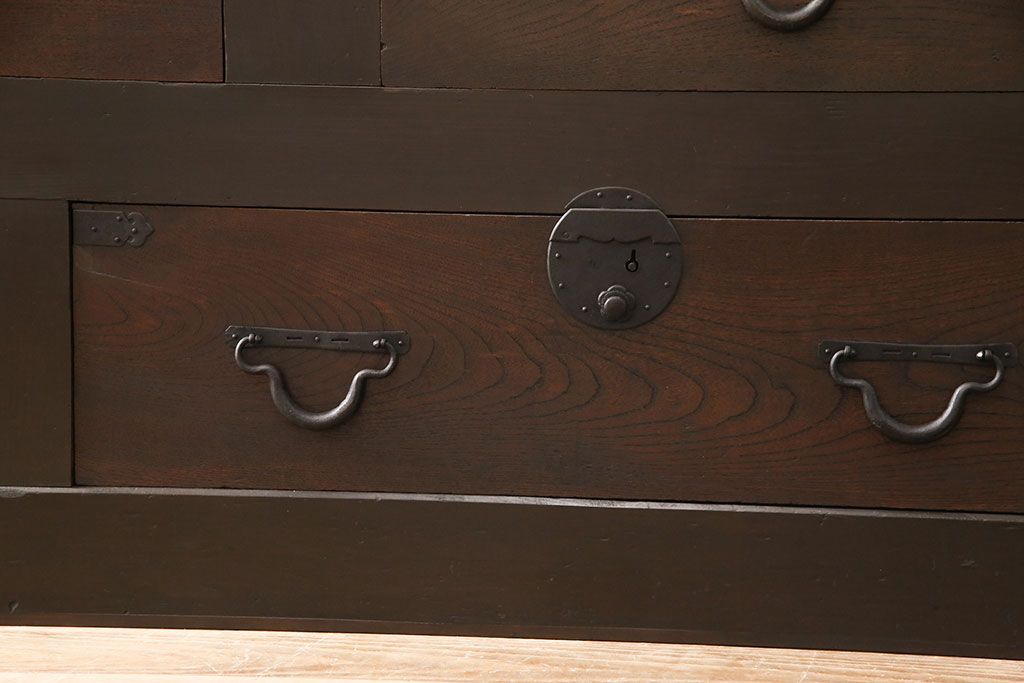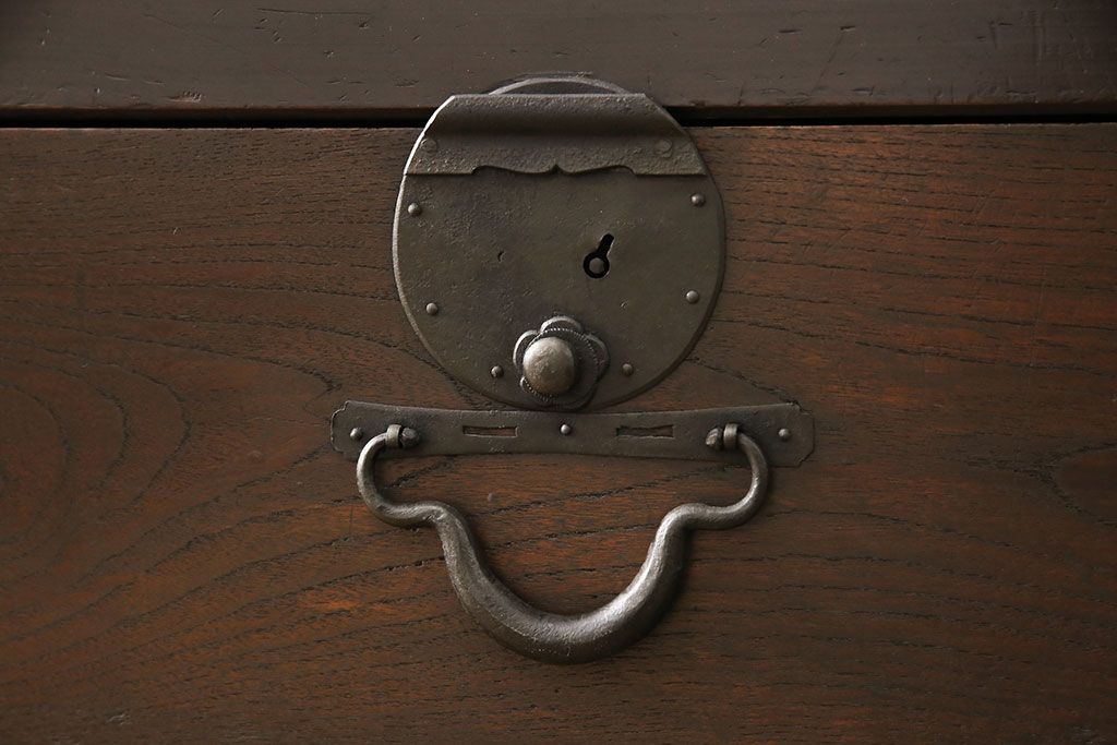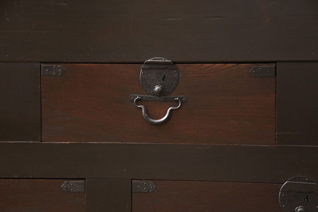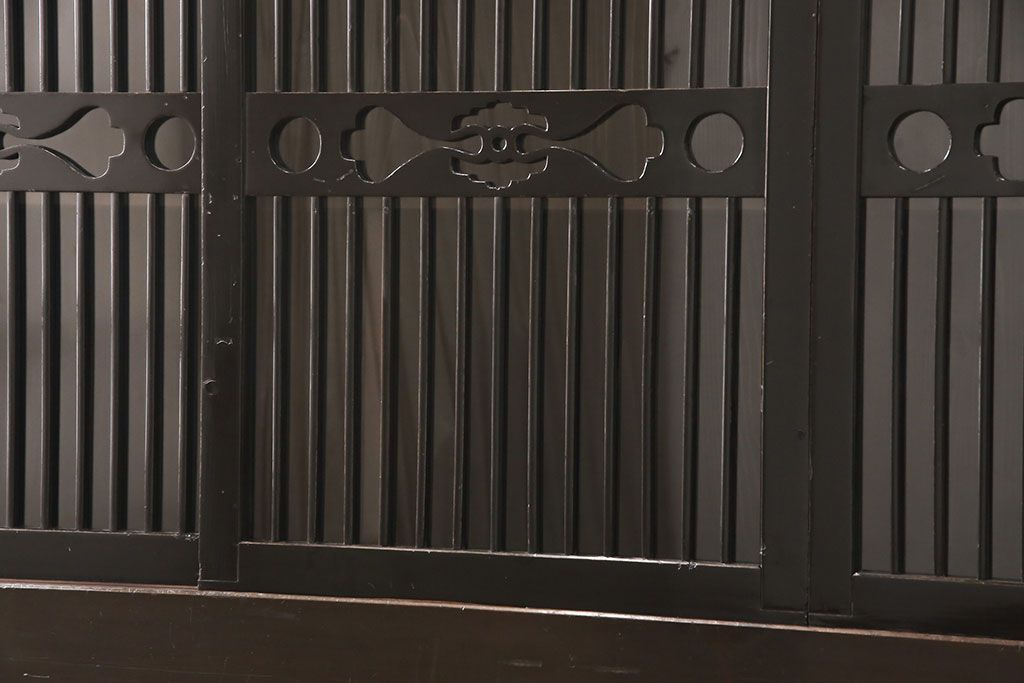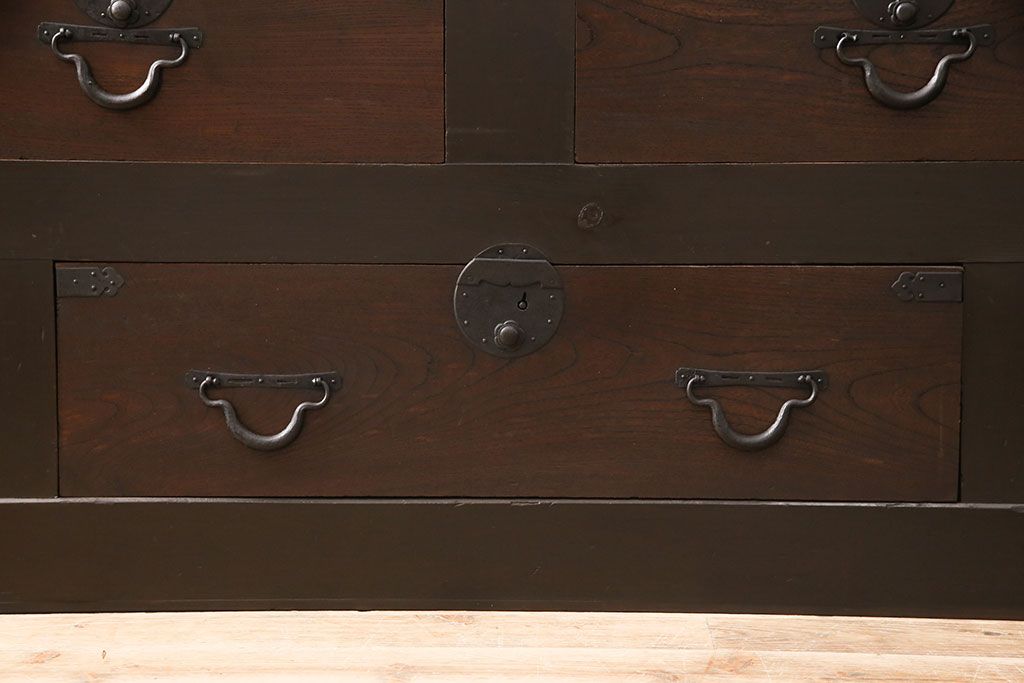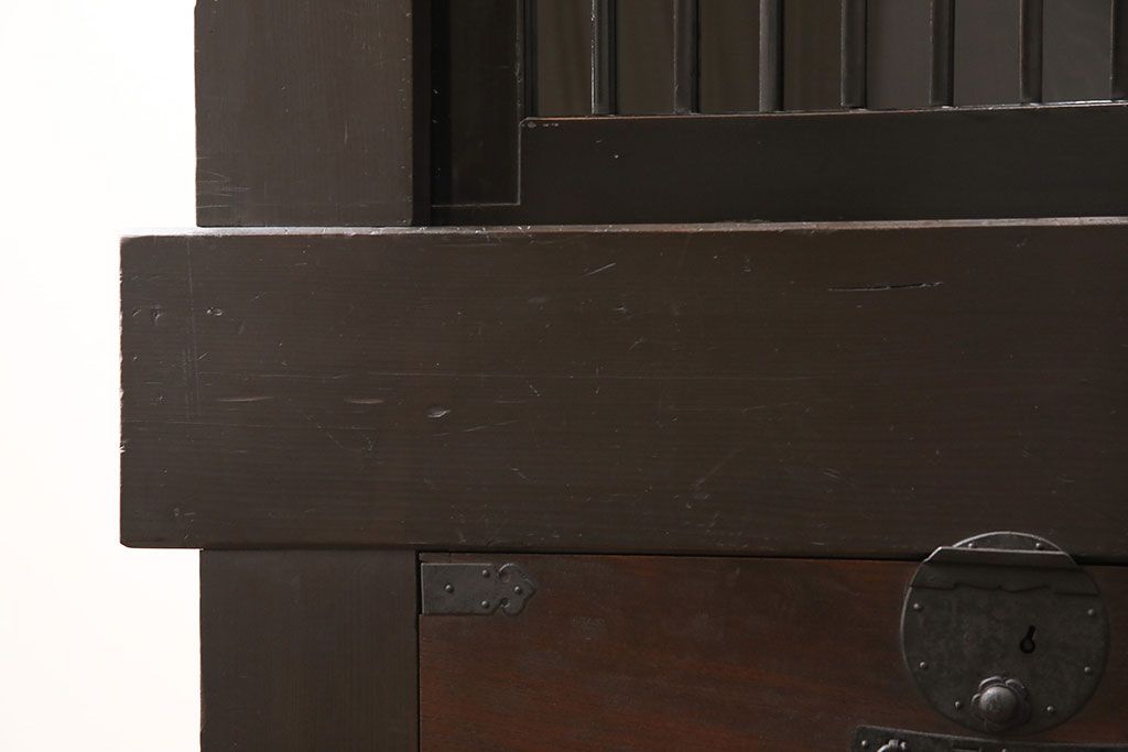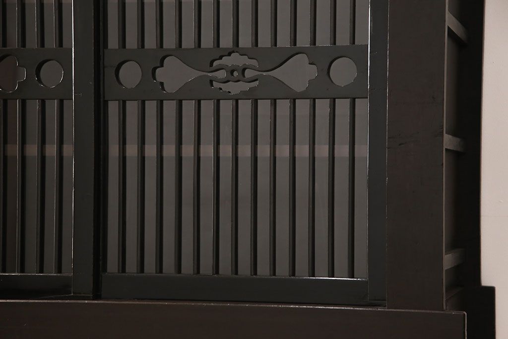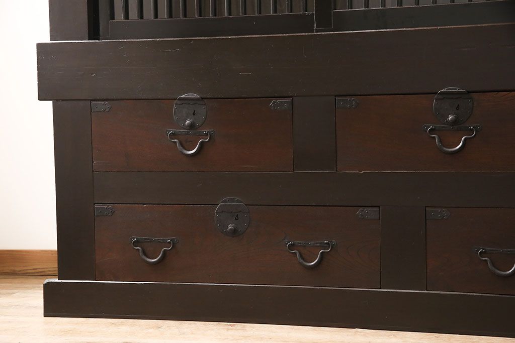 和箪笥> 水屋箪笥 > 明治期の九尺収納箪笥をリペア&カスタム!取り外し可能な棚板を設置。引き戸の板をクリアガラスに変更し、現状に近しい色味に着色し仕上げ。(水屋箪笥、食器棚、収納棚、戸棚、キャビネット)