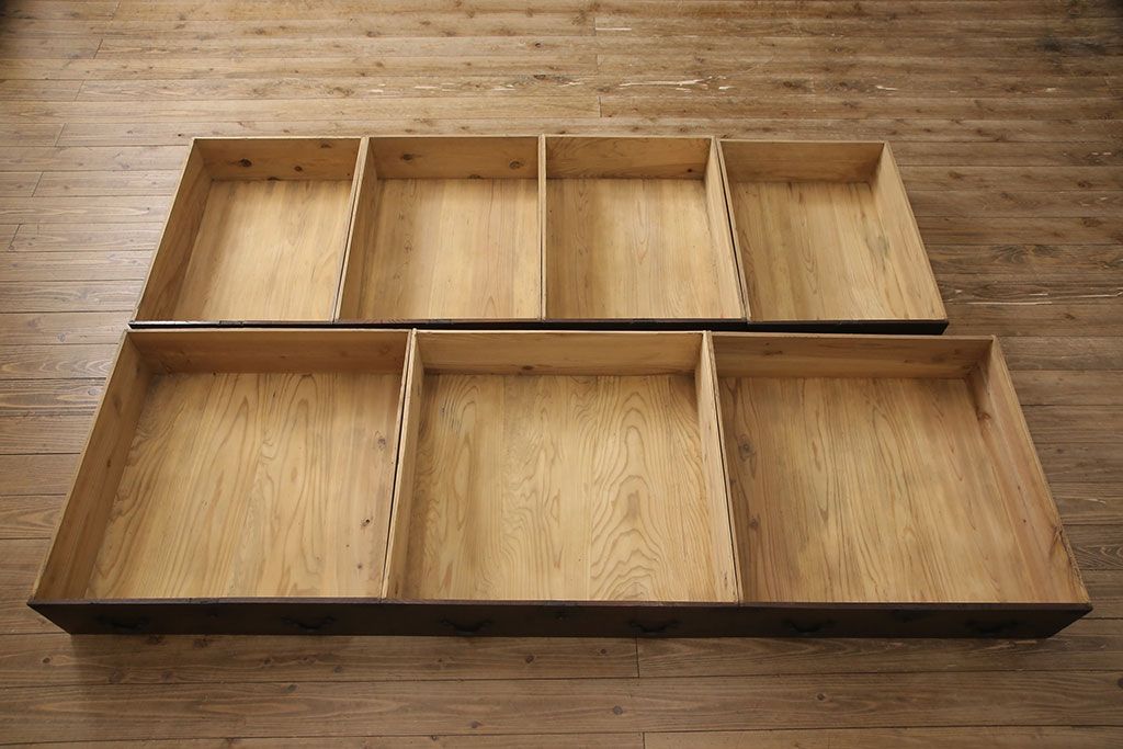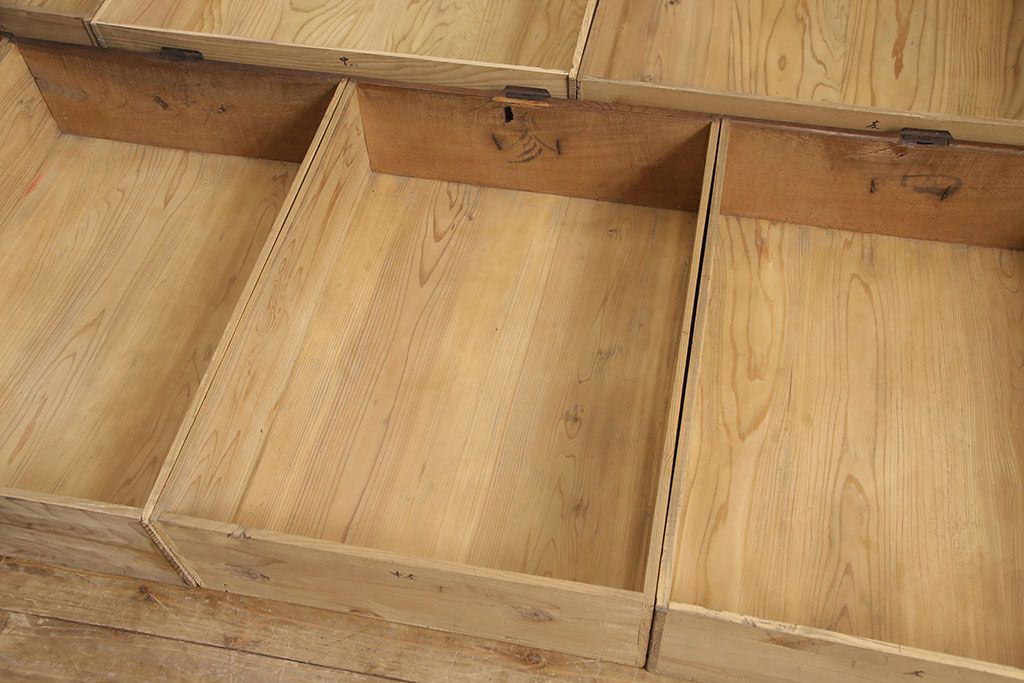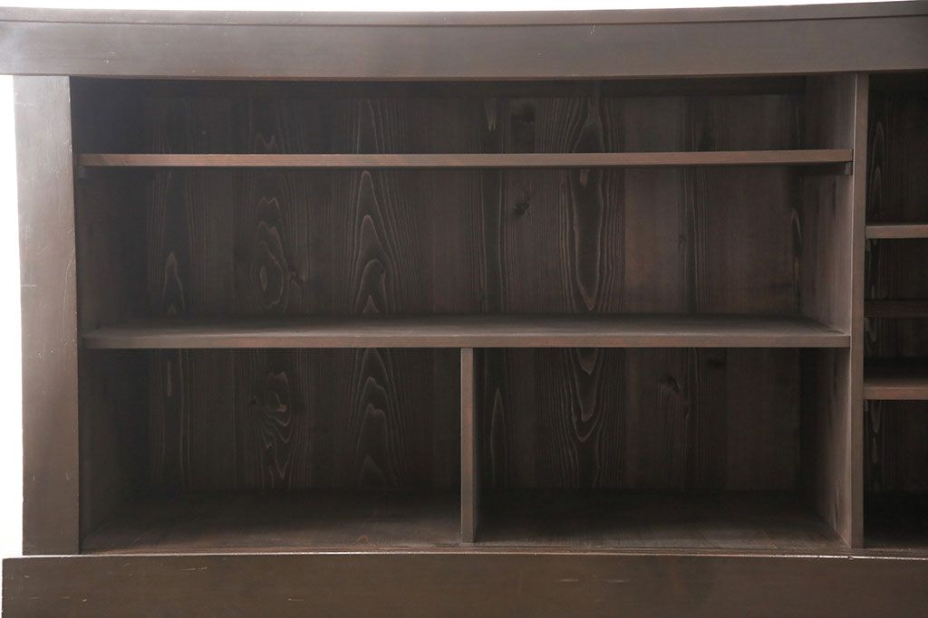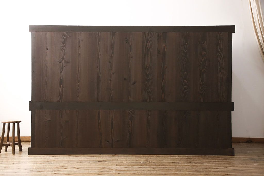 明治期の九尺収納箪笥をリペア&カスタム!取り外し可能な棚板を設置。引き戸の板をクリアガラスに変更し、現状に近しい色味に着色し仕上げ。(水屋箪笥、食器棚、収納棚、戸棚、キャビネット)