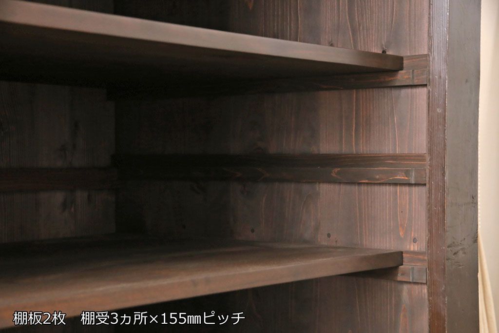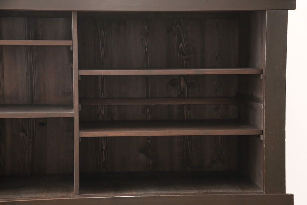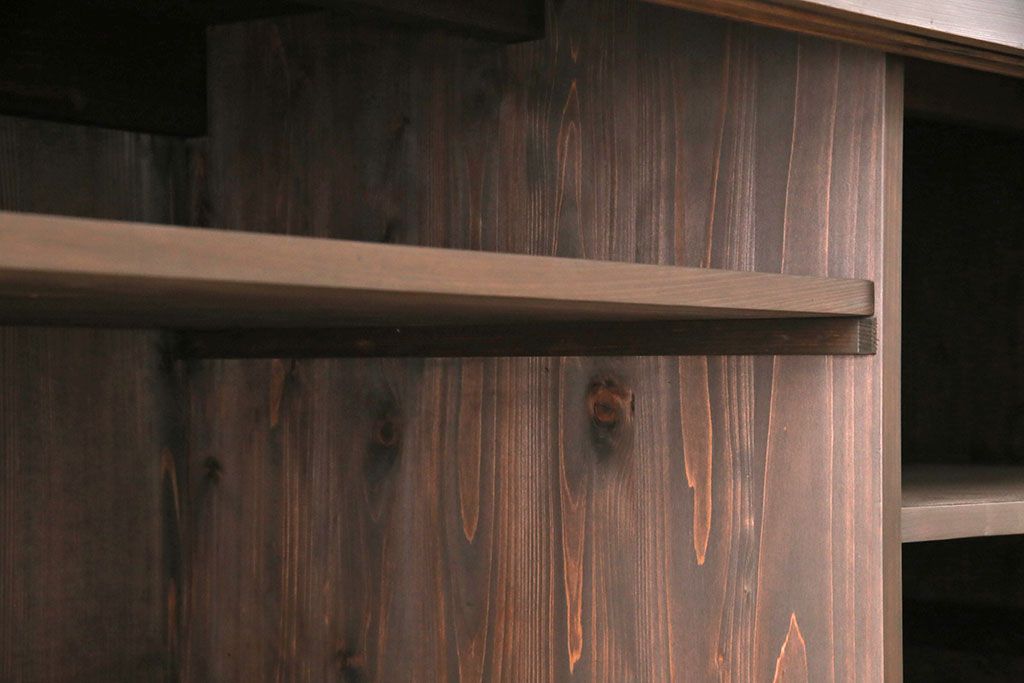 セミオーダー家具実績 > 明治期の九尺収納箪笥をリペア&カスタム!取り外し可能な棚板を設置。引き戸の板をクリアガラスに変更し、現状に近しい色味に着色し仕上げ。(水屋箪笥、食器棚、収納棚、戸棚、キャビネット)