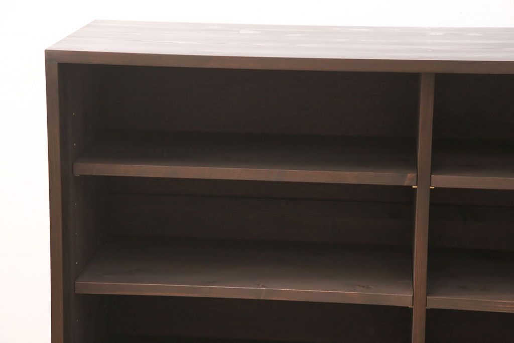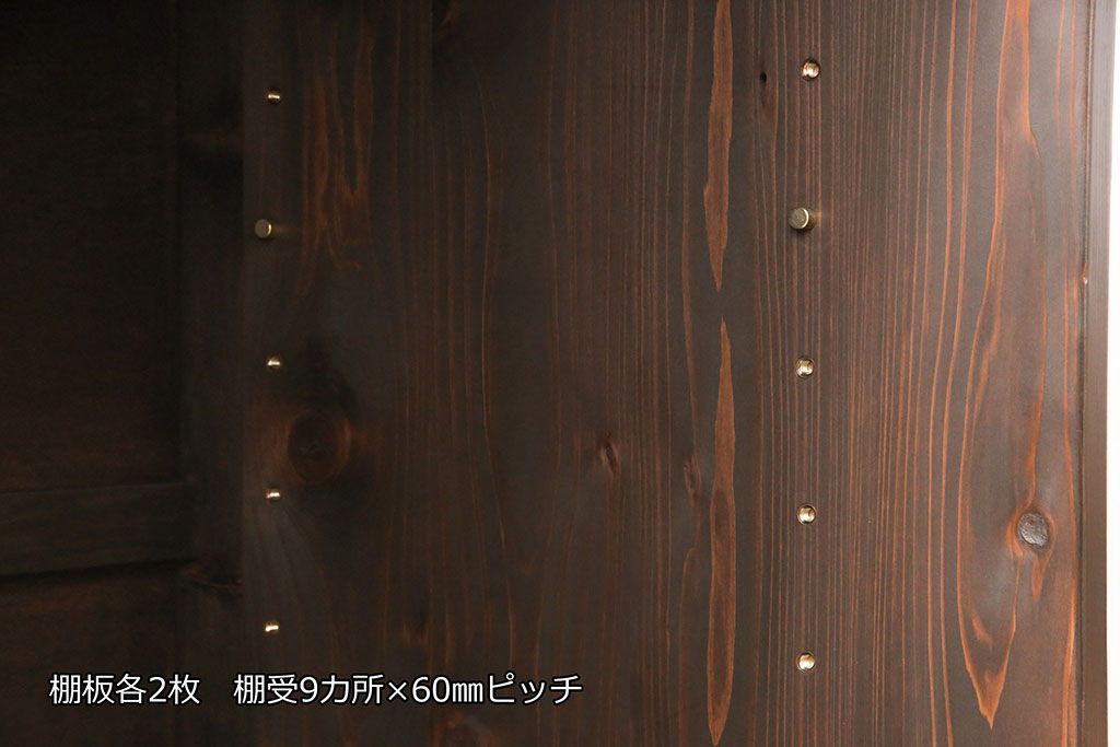 棚板は取り外しできます。棚板は各2枚あります。棚受けは9ヶ所、60mmピッチで調整できます。棚幅サイズのものが1枚の作りです。