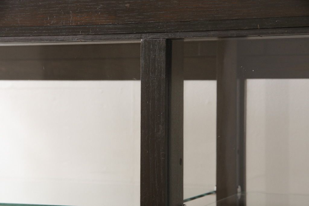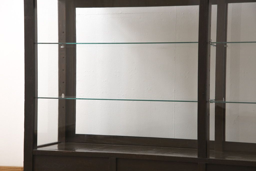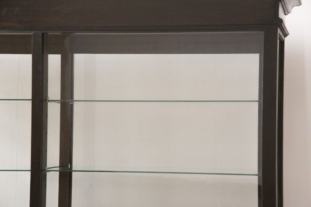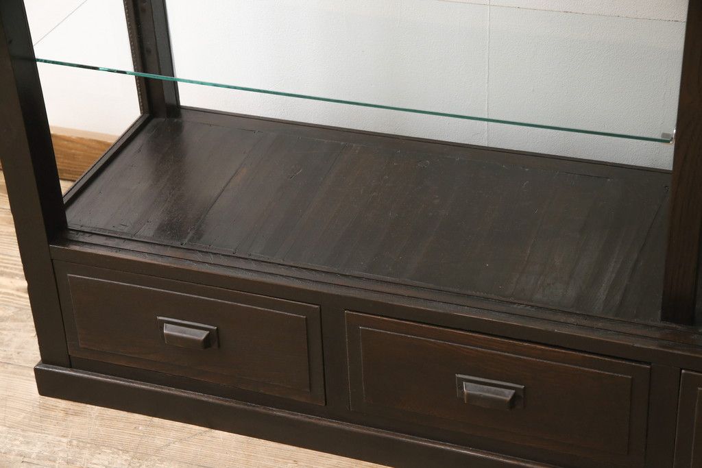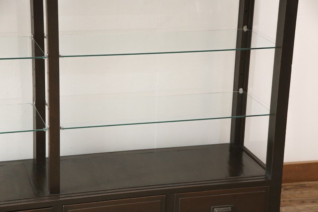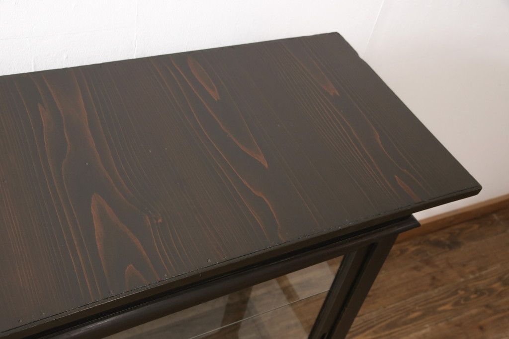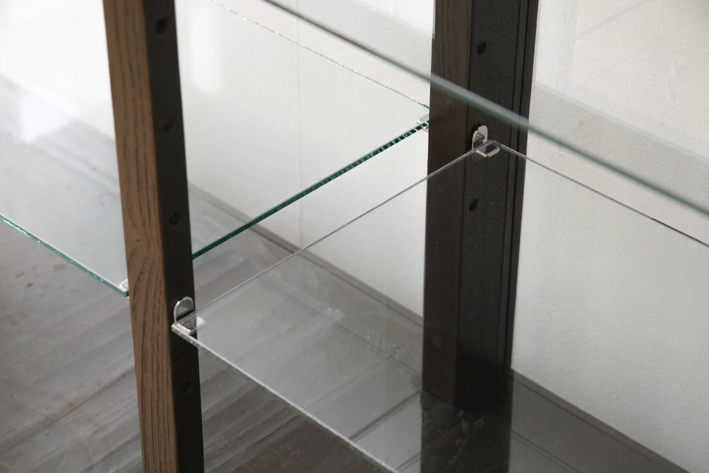 ガラスケースをリペア&カスタム!ガラス製棚板を取り付け、松本民芸家具の色味に近しい着色をし水性ワックス仕上げ。(ショーケース、陳列棚)