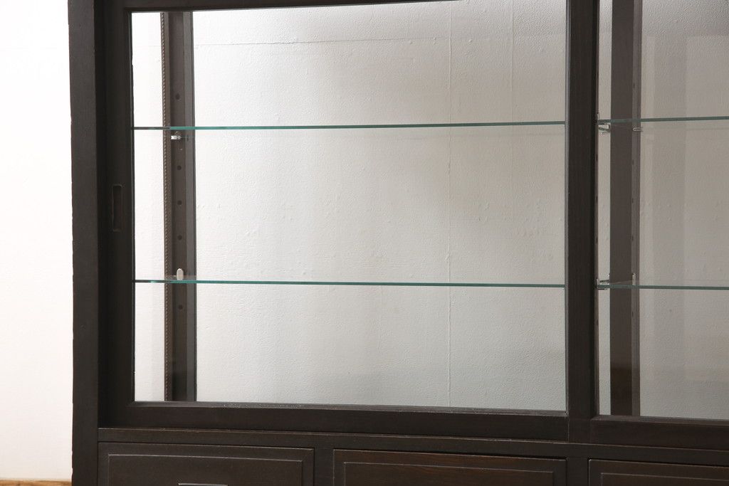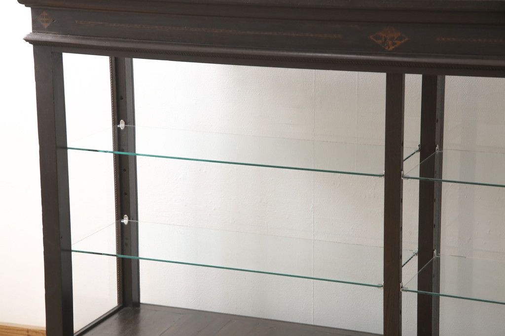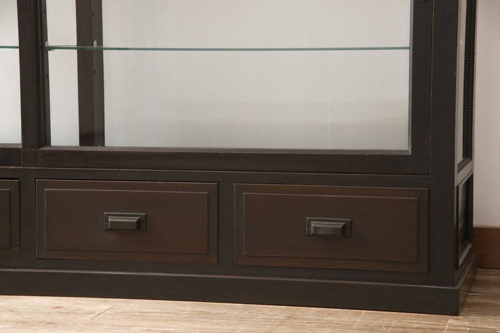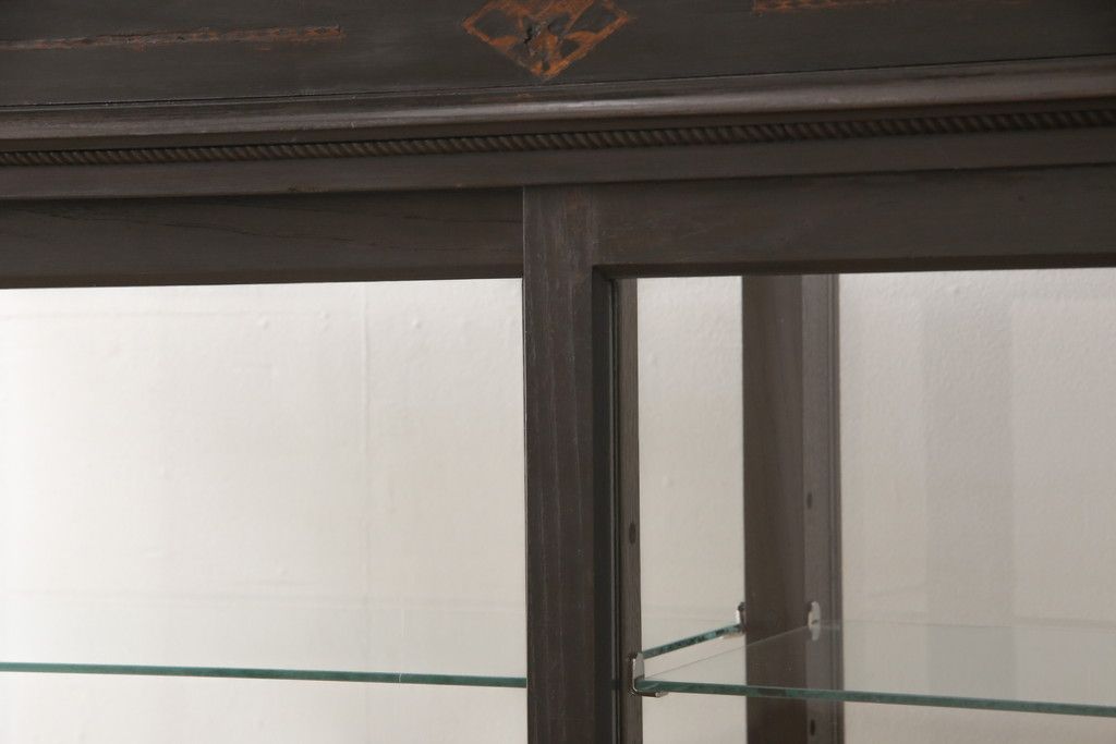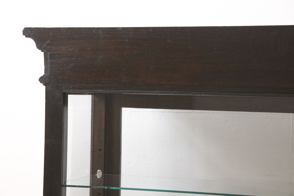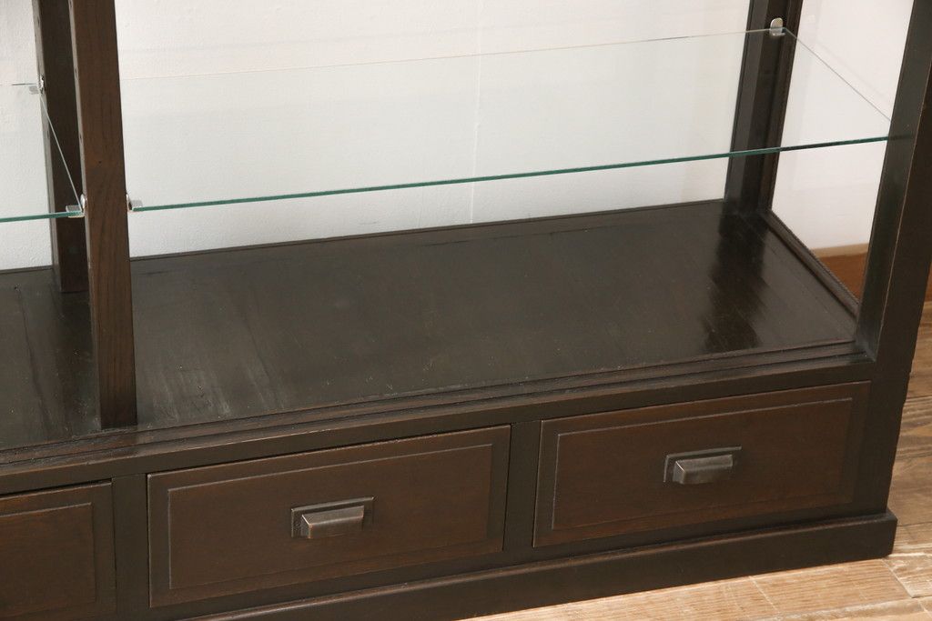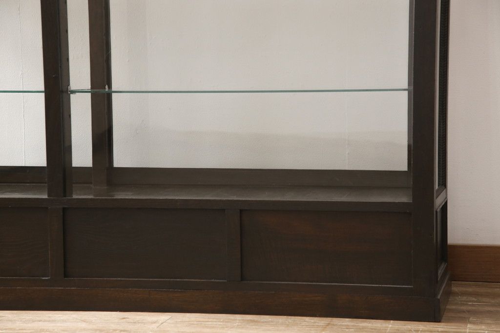 ガラスケースをリペア&カスタム!ガラス製棚板を取り付け、松本民芸家具の色味に近しい着色をし水性ワックス仕上げ。(ショーケース、陳列棚)
