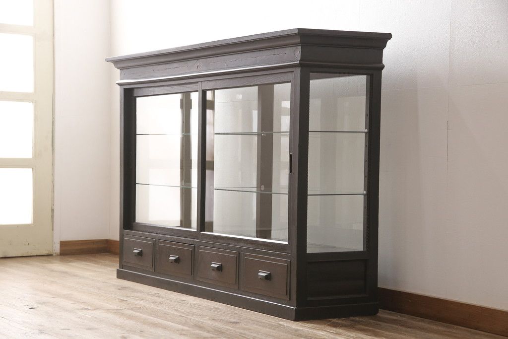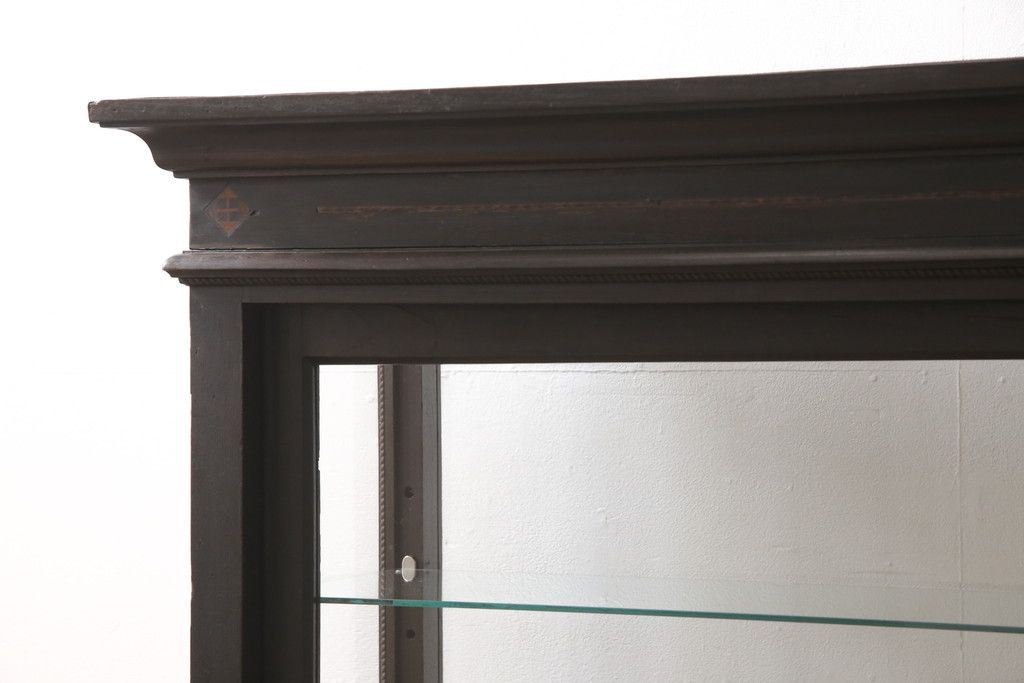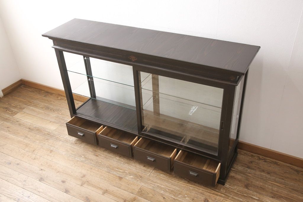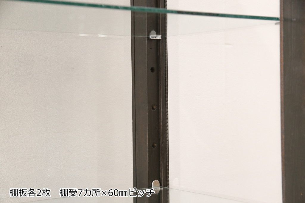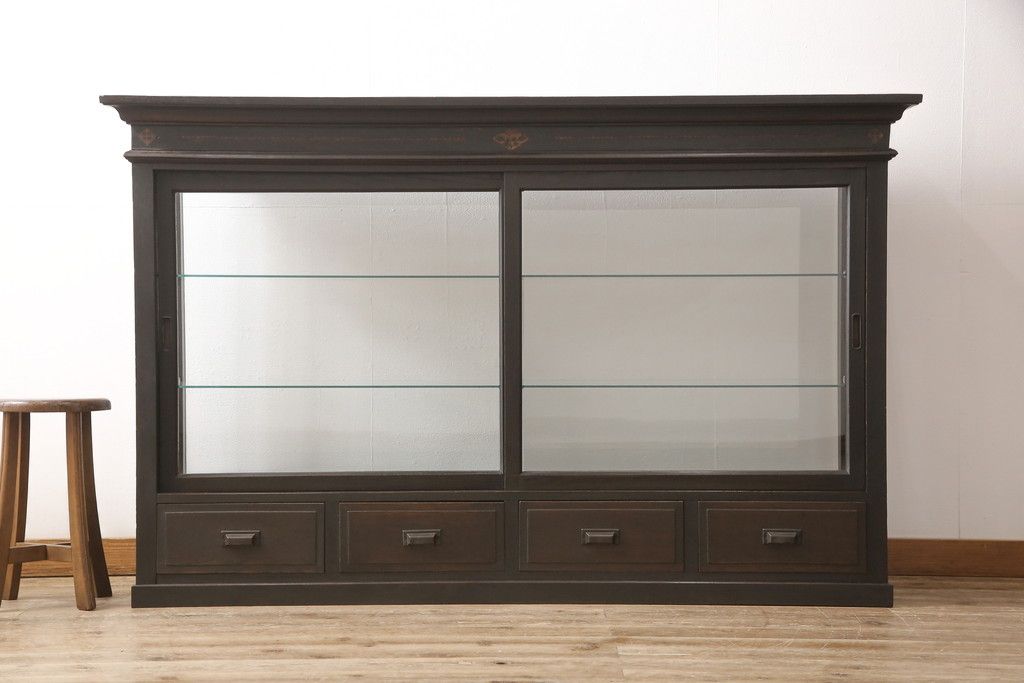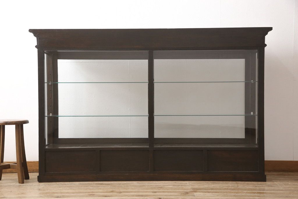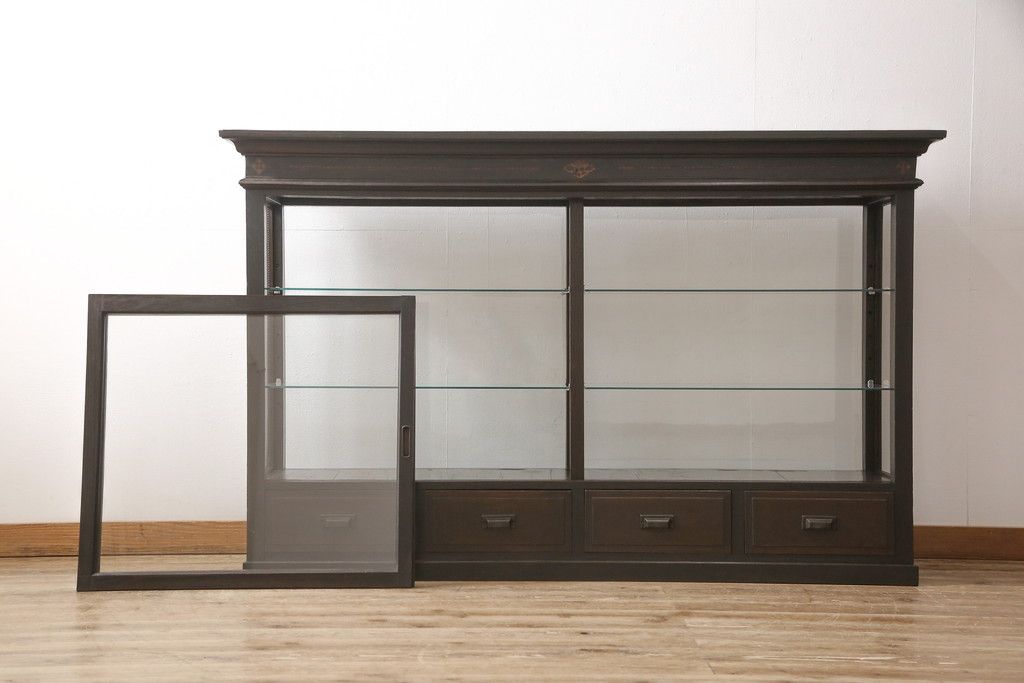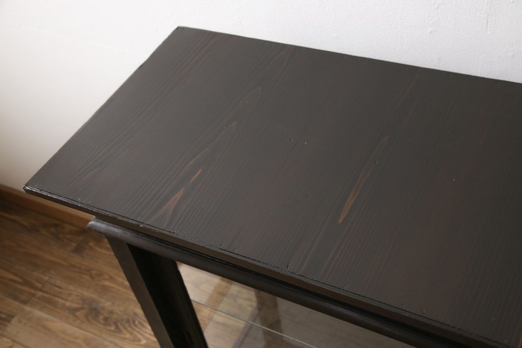 ガラスケースをリペア&カスタム!ガラス製棚板を取り付け、松本民芸家具の色味に近しい着色をし水性ワックス仕上げ。(ショーケース、陳列棚)