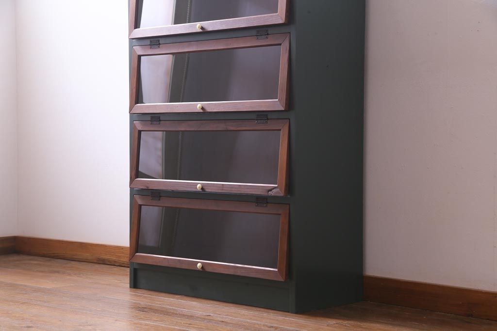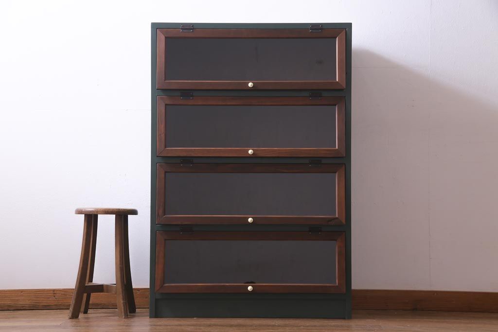 キャビネット・戸棚> 下駄箱 > パタパタ扉の収納棚を新規製作!扉にクリアガラス、明治大正期の松材を使用。本体をダークグリーンにペイントし、扉枠のブラウンとのツートンカラーに仕上げ。(戸棚、下駄箱、キャビネット、ロッカー、ブックケース)