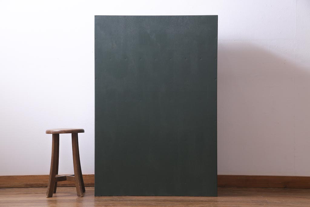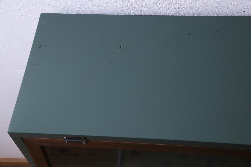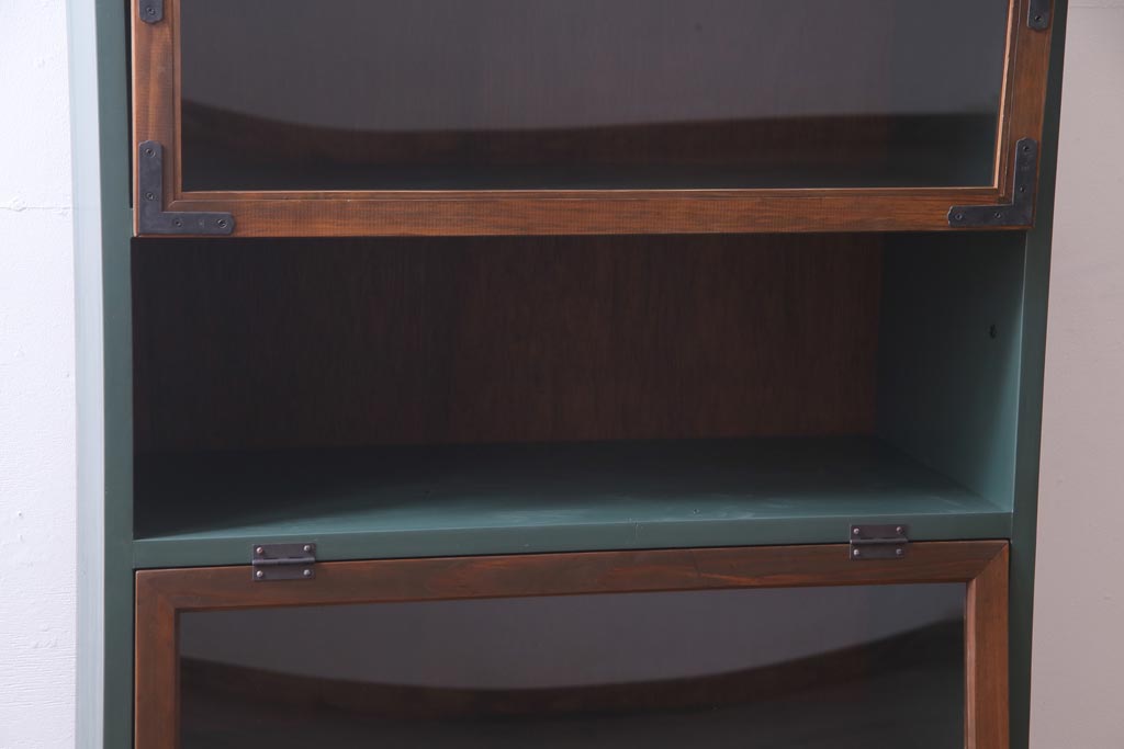 パタパタ扉の収納棚を新規製作!扉にクリアガラス、明治大正期の松材を使用。本体をダークグリーンにペイントし、扉枠のブラウンとのツートンカラーに仕上げ。(戸棚、下駄箱、キャビネット、ロッカー、ブックケース)