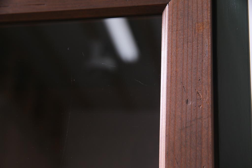 フルオーダー家具実績 > パタパタ扉の収納棚を新規製作!扉にクリアガラス、明治大正期の松材を使用。本体をダークグリーンにペイントし、扉枠のブラウンとのツートンカラーに仕上げ。(戸棚、下駄箱、キャビネット、ロッカー、ブックケース)