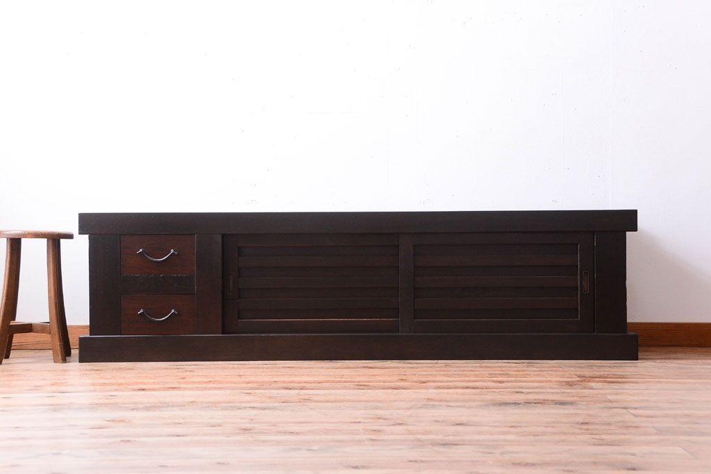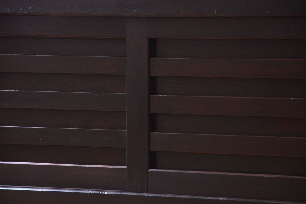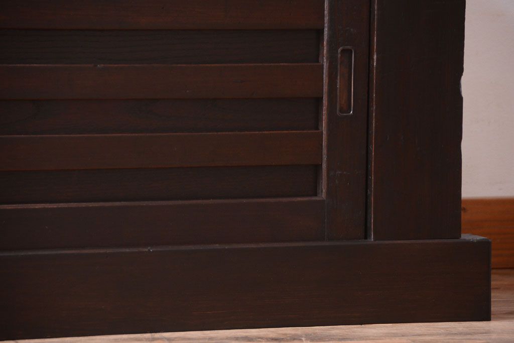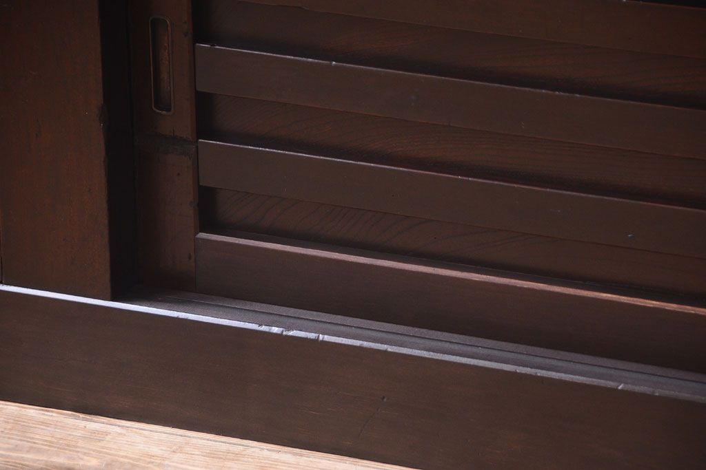 和箪笥> 水屋箪笥 > 明治大正期の水屋箪笥をリペア&カスタム!背面は新材に交換し、引き戸内に取り外し可能な棚板を設置。天板を取り付けローボードにリメイク。赤みがかった濃い茶色に着色し仕上げ。(テレビ台、テレビボード、収納棚、戸棚、キャビネット)