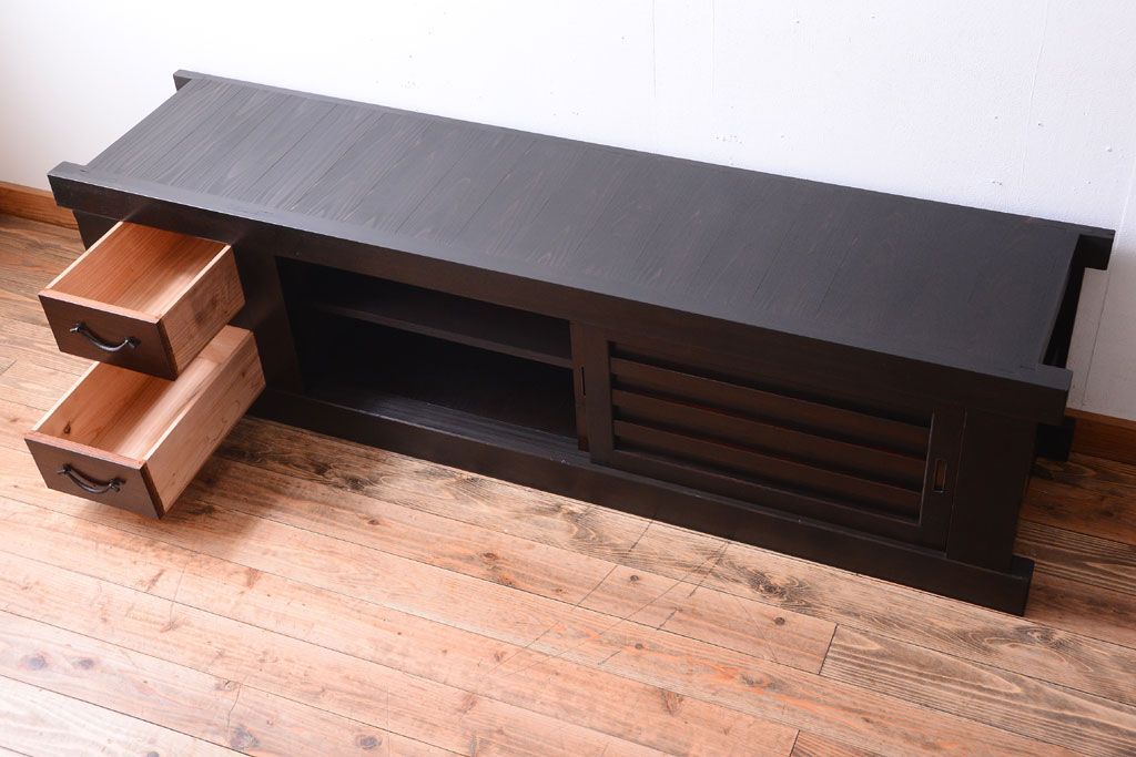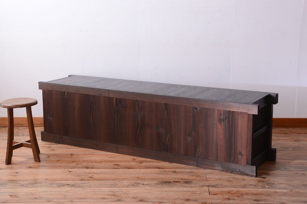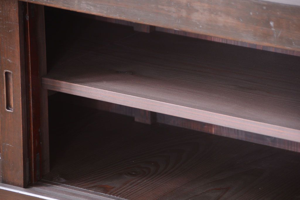 キャビネット・戸棚> テレビ台・ローボード > 明治大正期の水屋箪笥をリペア&カスタム!背面は新材に交換し、引き戸内に取り外し可能な棚板を設置。天板を取り付けローボードにリメイク。赤みがかった濃い茶色に着色し仕上げ。(テレビ台、テレビボード、収納棚、戸棚、キャビネット)