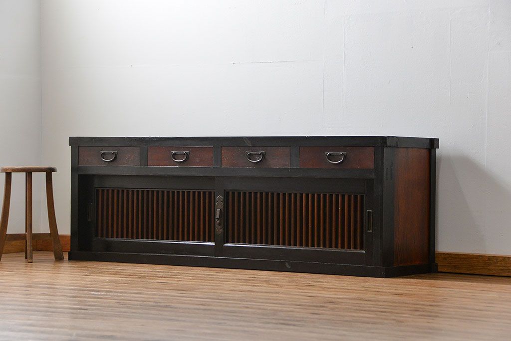 明治期の水屋箪笥をリペア&カスタム!天板を取り付け、棚板を追加しローボードにリメイク。黒系の茶色と赤系の茶色のツートンカラーに着色し仕上げ。(テレビ台、テレビボード、収納棚、キャビネット)