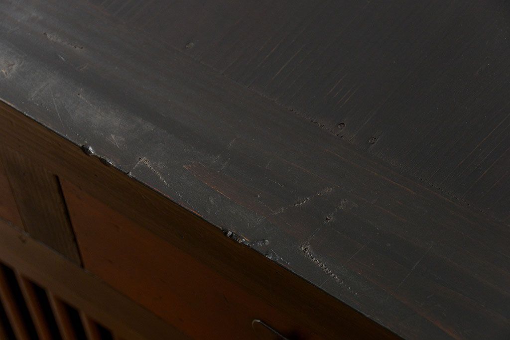 古家具> 古家具-チェスト・箪笥 > 明治期の水屋箪笥をリペア&カスタム!天板を取り付け、棚板を追加しローボードにリメイク。黒系の茶色と赤系の茶色のツートンカラーに着色し仕上げ。(テレビ台、テレビボード、収納棚、キャビネット)