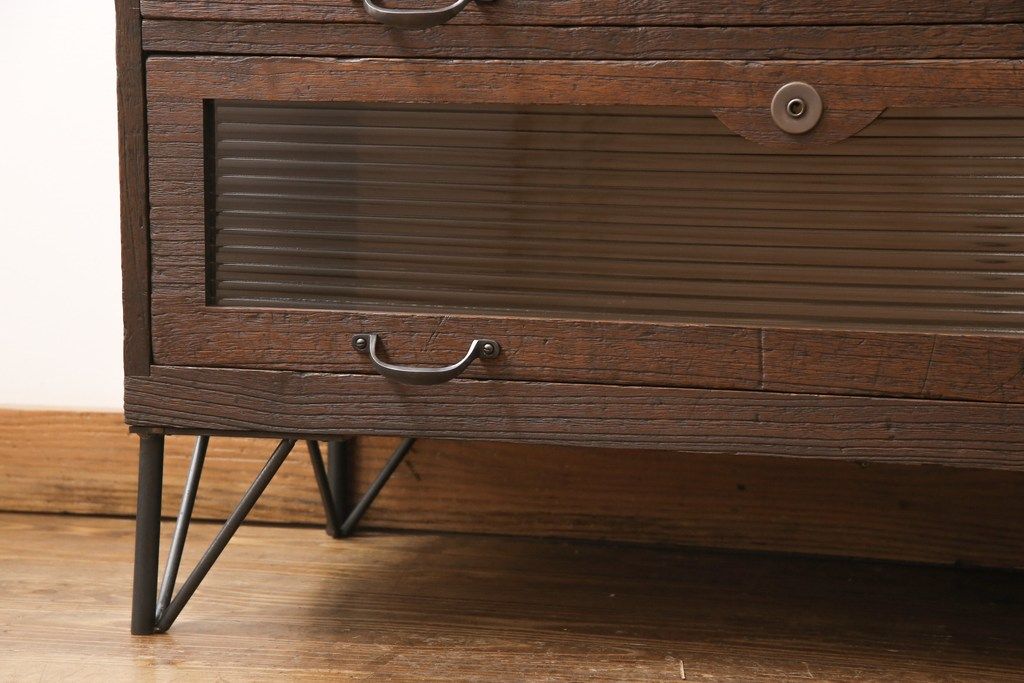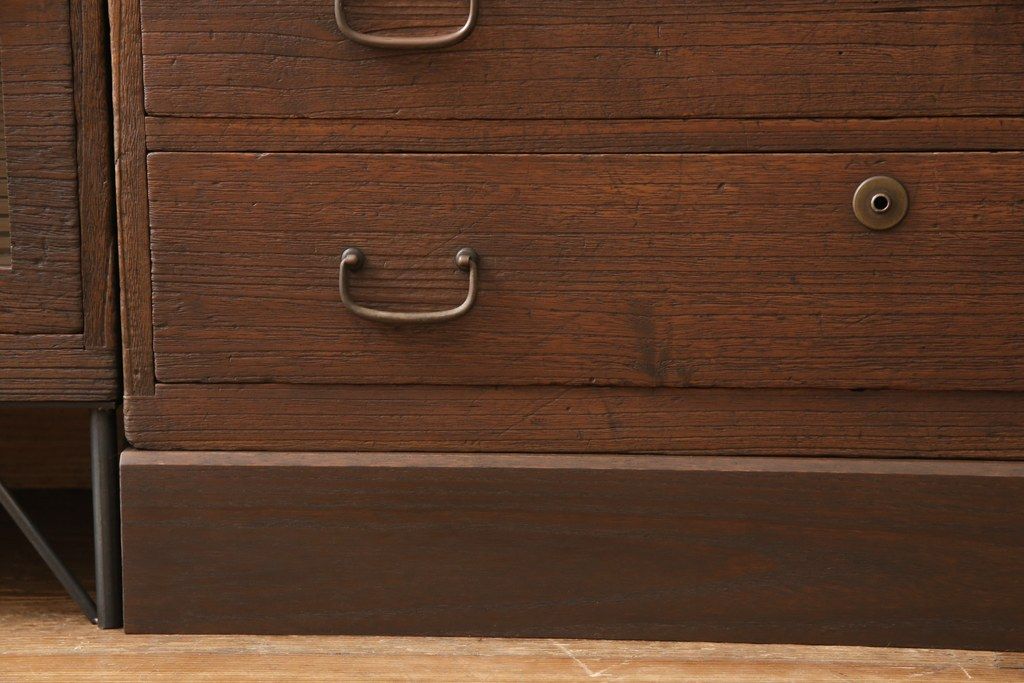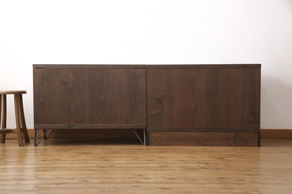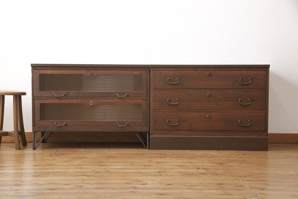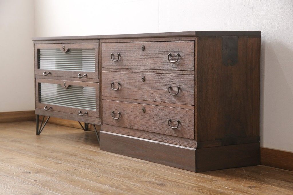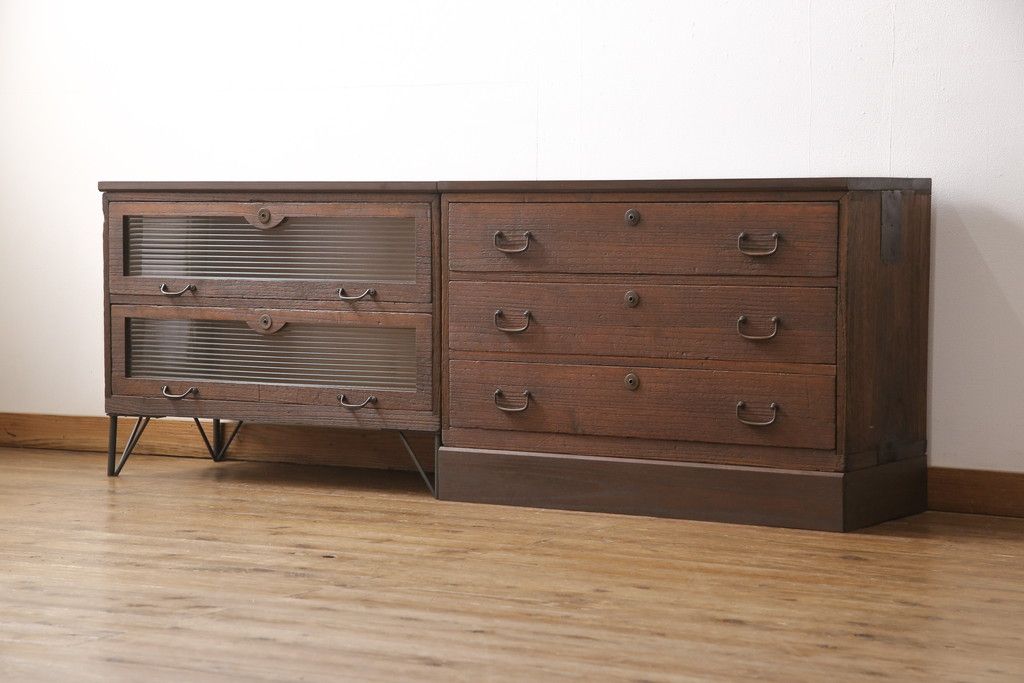 セミオーダー家具実績 > 重ね桐箪笥をリペア&カスタム!片方は鉄脚を取り付け、引き出しの前板にモールガラスを取り付け。片方は台輪と天板を取り付け。2台をローボードとして並べて使えるよう高さを調整。どちらも現状の色味を生かした濃い茶色で着色し仕上げ。(テレビ台、テレビボード、リビングボード)