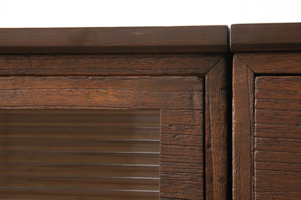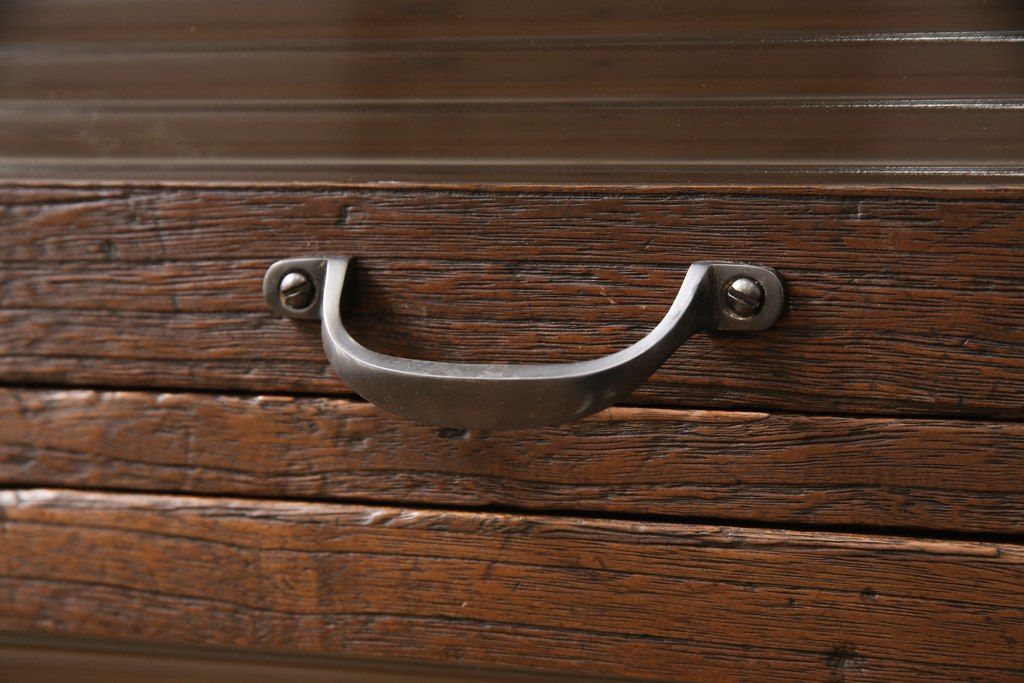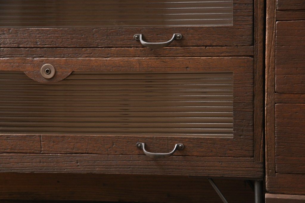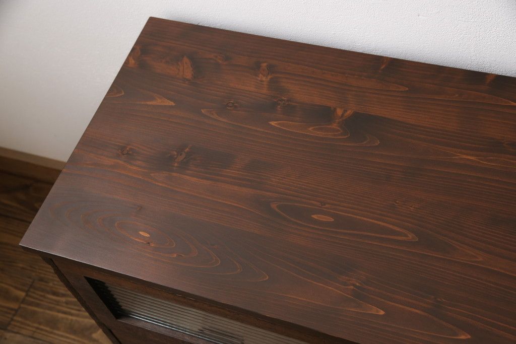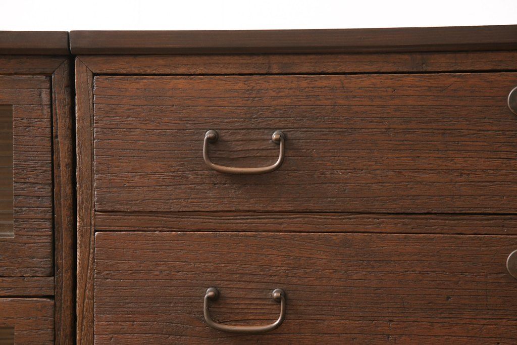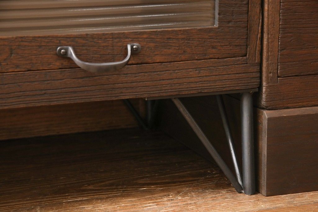 セミオーダー家具実績 > 重ね桐箪笥をリペア&カスタム!片方は鉄脚を取り付け、引き出しの前板にモールガラスを取り付け。片方は台輪と天板を取り付け。2台をローボードとして並べて使えるよう高さを調整。どちらも現状の色味を生かした濃い茶色で着色し仕上げ。(テレビ台、テレビボード、リビングボード)