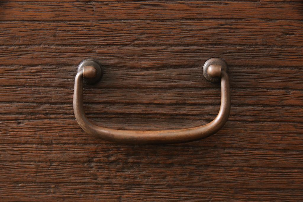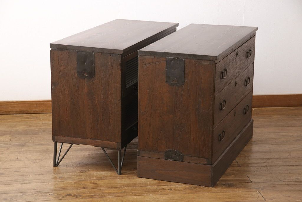 キャビネット・戸棚> テレビ台・ローボード > 重ね桐箪笥をリペア&カスタム!片方は鉄脚を取り付け、引き出しの前板にモールガラスを取り付け。片方は台輪と天板を取り付け。2台をローボードとして並べて使えるよう高さを調整。どちらも現状の色味を生かした濃い茶色で着色し仕上げ。(テレビ台、テレビボード、リビングボード)