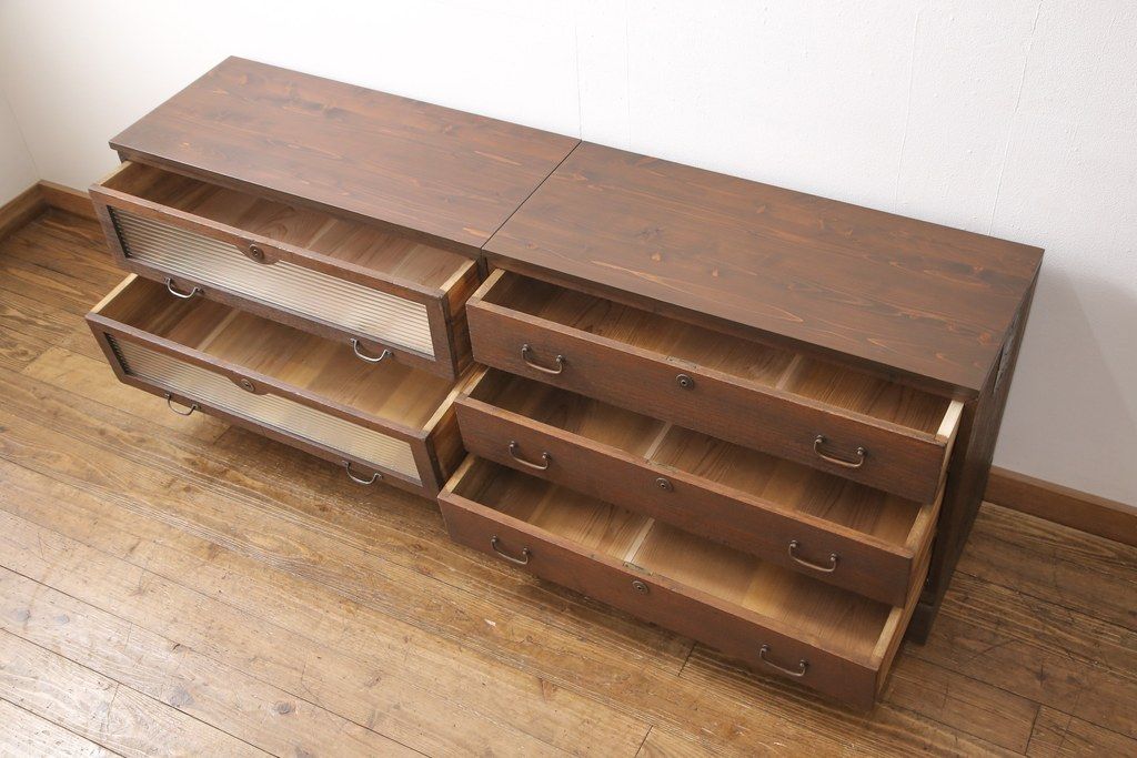 チェスト・引き出し> ローチェスト > 重ね桐箪笥をリペア&カスタム!片方は鉄脚を取り付け、引き出しの前板にモールガラスを取り付け。片方は台輪と天板を取り付け。2台をローボードとして並べて使えるよう高さを調整。どちらも現状の色味を生かした濃い茶色で着色し仕上げ。(テレビ台、テレビボード、リビングボード)