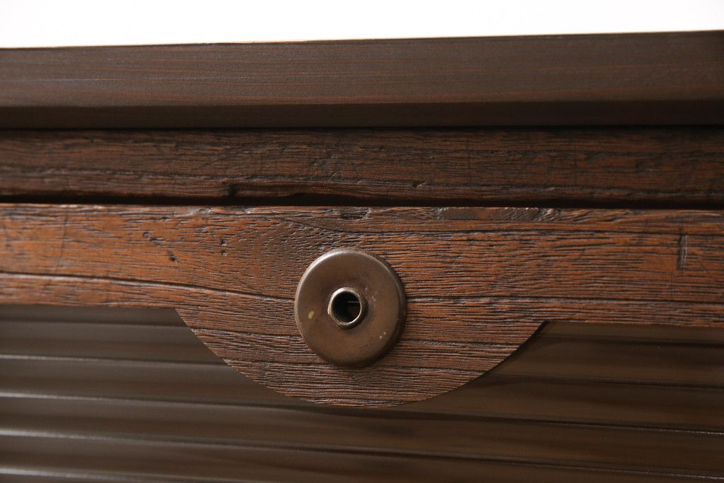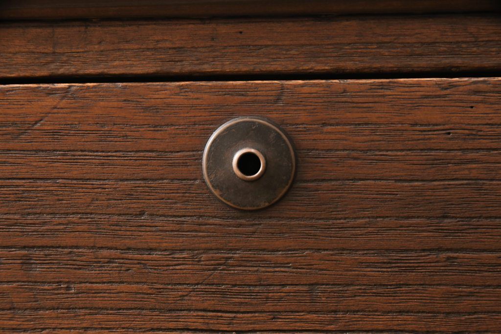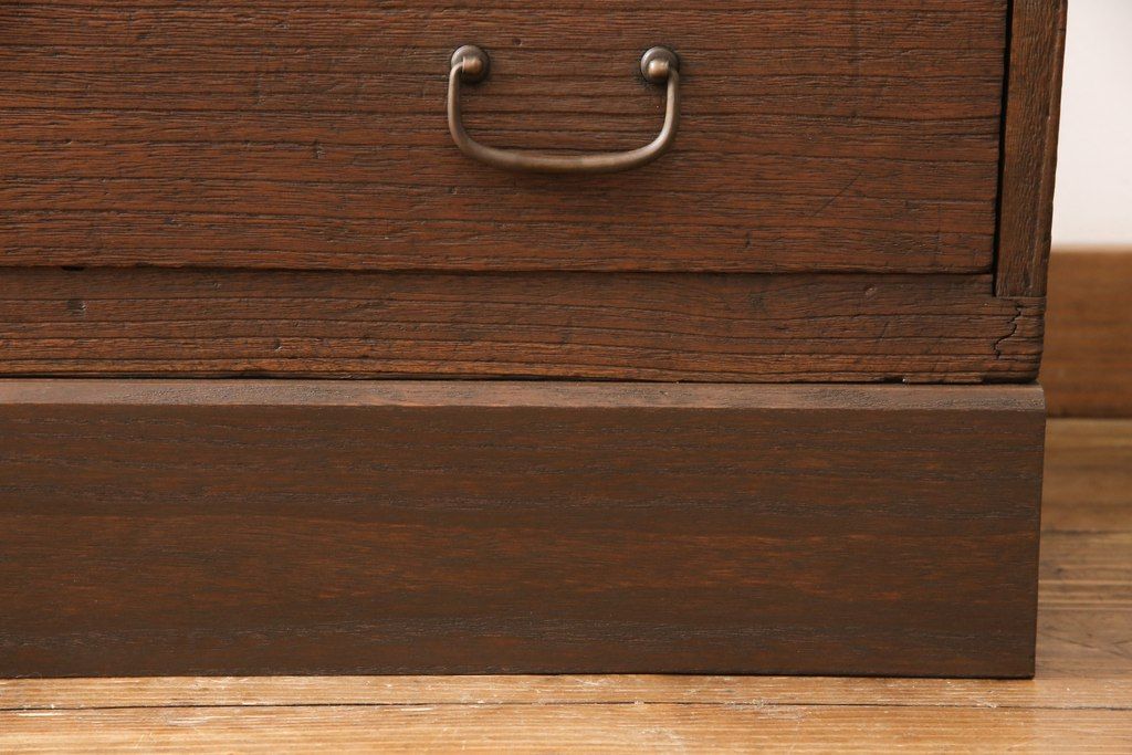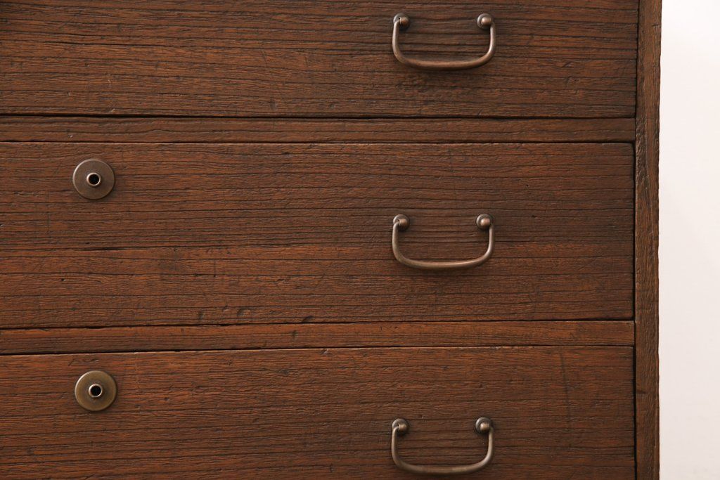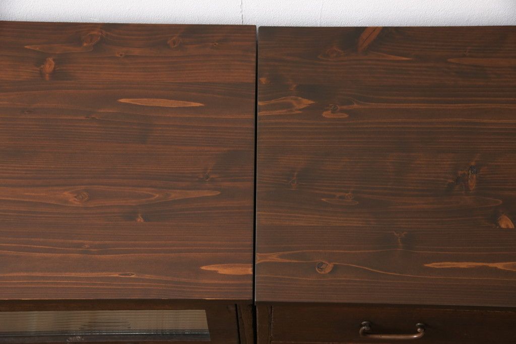 和箪笥 > 重ね桐箪笥をリペア&カスタム!片方は鉄脚を取り付け、引き出しの前板にモールガラスを取り付け。片方は台輪と天板を取り付け。2台をローボードとして並べて使えるよう高さを調整。どちらも現状の色味を生かした濃い茶色で着色し仕上げ。(テレビ台、テレビボード、リビングボード)