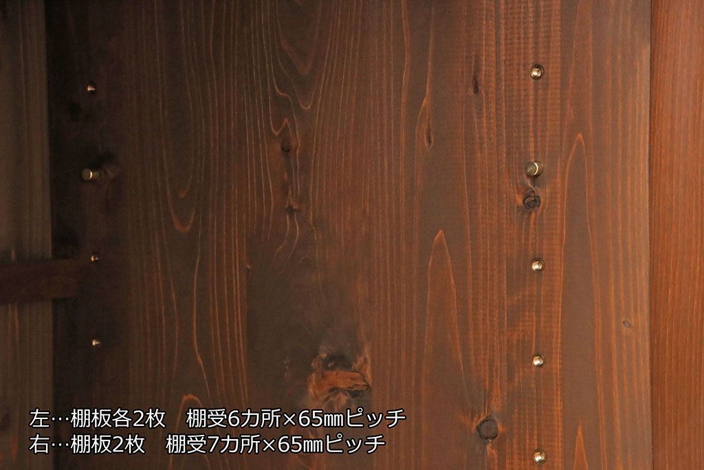 棚板は取り外しできます。棚板は左右各2枚あります。棚受けは左は6ヶ所、右は7ヶ所、各65mmピッチで調整できます。棚幅サイズのものが1枚の作りです。