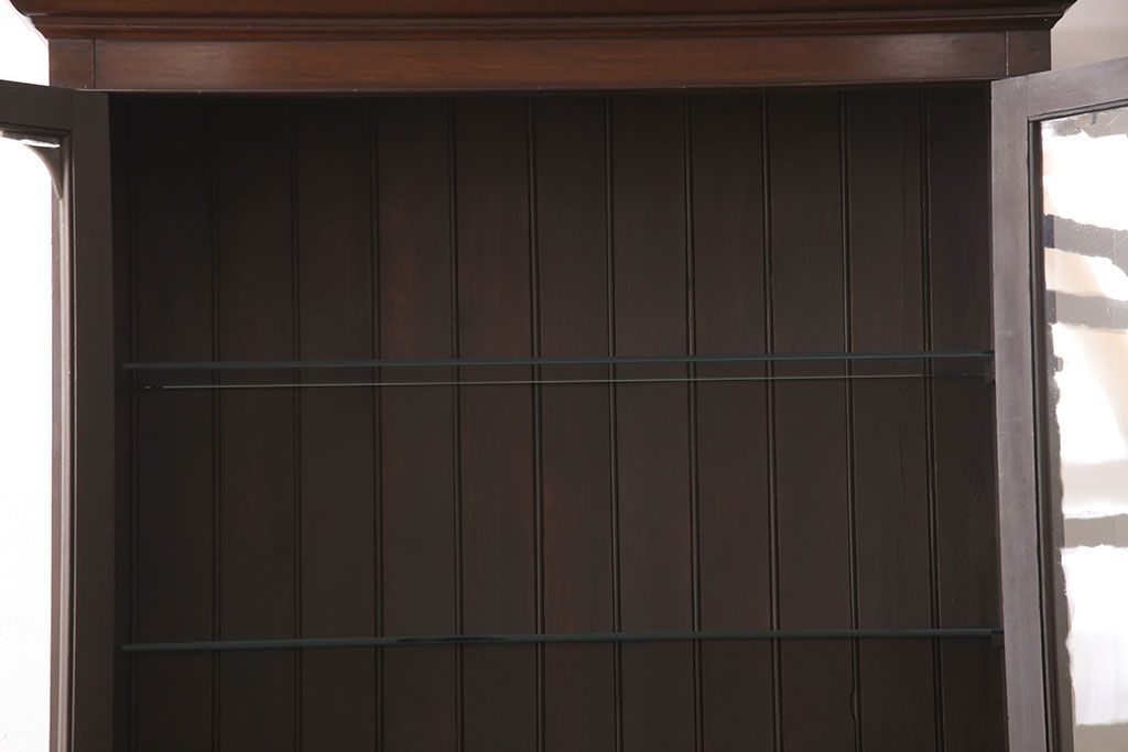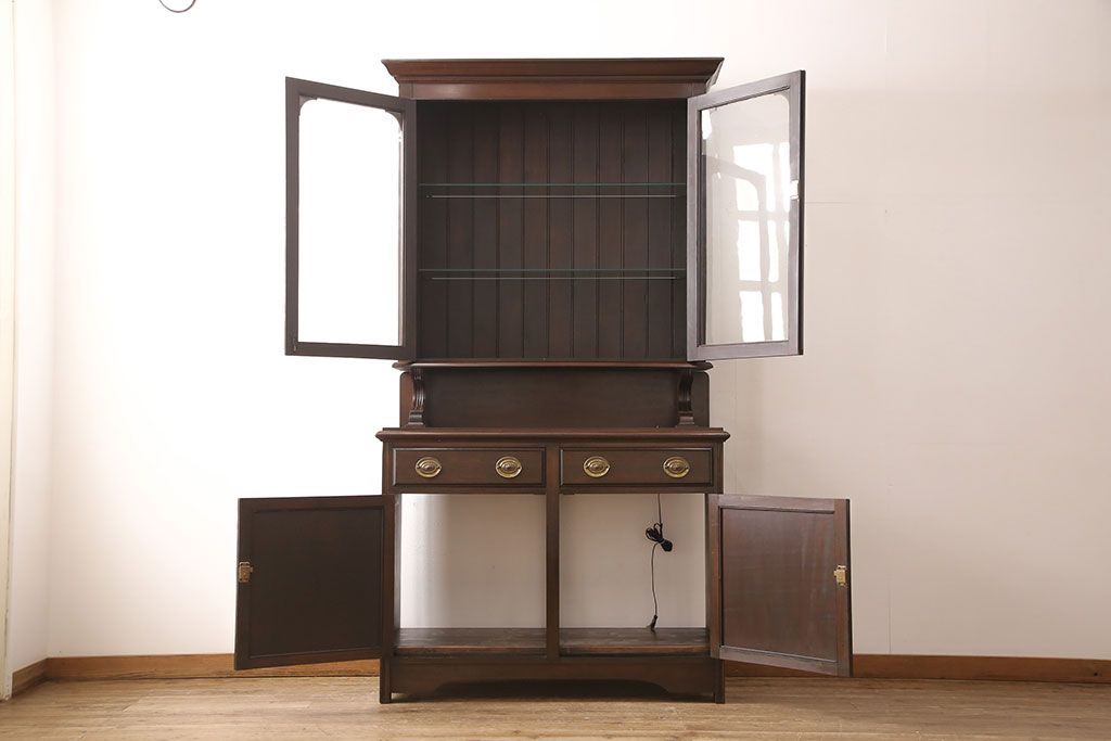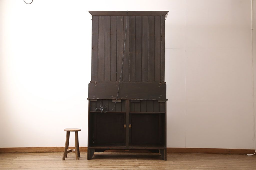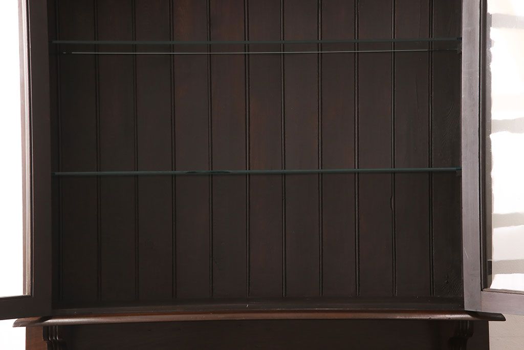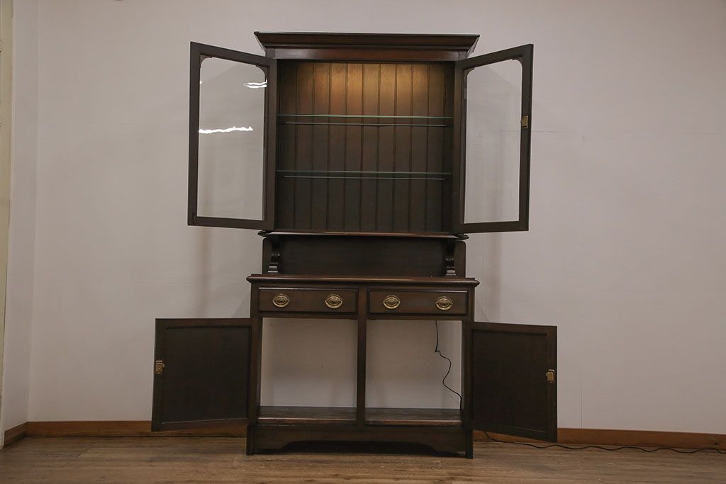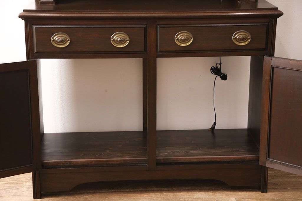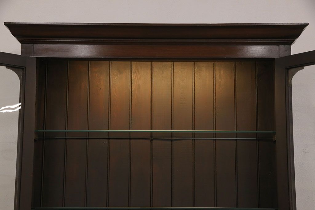 イギリスアンティークのカップボードをリペア&カスタム!棚板をガラス棚板に変更し、照明を取り付け。下段は棚板と背板を取り外し。(カップボード、陳列棚)