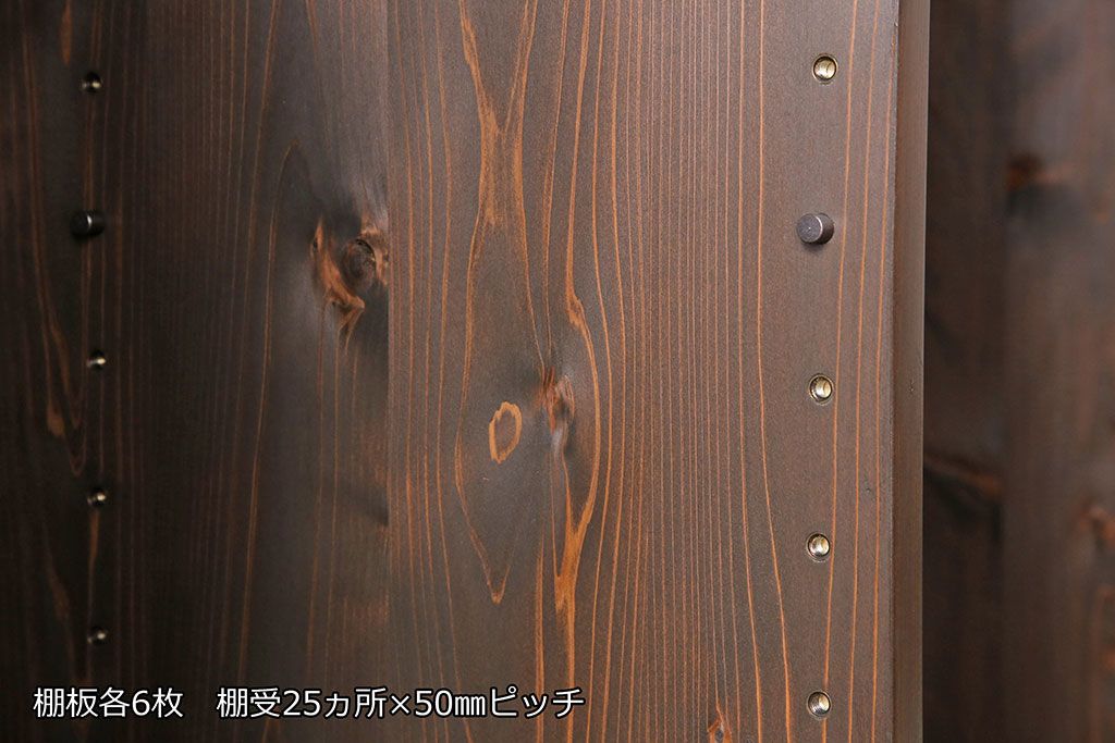 棚板は取り外しできます。棚板は左右各6枚あります。棚受けは25ヶ所50mmピッチで調整できます。棚幅サイズのものが1枚の作りです。