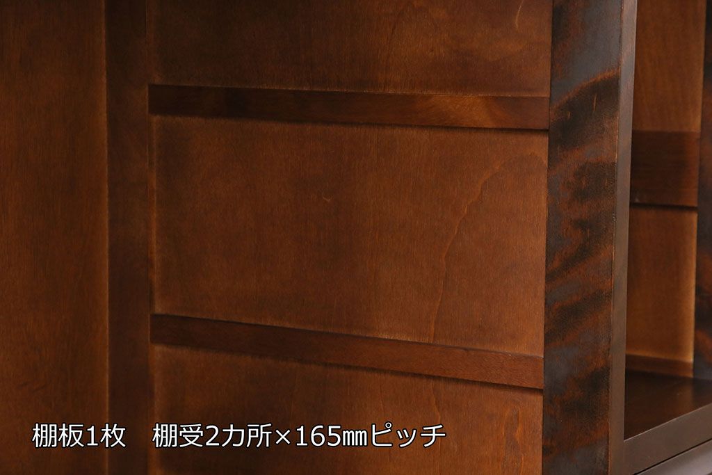 棚板は取り外しできます。棚板は3枚あります。棚受けは中央の棚のみ2ヶ所、165mmピッチで調整できます。棚幅サイズのものが1枚の作りです。