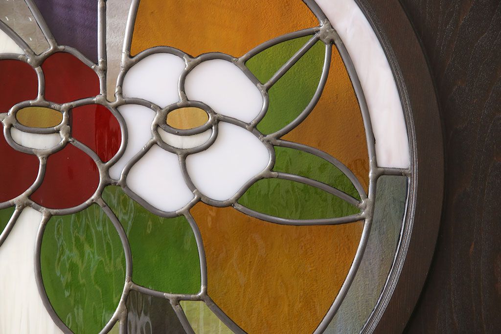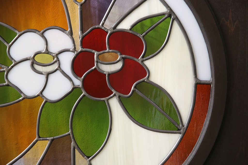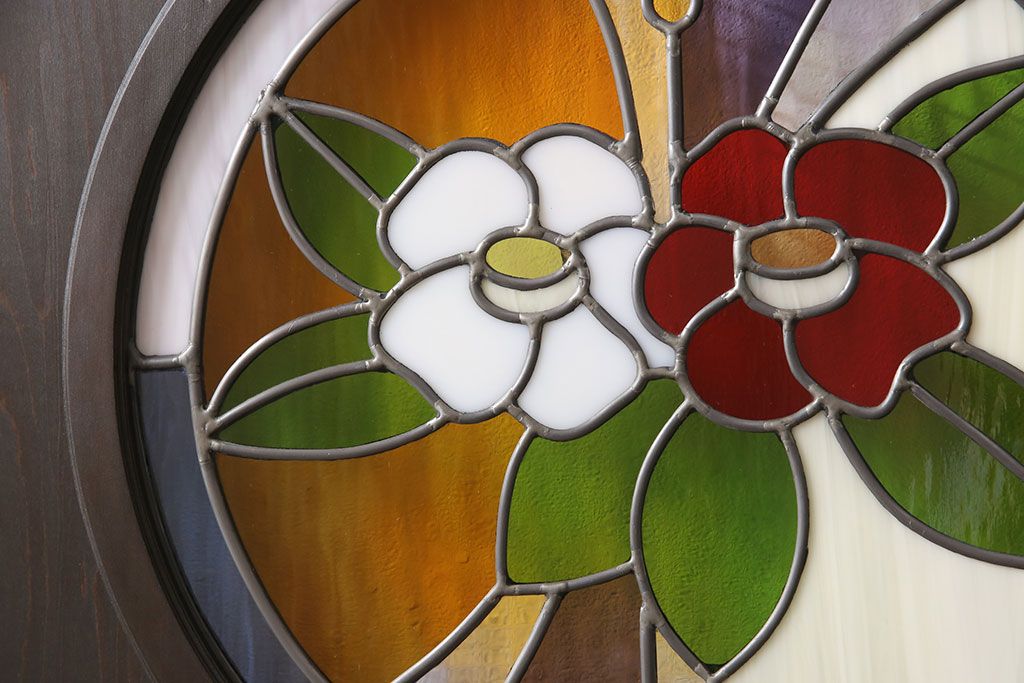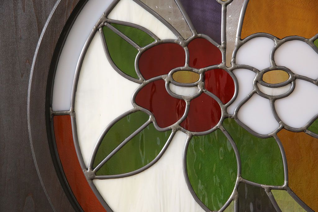 ステンドグラス > ステンドグラス入り引き戸を新規製作!お客様のデザインを元にステンドグラスを制作。木部はモールディングを施し、クラシカルな仕上がりに。(玄関戸、引き違い戸)