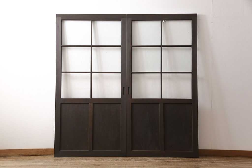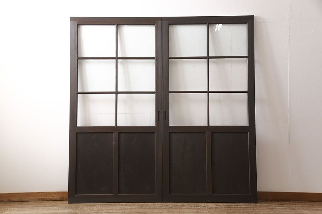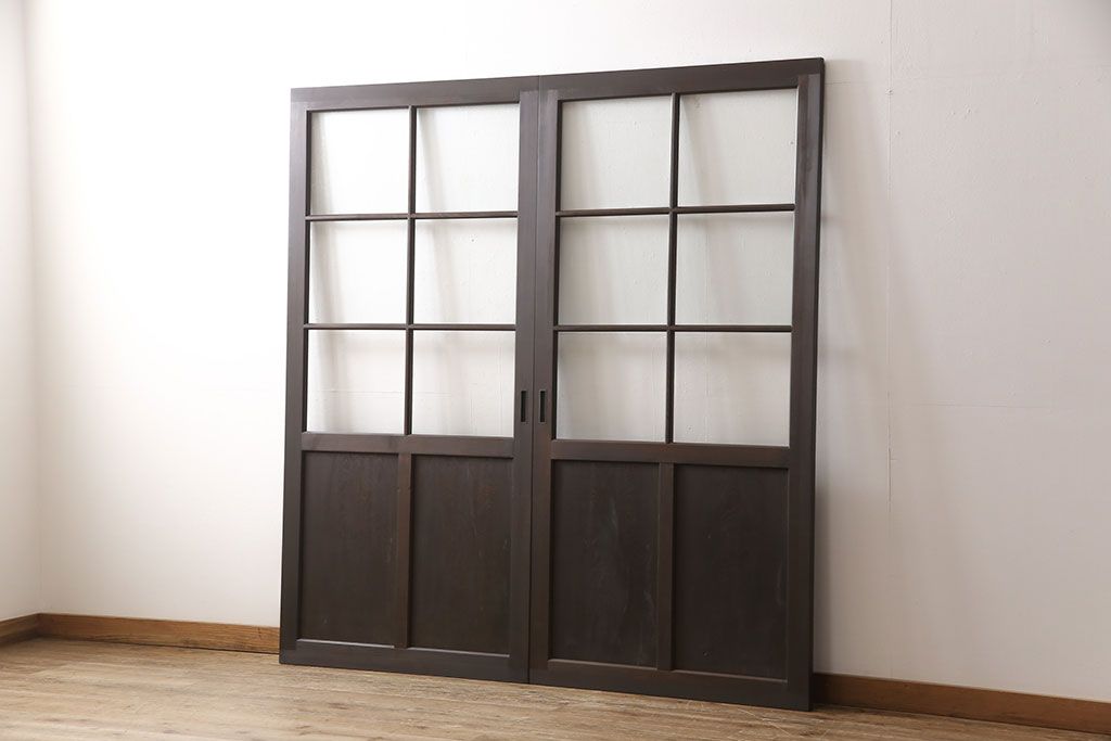 ドア・建具> ガラス戸 > ガラス戸2枚をリペア&カスタム!新材を継ぎ足し高さと幅を大きくリサイズ。引手・戸車を追加し、ガラス部分はゆらゆらガラスを使用。濃い茶色に着色仕上げ。(引き戸)