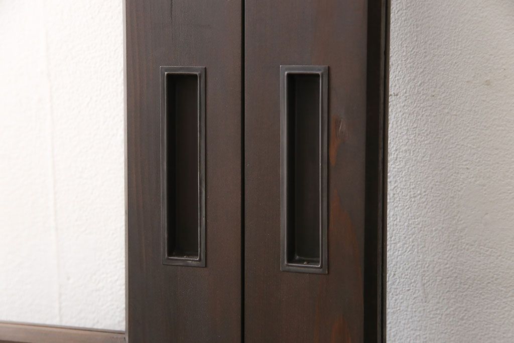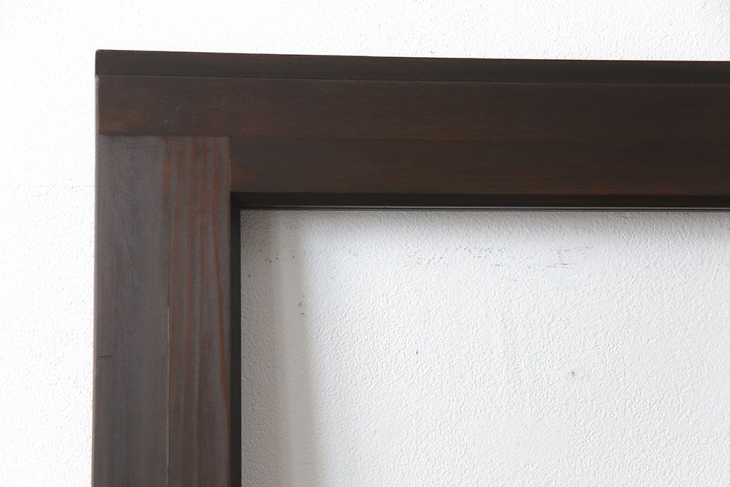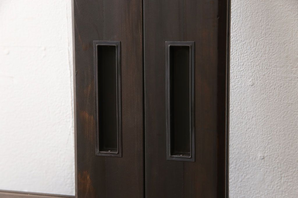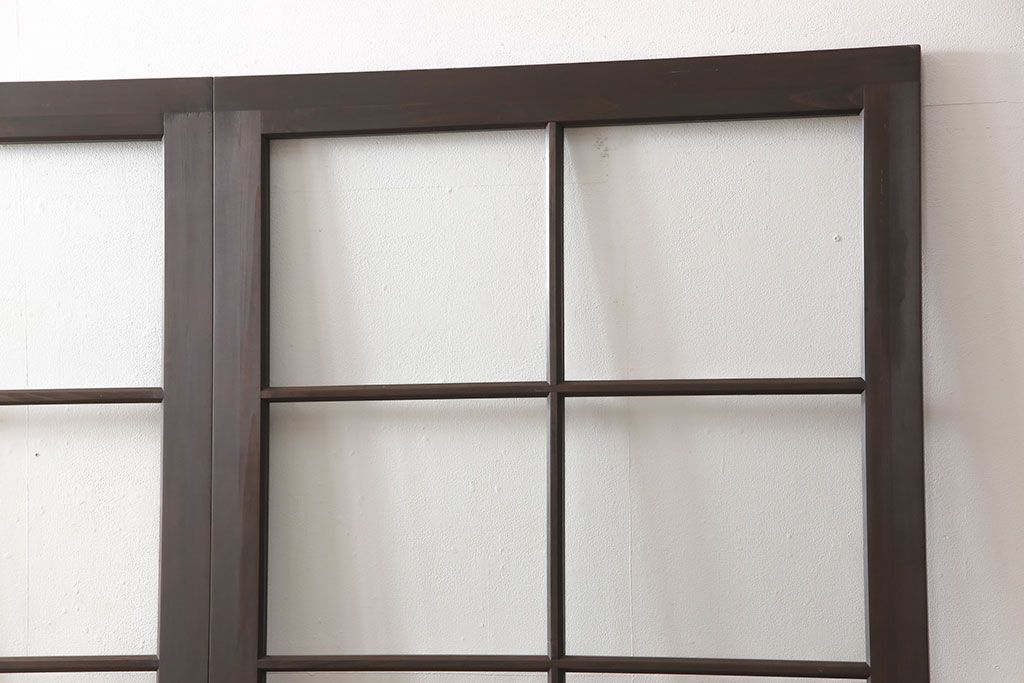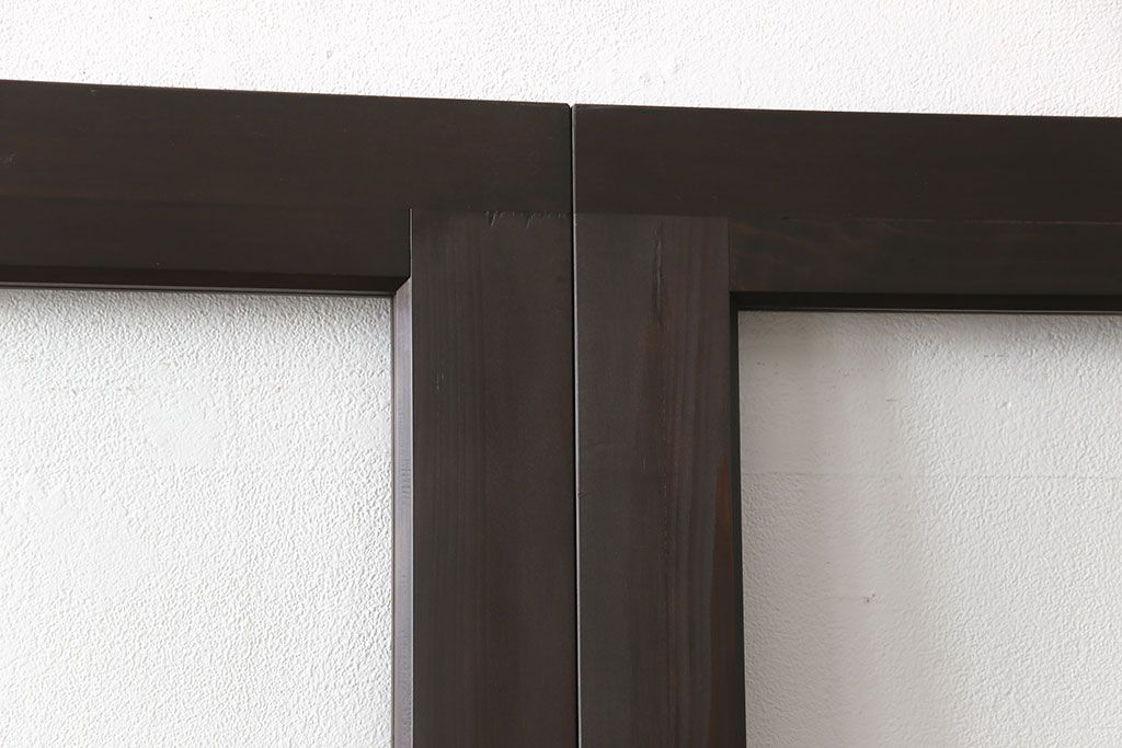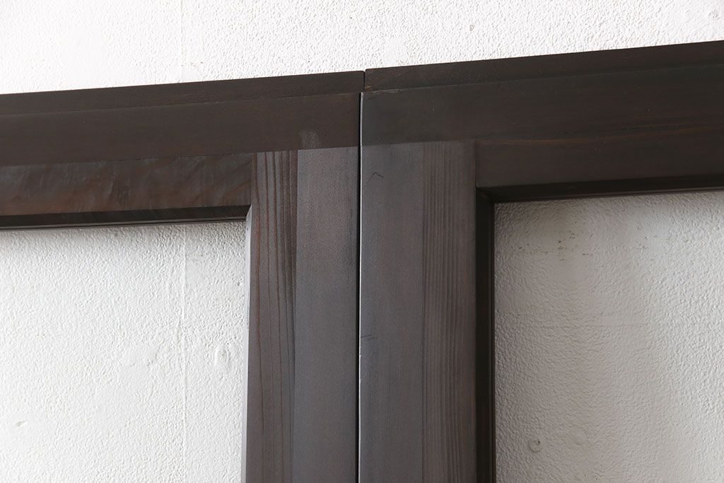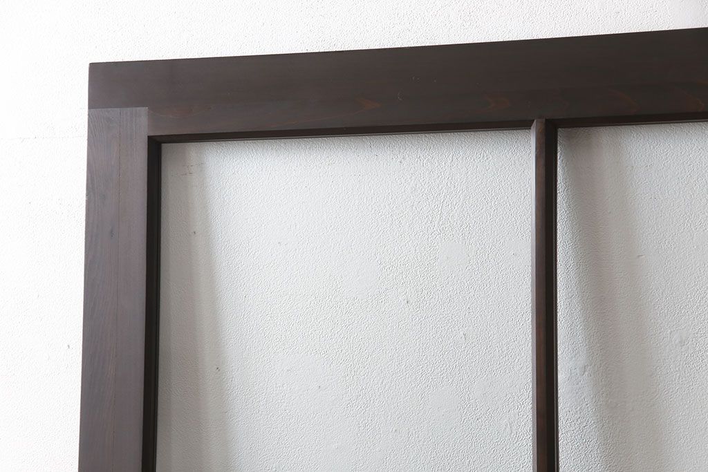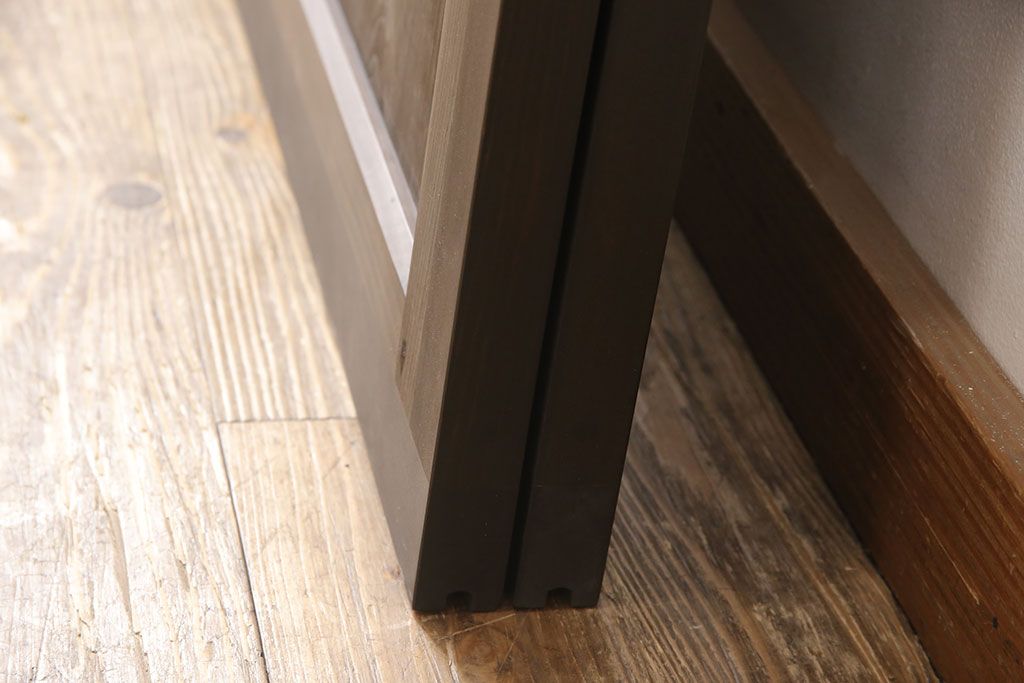 セミオーダー家具実績 > ガラス戸2枚をリペア&カスタム!新材を継ぎ足し高さと幅を大きくリサイズ。引手・戸車を追加し、ガラス部分はゆらゆらガラスを使用。濃い茶色に着色仕上げ。(引き戸)