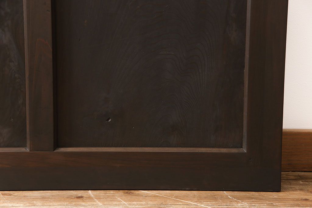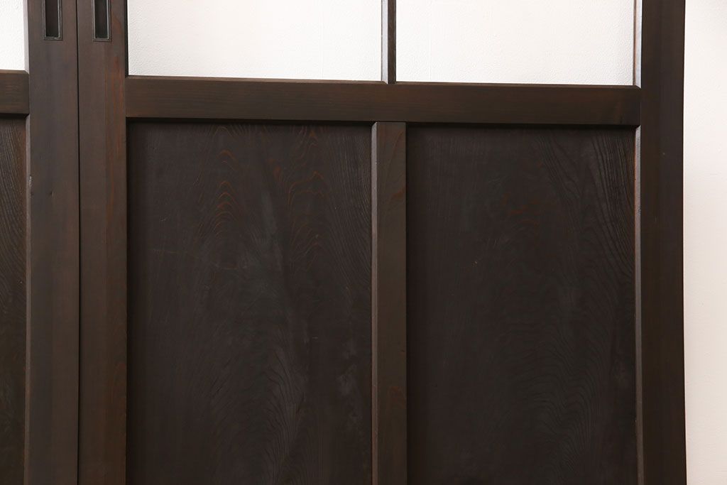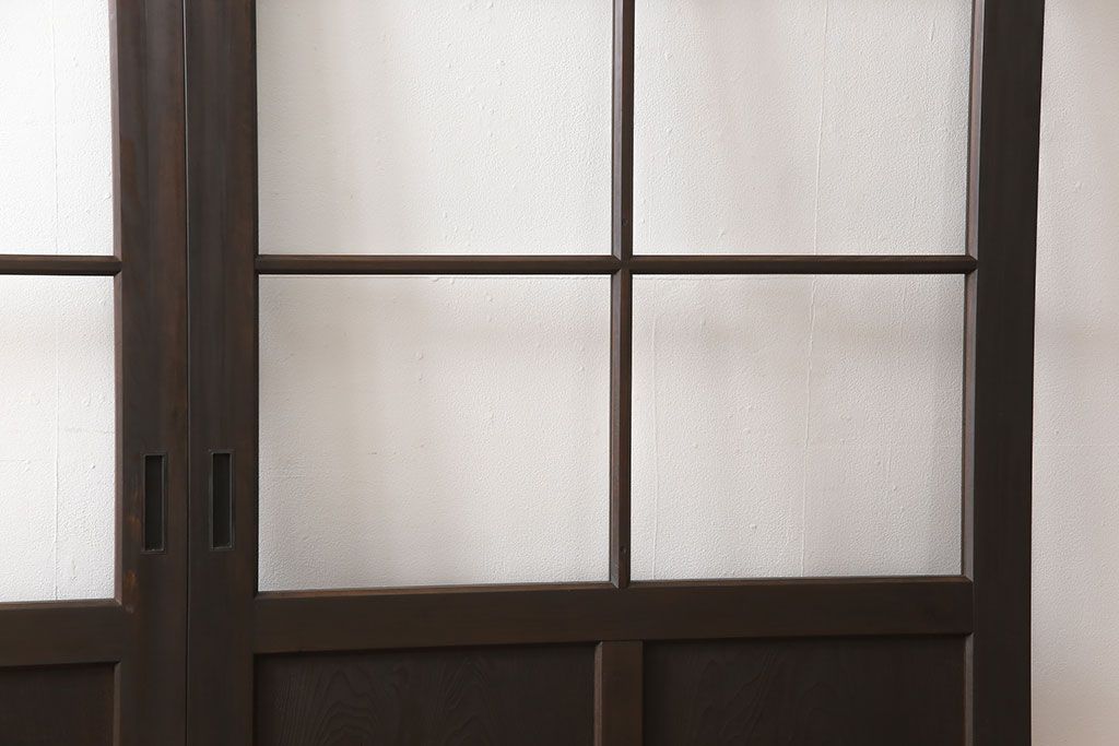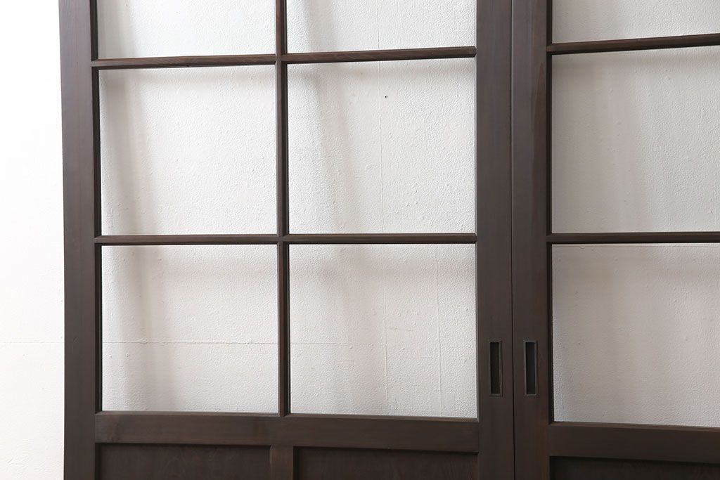 ドア・建具> 引き戸 > ガラス戸2枚をリペア&カスタム!新材を継ぎ足し高さと幅を大きくリサイズ。引手・戸車を追加し、ガラス部分はゆらゆらガラスを使用。濃い茶色に着色仕上げ。(引き戸)