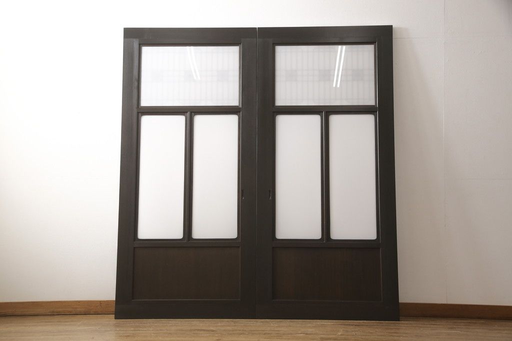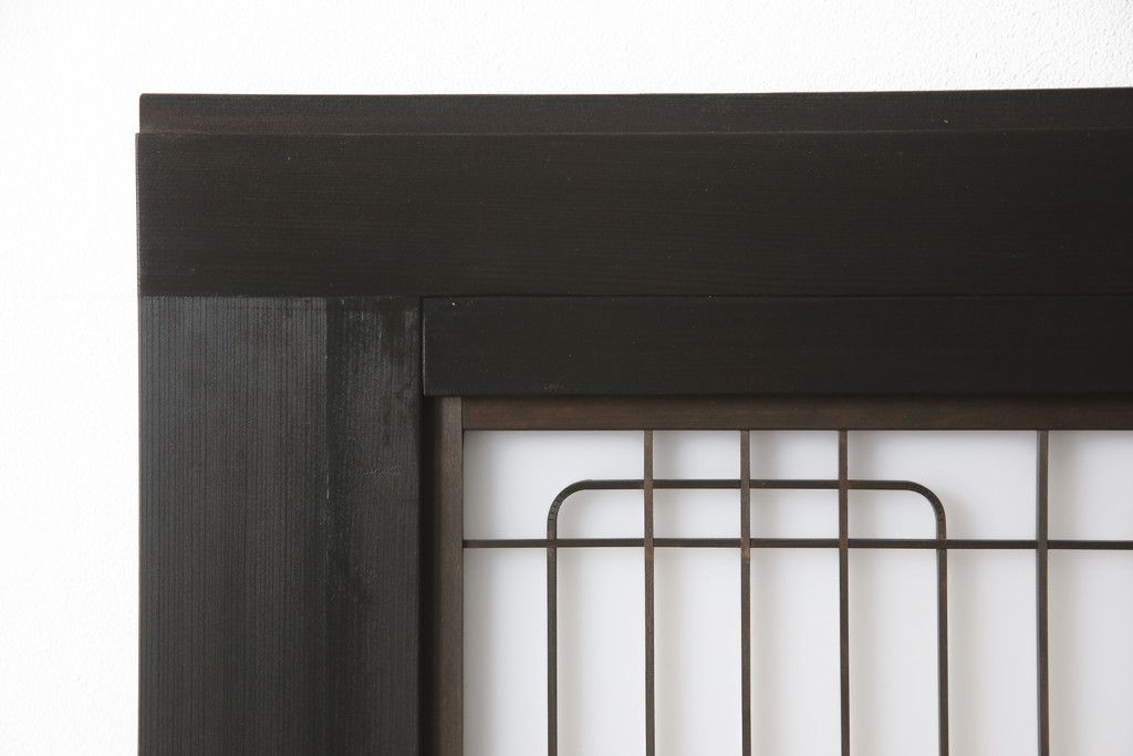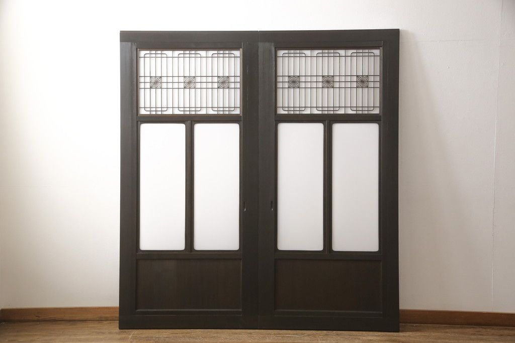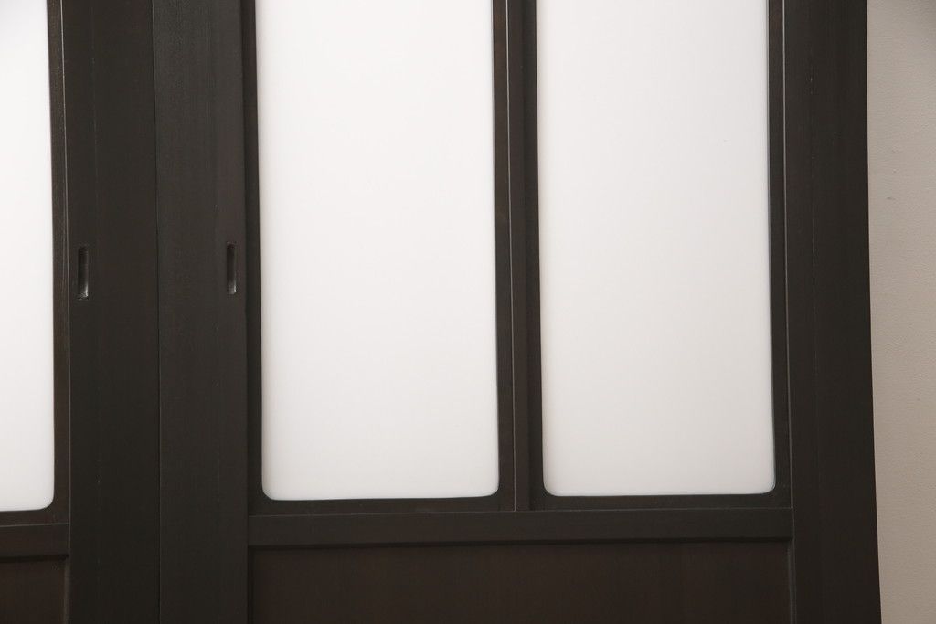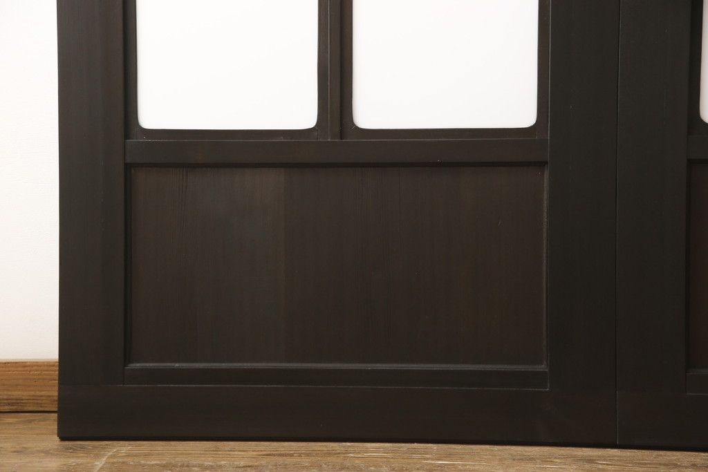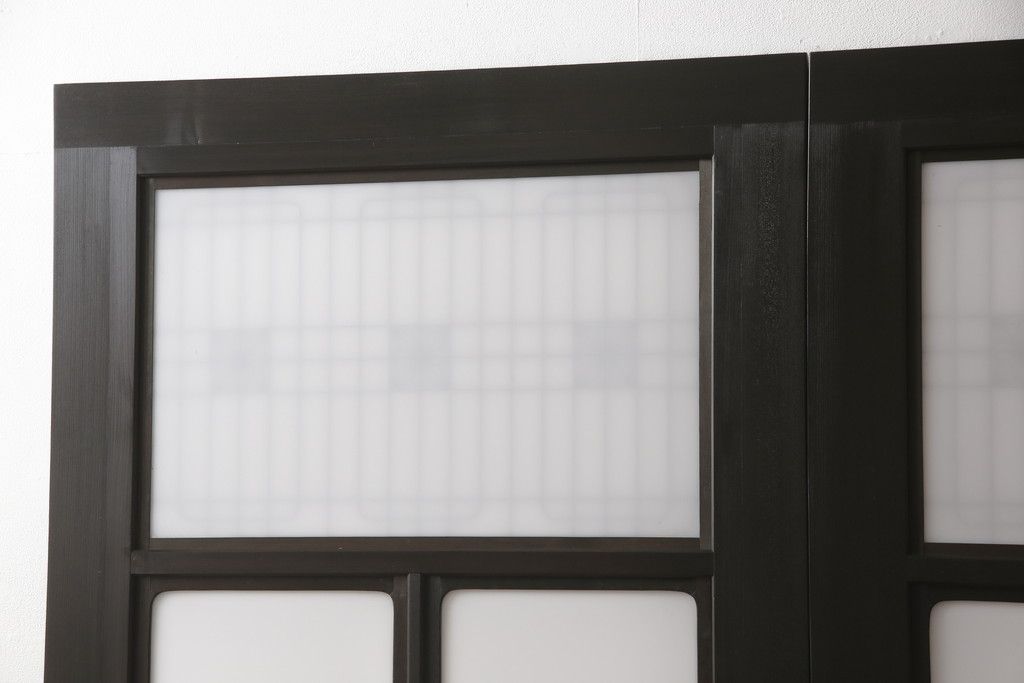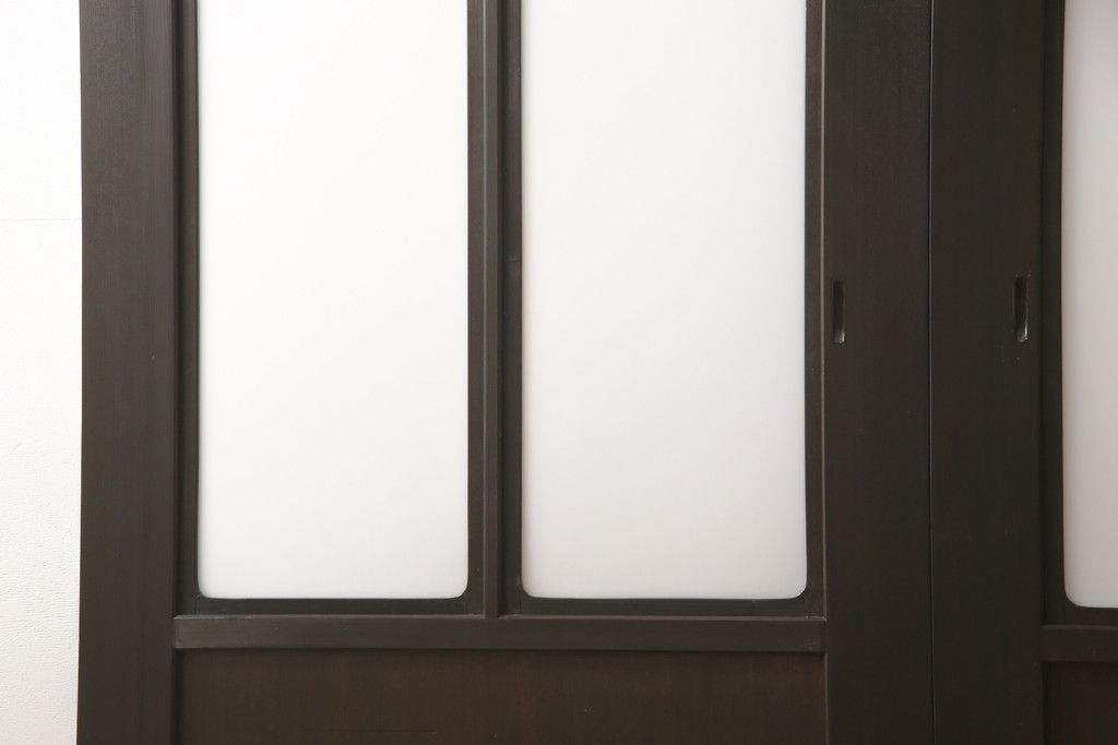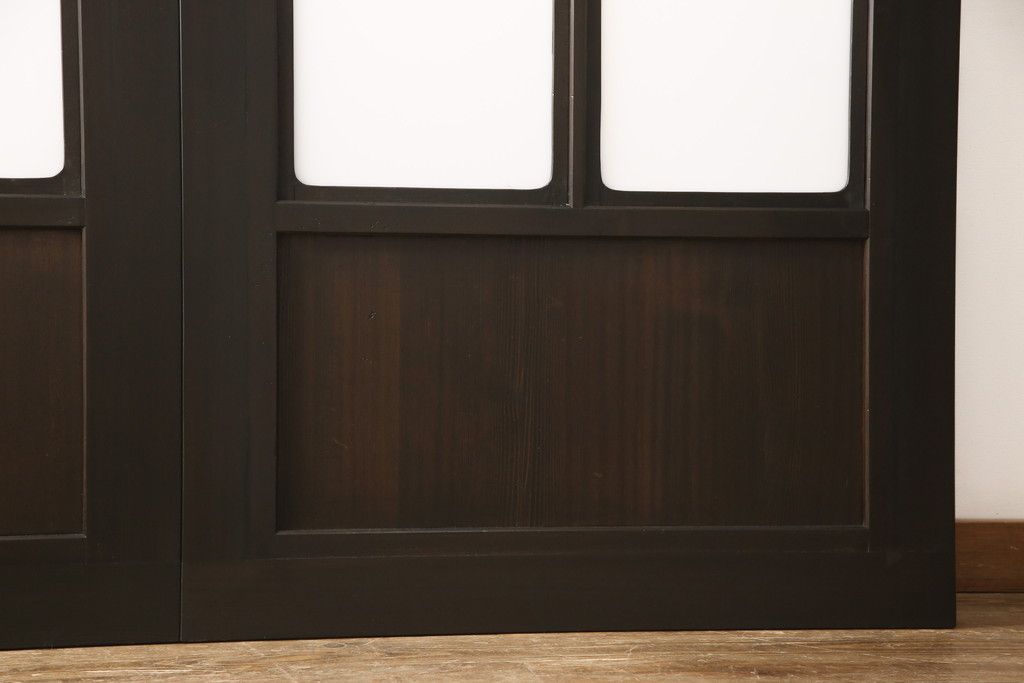 ドア・建具 > ヴィンテージの組子入りガラス戸2枚をリペア&カスタム!高さと幅をリサイズし、ガラスをアクリル板に変更。濃い茶色で着色仕上げ。(引き戸、建具、ビンテージ)