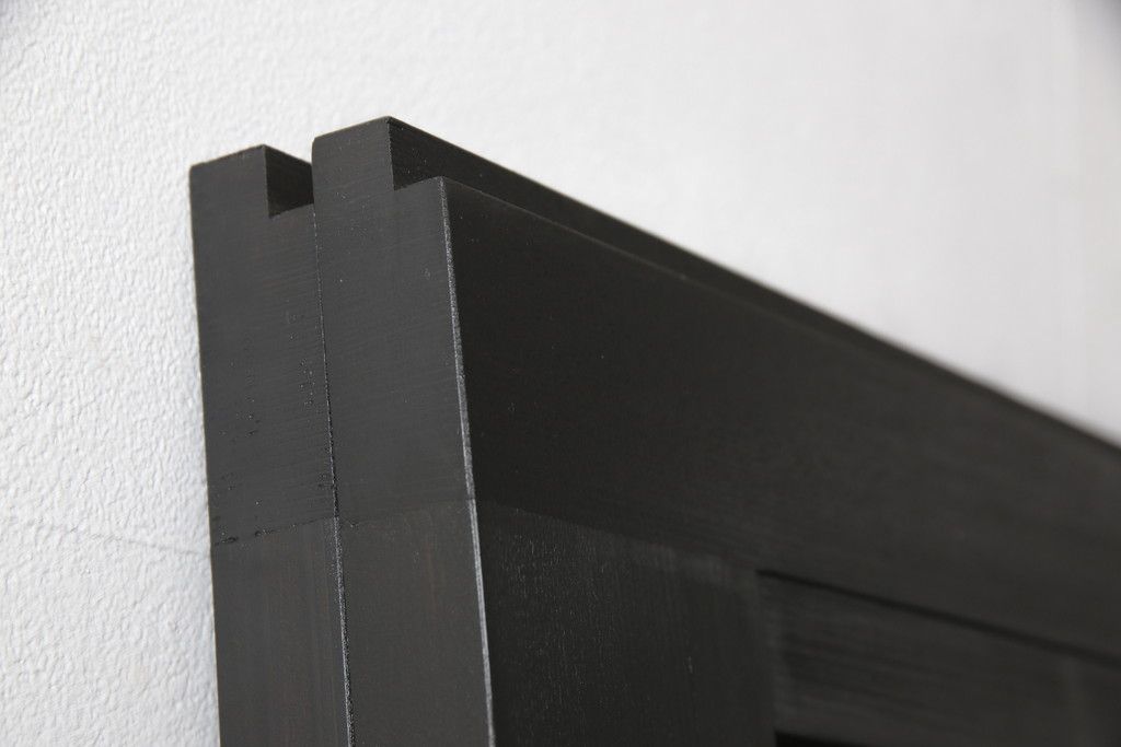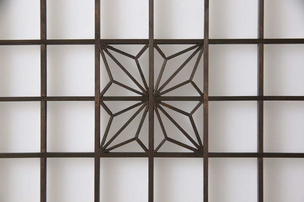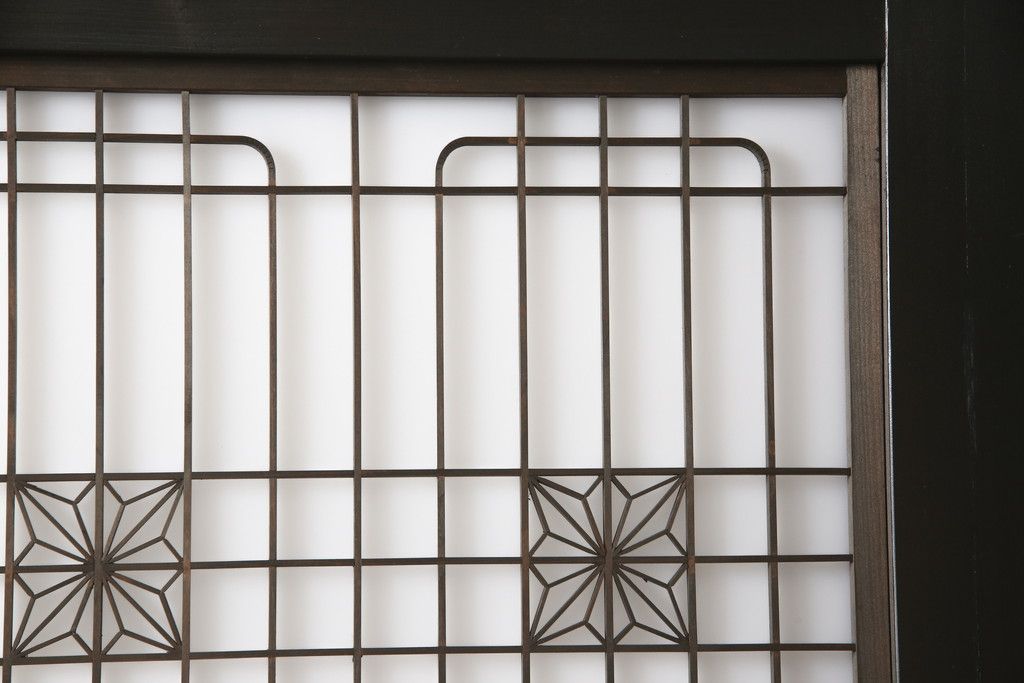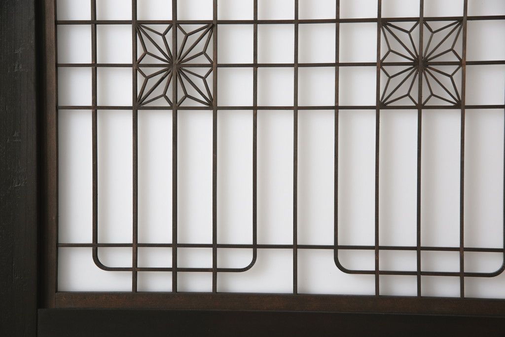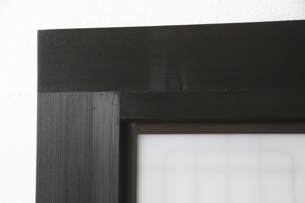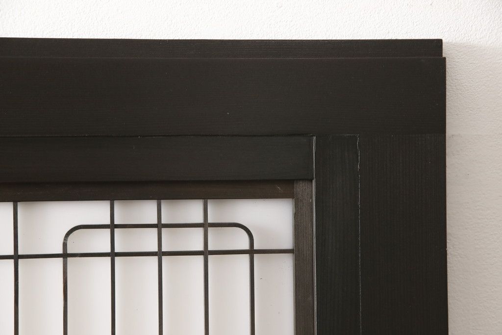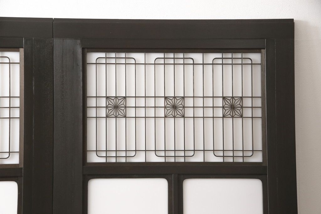 ドア・建具> 組子建具 > ヴィンテージの組子入りガラス戸2枚をリペア&カスタム!高さと幅をリサイズし、ガラスをアクリル板に変更。濃い茶色で着色仕上げ。(引き戸、建具、ビンテージ)