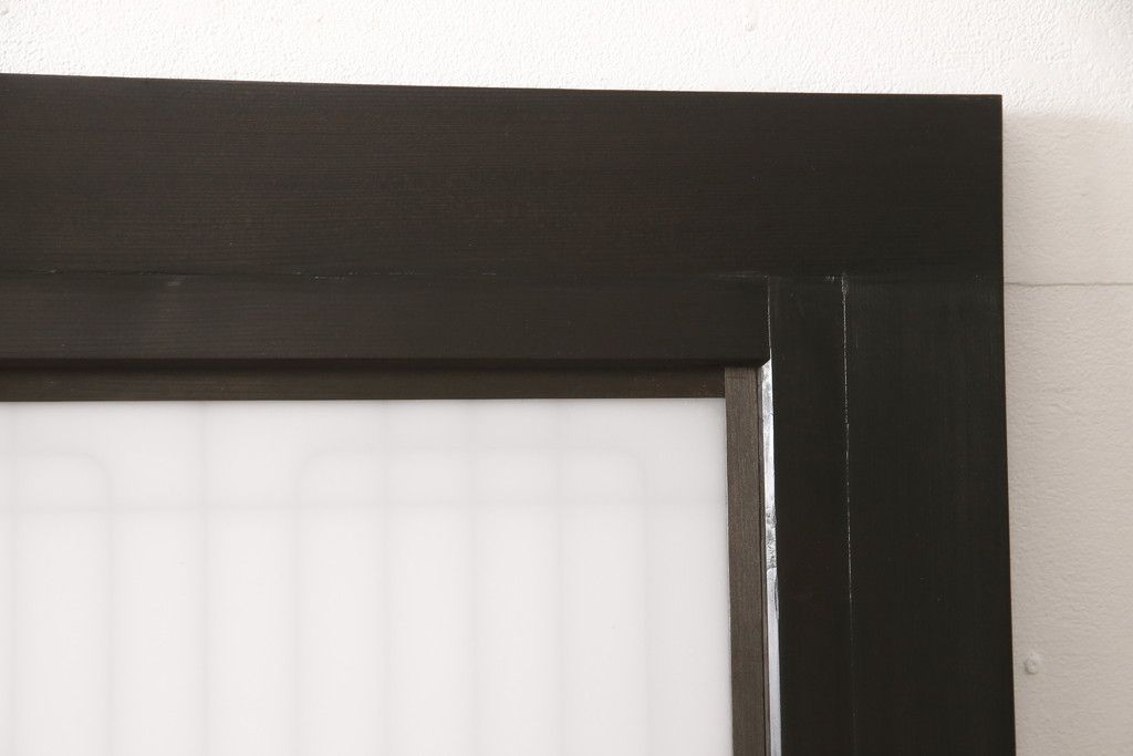 セミオーダー家具実績 > ヴィンテージの組子入りガラス戸2枚をリペア&カスタム!高さと幅をリサイズし、ガラスをアクリル板に変更。濃い茶色で着色仕上げ。(引き戸、建具、ビンテージ)