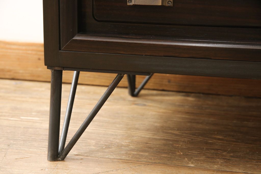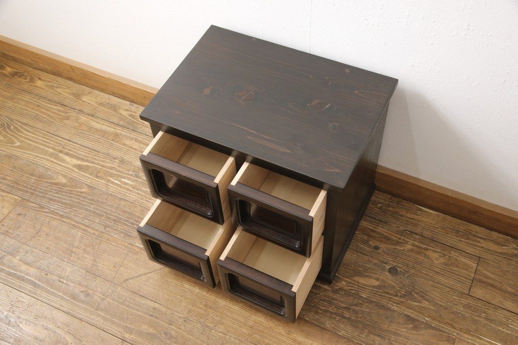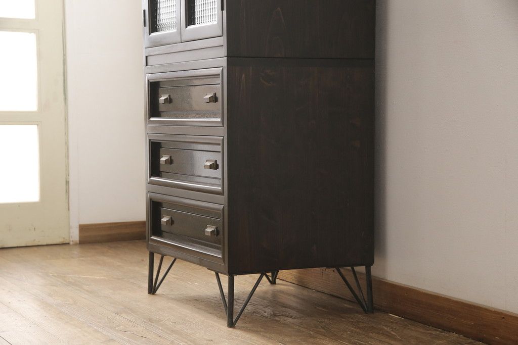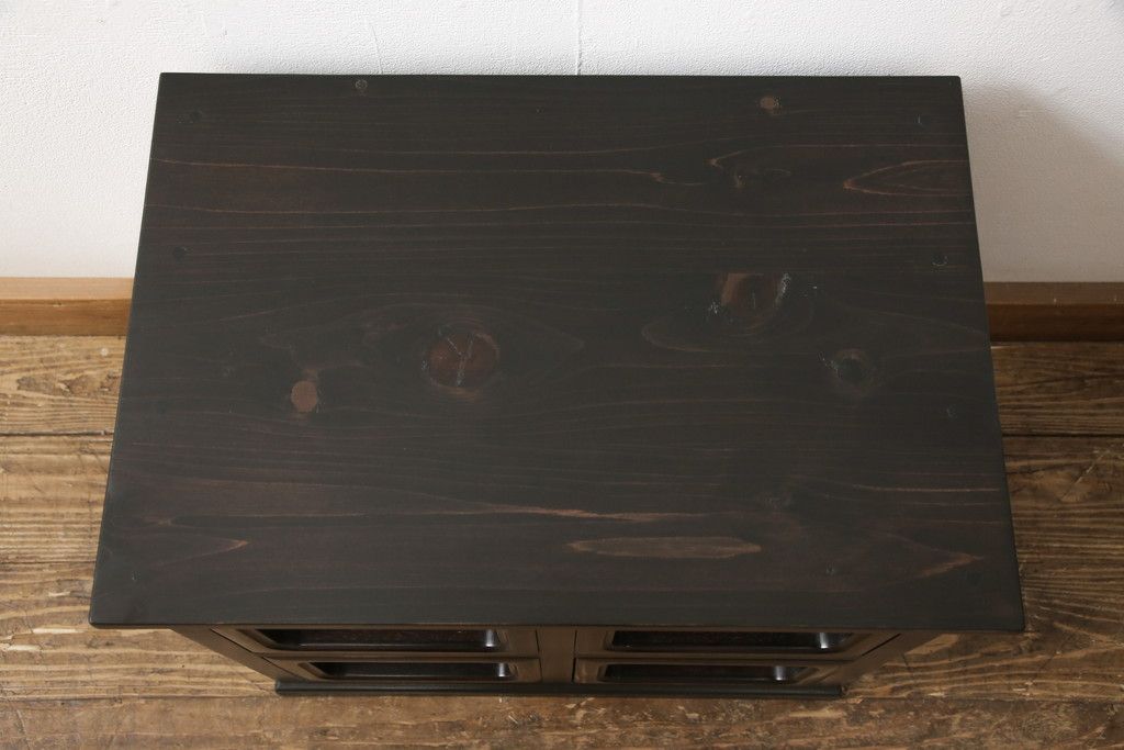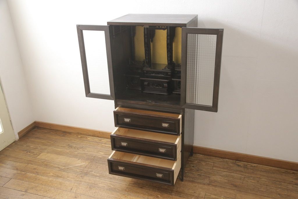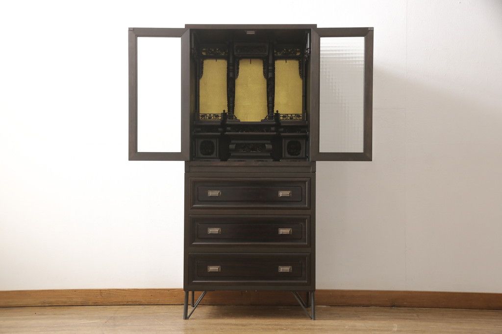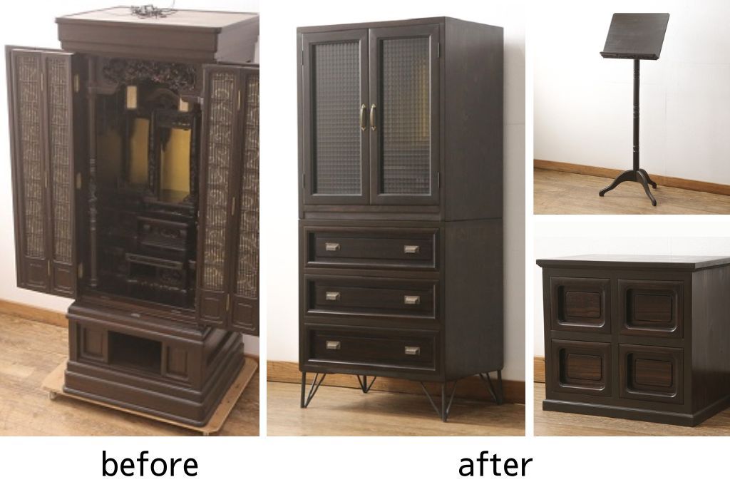 ラフジュ工房> 仏壇 > お仏壇を小型仏壇+チェスト、譜面台、小引き出しにリメイク!小型仏壇は指定サイズにリサイズし、扉にチェッカーガラスをはめ込み。チェストは鉄脚を取り付け脚付きチェストに。譜面台にはお仏壇のポール部分を活用。台板や脚はカバ材を使用にて。残った引き戸建具4枚は、小引き出しの引き出し前板に。4点とも元の色味に合わせ、黒に近い濃茶で仕上げ。