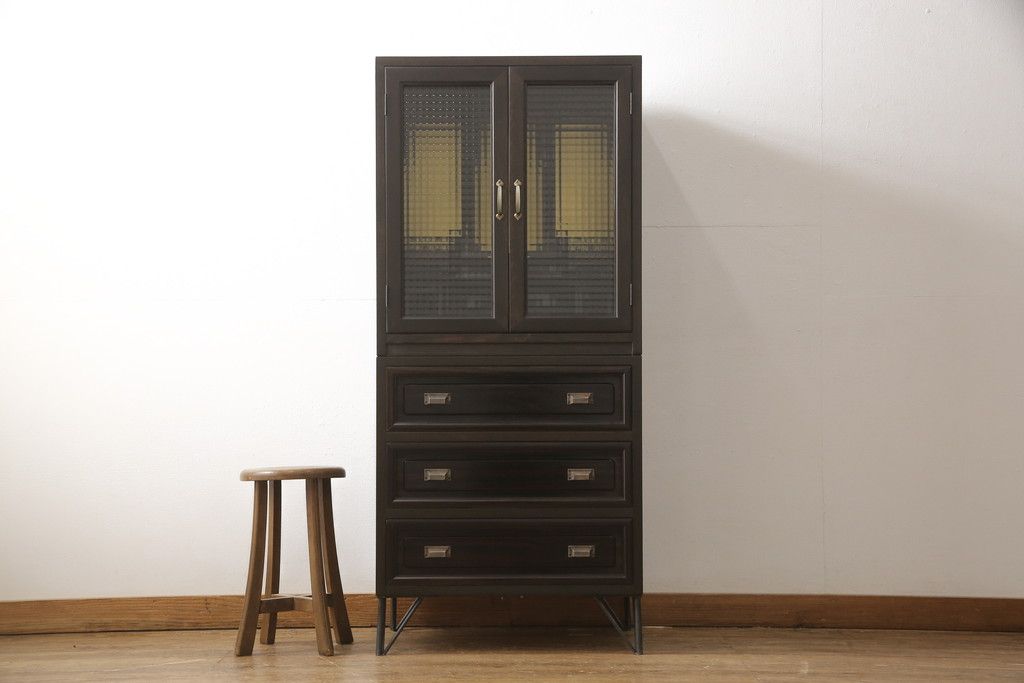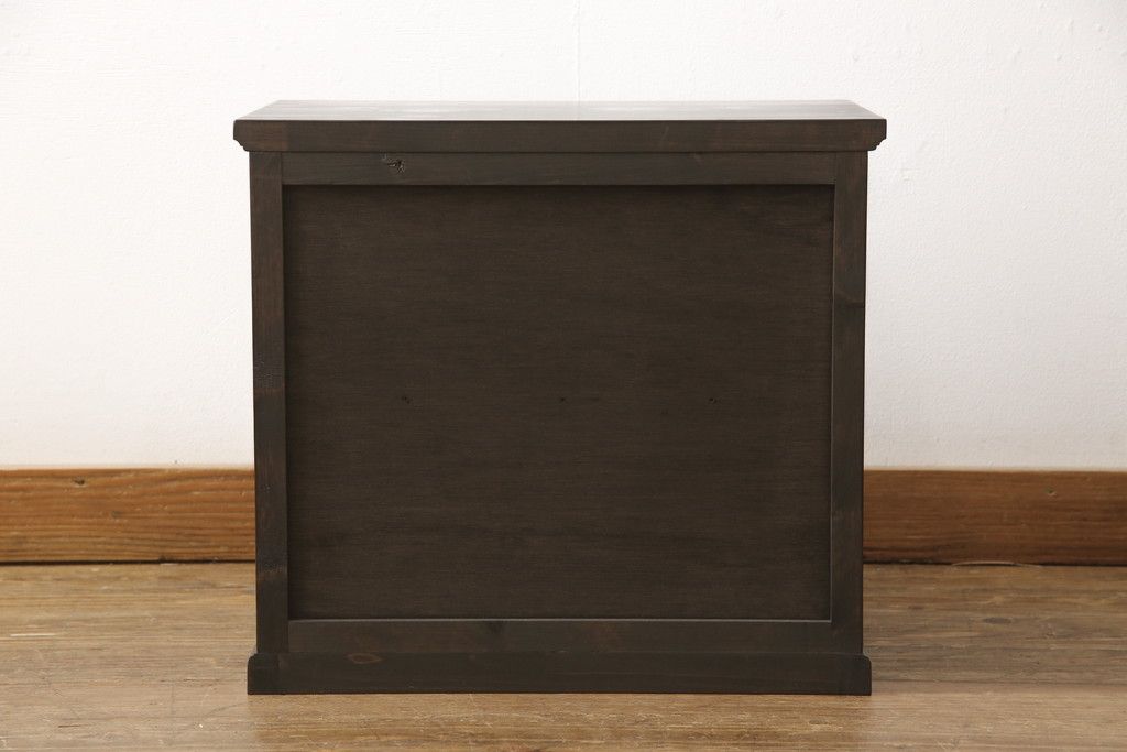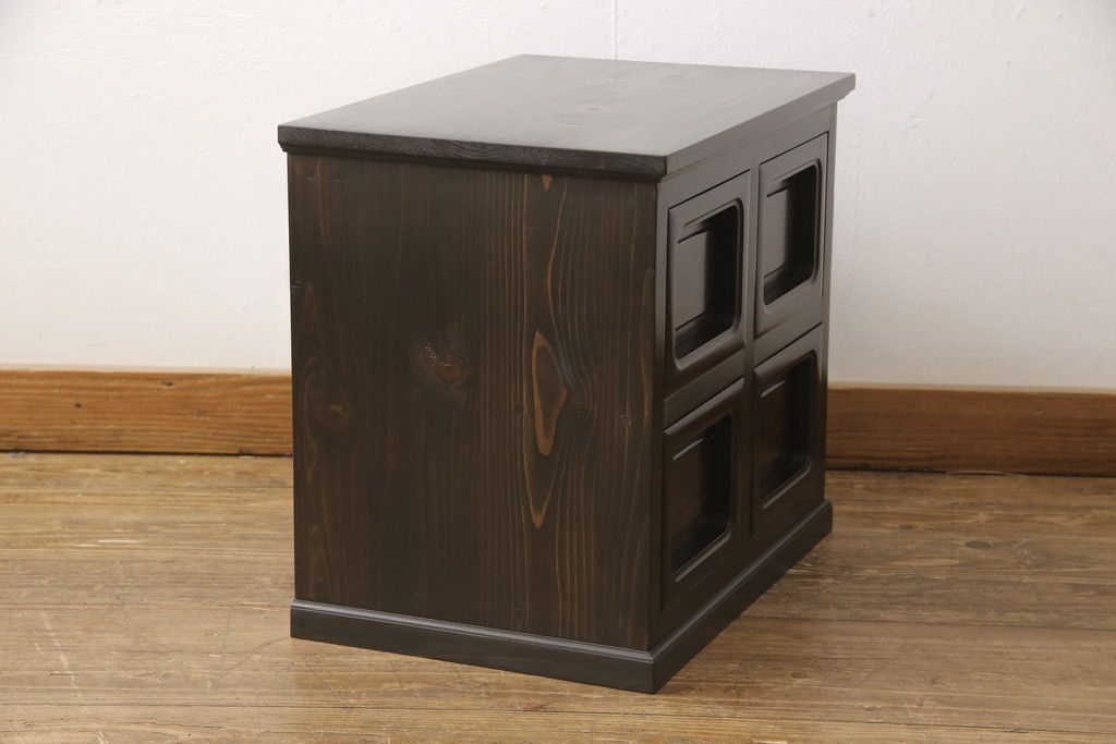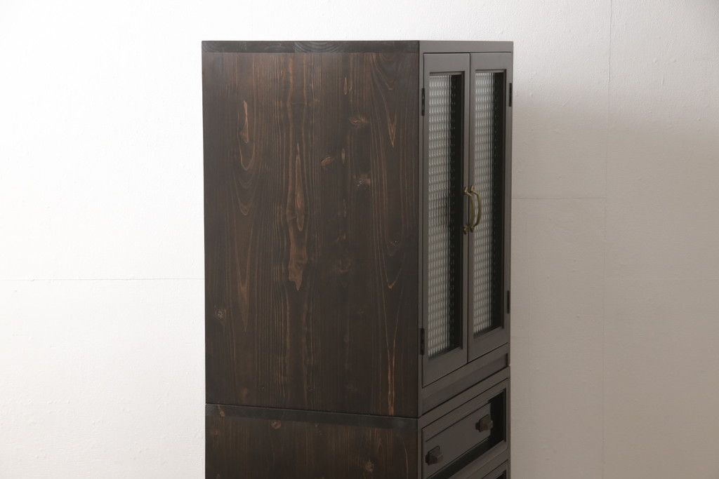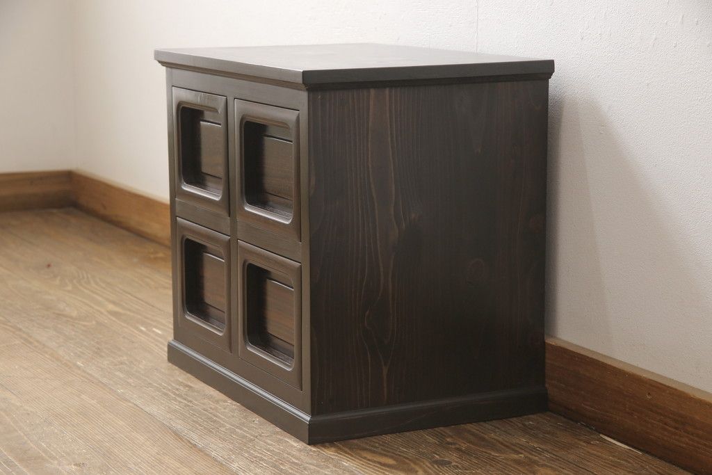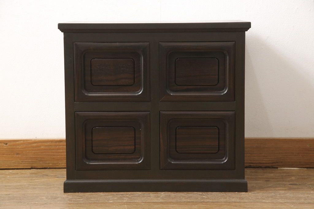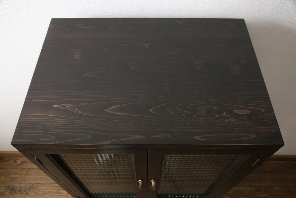 ラフジュ工房> 仏壇 > お仏壇を小型仏壇+チェスト、譜面台、小引き出しにリメイク!小型仏壇は指定サイズにリサイズし、扉にチェッカーガラスをはめ込み。チェストは鉄脚を取り付け脚付きチェストに。譜面台にはお仏壇のポール部分を活用。台板や脚はカバ材を使用にて。残った引き戸建具4枚は、小引き出しの引き出し前板に。4点とも元の色味に合わせ、黒に近い濃茶で仕上げ。