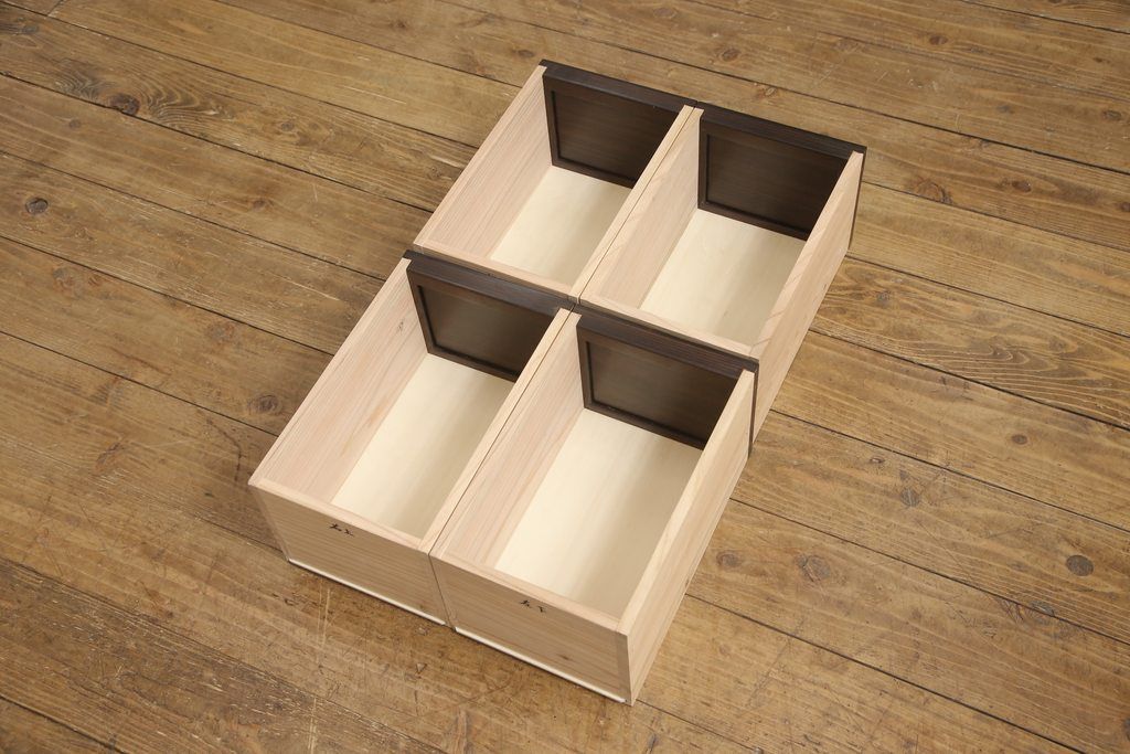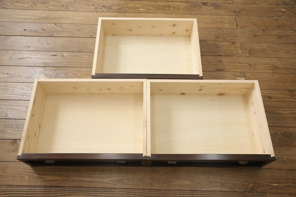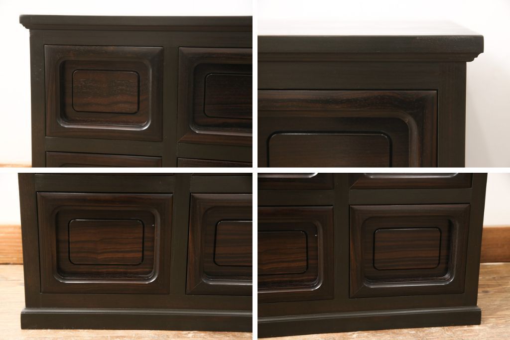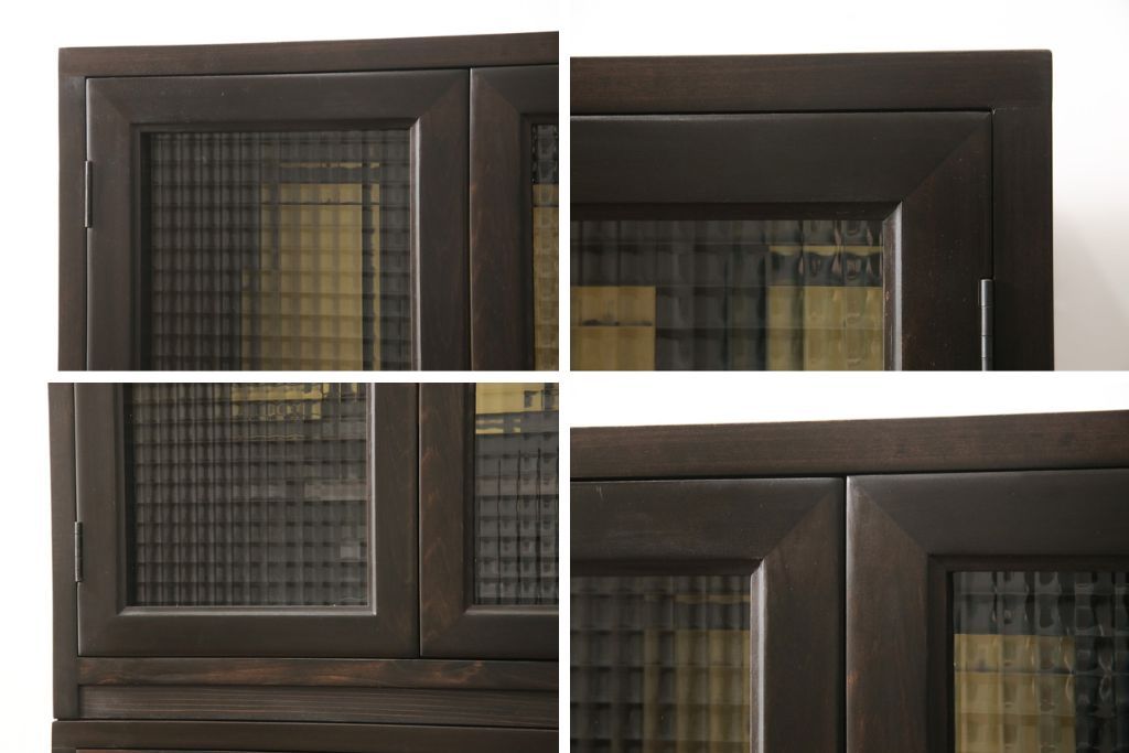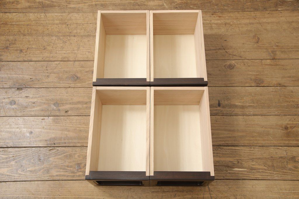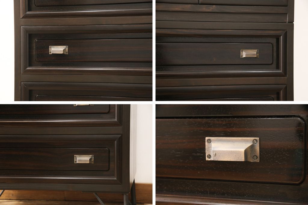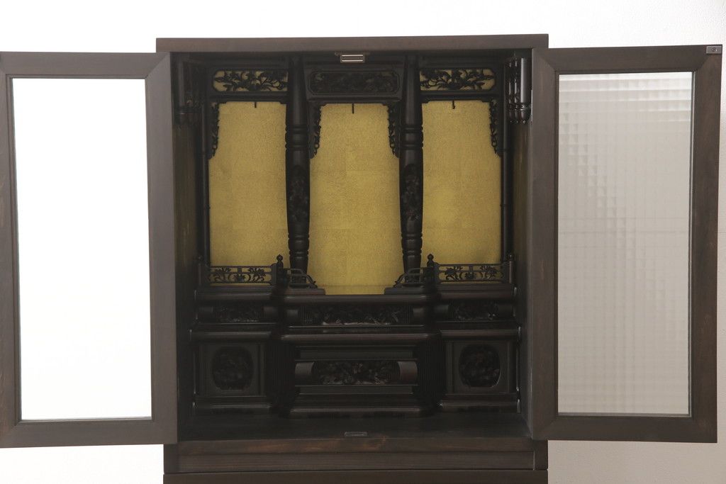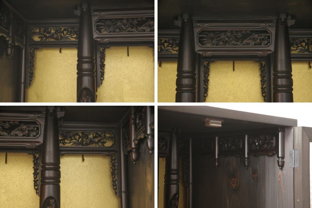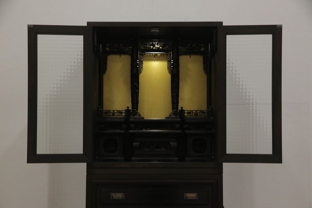 お仏壇を小型仏壇+チェスト、譜面台、小引き出しにリメイク!小型仏壇は指定サイズにリサイズし、扉にチェッカーガラスをはめ込み。チェストは鉄脚を取り付け脚付きチェストに。譜面台にはお仏壇のポール部分を活用。台板や脚はカバ材を使用にて。残った引き戸建具4枚は、小引き出しの引き出し前板に。4点とも元の色味に合わせ、黒に近い濃茶で仕上げ。