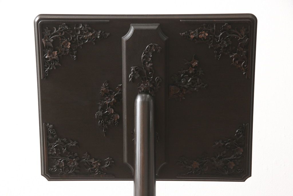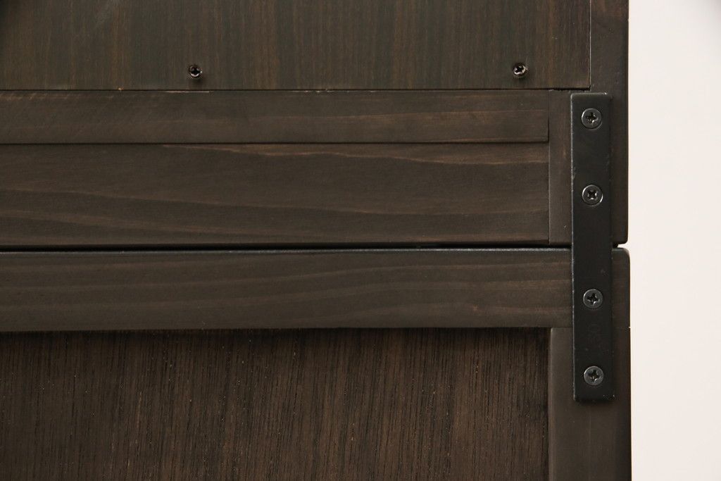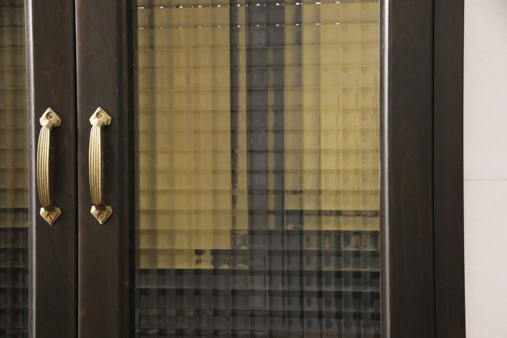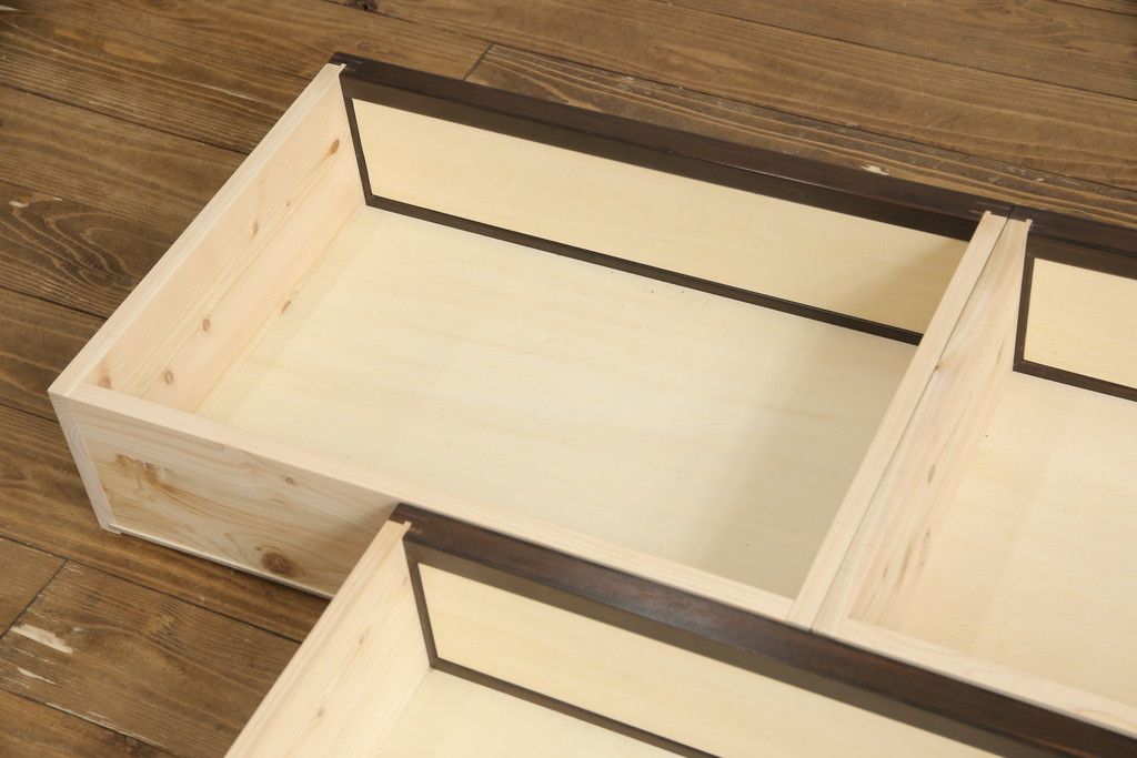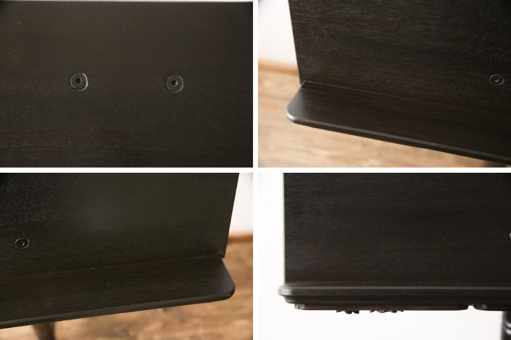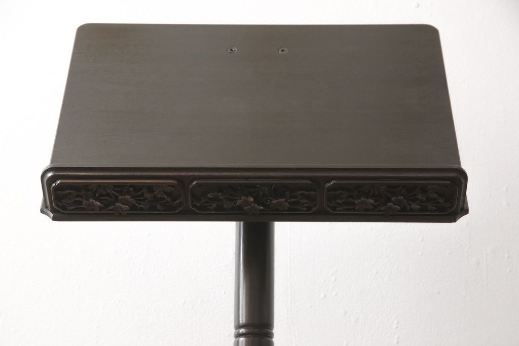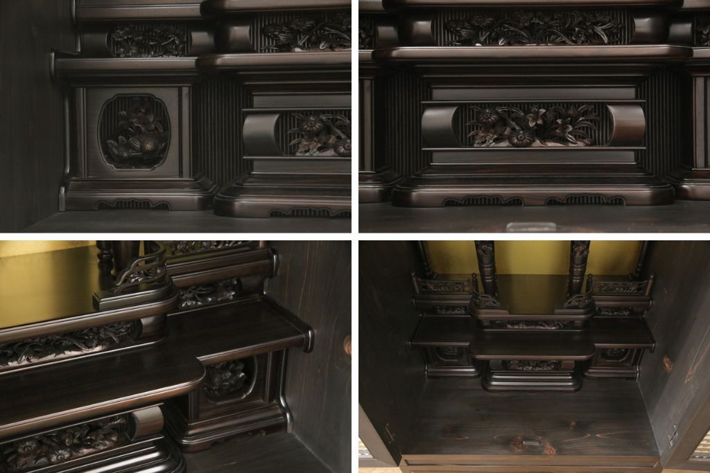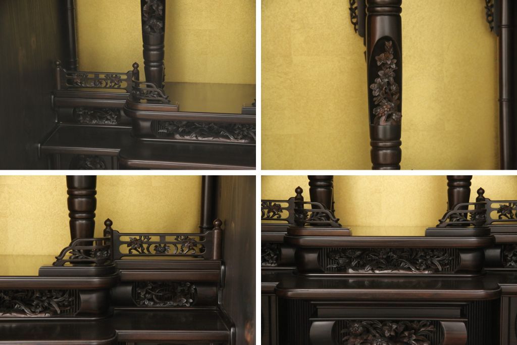 お仏壇を小型仏壇+チェスト、譜面台、小引き出しにリメイク!小型仏壇は指定サイズにリサイズし、扉にチェッカーガラスをはめ込み。チェストは鉄脚を取り付け脚付きチェストに。譜面台にはお仏壇のポール部分を活用。台板や脚はカバ材を使用にて。残った引き戸建具4枚は、小引き出しの引き出し前板に。4点とも元の色味に合わせ、黒に近い濃茶で仕上げ。
