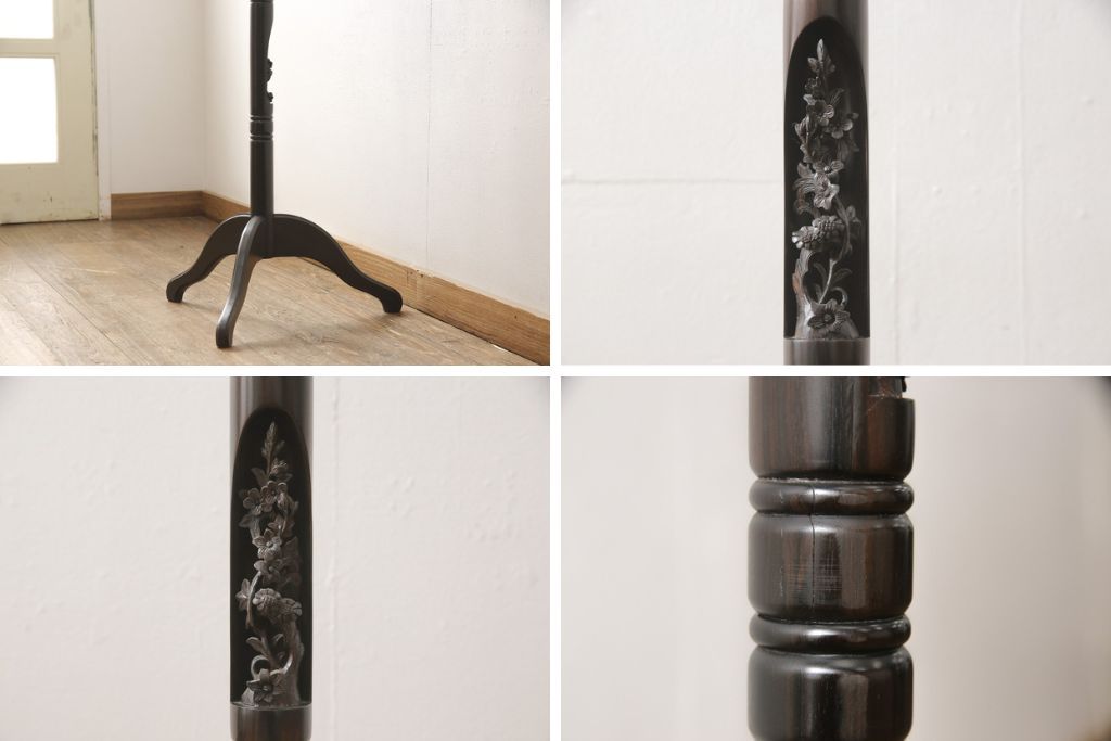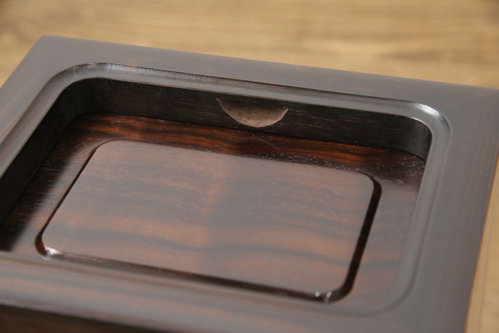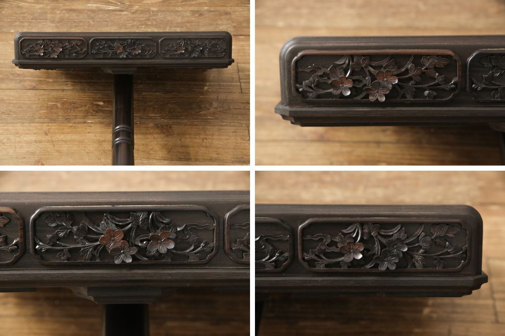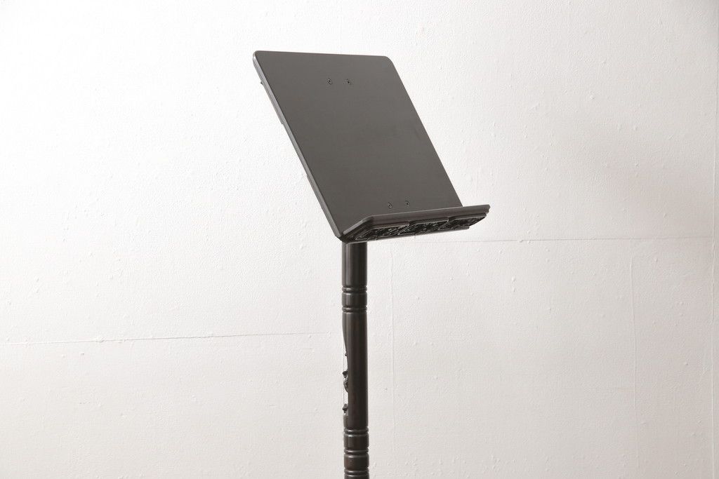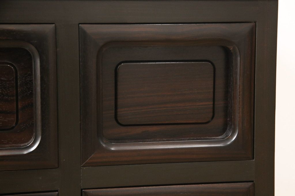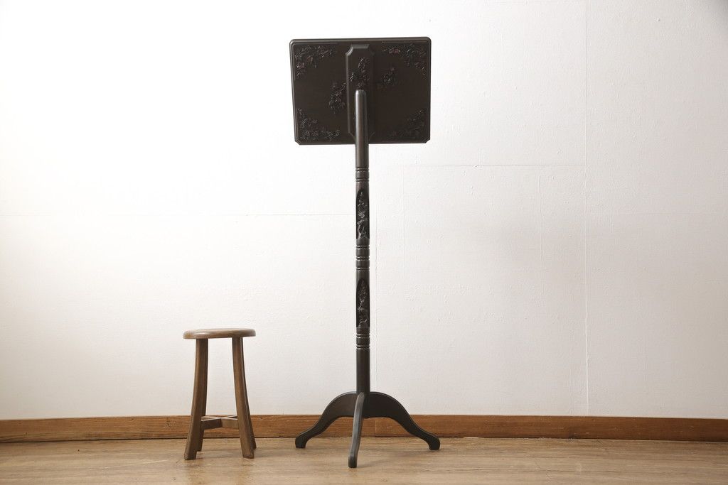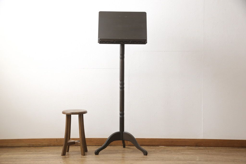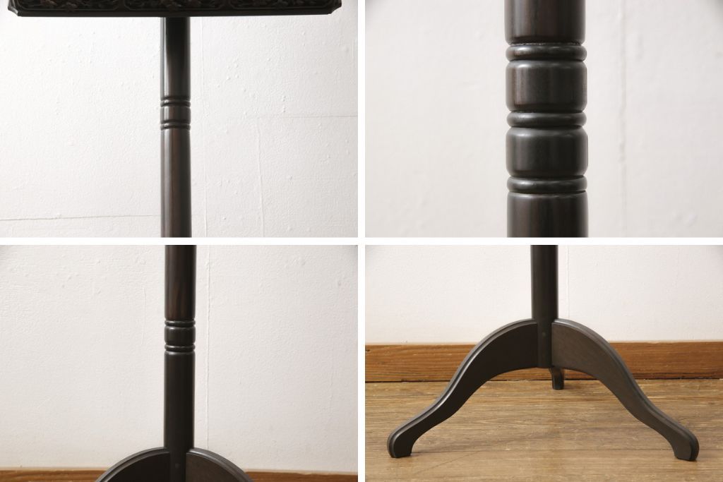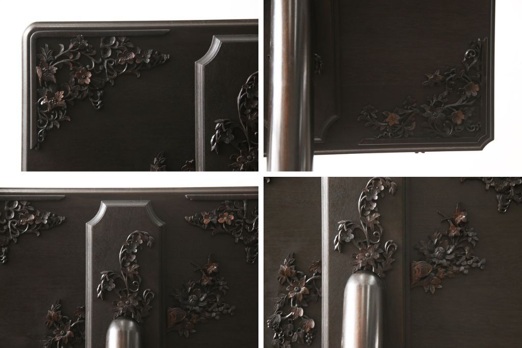お仏壇を小型仏壇+チェスト、譜面台、小引き出しにリメイク!小型仏壇は指定サイズにリサイズし、扉にチェッカーガラスをはめ込み。チェストは鉄脚を取り付け脚付きチェストに。譜面台にはお仏壇のポール部分を活用。台板や脚はカバ材を使用にて。残った引き戸建具4枚は、小引き出しの引き出し前板に。4点とも元の色味に合わせ、黒に近い濃茶で仕上げ。