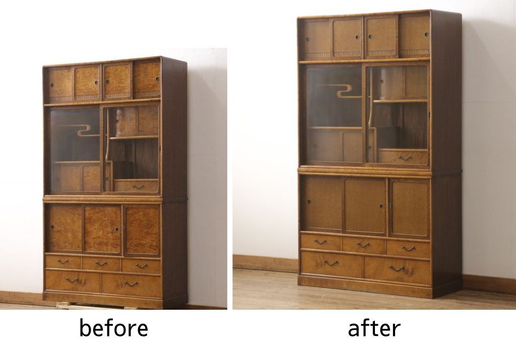 茶棚を綺麗に再生!高品質リペアを施し、元のイメージを損なわないように建具を新規作成し交換。蜜蝋ワックス仕上げに。